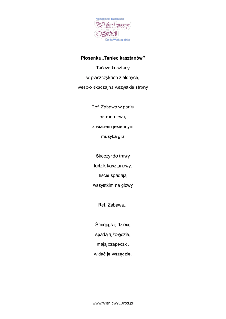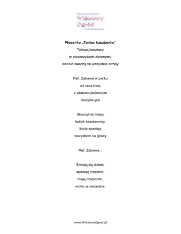 Piosenka „Taniec kasztanów” Tańczą kasztany w płaszczykach zielonych, wesoło skaczą na wszystkie strony Ref. Zabawa w parku od rana trwa, z wiatrem jesiennym muzyka gra Skoczył do trawy ludzik kasztanowy, liście spadają wszystkim na głowy Ref. Zabawa... Śmieją się dzieci, spadają żołędzie, mają czapeczki, widać je wszędzie. www.WisniowyOgrod.pl Piosenka „Warzywa” Dla Oli marchewka, buraczki dla Krzysia, pomidora chętnie zaraz zje Marysia Ref. Warzywa, warzywa w nich witamin wiele, zjadaj je codziennie, nie tylko w niedziele. A dzieci codziennie .warzywa zjadają. Warzywa są zdrowe, dużo siły dają. Ref. Warzywa... Ogórek dla Tomka, cebula dla Tadka, zieloną sałatę chętnie zje Agatka Ref. Warzywa... www.WisniowyOgrod.pl Piosenka „Jestem samodzielny” Sam ubieram buty, zapinam ubranie. Potrafię też ładnie zjadać sam śniadanie. Ref. Chociaż jestem mały, wszystko robię sam. Jeśli nie wierzycie, To pokażę wam. Po zabawie zawsze zabawki układam, bardzo nie lubię, kiedy jest bałagan Ref. Chociaż... Jestem przedszkolakiem dzielnym i wesołym, lubię moją Panią, dzieci i przedszkole Ref. Chociaż... www.WisniowyOgrod.pl Piosenka„Paluszek” Tu paluszek, tu paluszek Tu pośrodku jest mój brzuszek Tu jest raczka Tutaj druga A tu oczko sobie mruga Tu jest buzia i ząbeczki Tu wpadają cukiereczki Tu jest nóżka I tu nóżka Chodź zatańczyć jak kaczuszka Wiersz „Trzylatek” Mój mały trzylatku, usiądź z nami w kole. Pani Ci pokaże dziś twoje przedszkole. W szatni schowaj buty, a zabawki w sali, w łazience swój ręcznik, i chodź baw się z nami. www.WisniowyOgrod.pl