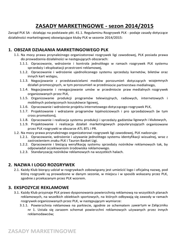 ZASADY MARKETINGOWE - sezon 2014/2015 Zarząd PLK SA - działając na podstawie pkt. 41.1. Regulaminu Rozgrywek PLK - podaje zasady dotyczące działalności marketingowej obowiązujące kluby PLK w sezonie 2014/2015: 1. OBSZAR DZIAŁANIA MARKETINGOWEGO PLK 1.1. Na mocy prawa przynależnego organizatorowi rozgrywek ligi zawodowej, PLK posiada prawa do prowadzenia działalności w następujących obszarach: 1.1.1. Opracowanie, wdrożenie i kontrola jednolitego w ramach rozgrywek PLK systemu sprzedaży i eksploatacji przestrzeni reklamowej, 1.1.2. Opracowanie i wdrożenie ujednoliconego systemu sprzedaży karnetów, biletów oraz innych kart wstępu, 1.1.3. Negocjowanie z przedstawicielami mediów porozumień dotyczących wzajemnych działań promocyjnych, w tym porozumień w przedmiocie partnerstwa medialnego, 1.1.4. Negocjowanie i renegocjowanie umów w przedmiocie praw medialnych rozgrywek organizowanych przez PLK, 1.1.5. Organizowanie produkcji programów telewizyjnych, radiowych, internetowych i mobilnych poświęconych koszykówce ligowej, 1.1.6. Opracowanie i wdrożenie projektu internetowego dotyczącego rozgrywek PLK, 1.1.7. Projektowanie i wdrażanie programów lojalnościowych i pro sprzedażowych (w tym cross promotions), 1.1.8. Opracowanie i realizacja systemu produkcji i sprzedaży gadżetów ligowych i klubowych, 1.1.9. Projektowanie i realizacja działań marketingowych popularyzujących organizowane przez PLK rozgrywki w obszarze ATL BTL i PR. 1.2. Na mocy prawa przynależnego organizatorowi rozgrywek ligi zawodowej, PLK nadzoruje: 1.2.1. Opracowanie, wdrożenie i używanie jednolitego systemu identyfikacji wizualnej, wraz z zastrzeżeniem znaku PLK i Tauron Basket Ligi. 1.2.2. Opracowanie i bieżącą weryfikację systemu sprzedaży nośników reklamowych tak, by odpowiadał oczekiwaniom środowiska reklamowego. 1.2.3. Standaryzację nośników reklamowych na wszystkich halach. 2. NAZWA I LOGO ROZGRYWEK 2.1. Każdy Klub biorący udział w rozgrywkach zobowiązany jest umieścić logo i oficjalną nazwę, pod którą rozgrywki są prowadzone w danym sezonie, w miejscu i w sposób wskazany przez PLK, zgodnie z przekazanym przez PLK wzorem. 3. EKSPOZYCJE REKLAMOWE 3.1. Każdy Klub przyznaje PLK prawo dysponowania powierzchnią reklamową na wszystkich planach reklamowych, na wszelkich obiektach sportowych, na których odbywają się zawody w ramach rozgrywek organizowanych przez PLK, w następującym wymiarze: 3.1.1. Powierzchnia reklamowa na parkiecie, zgodnie ze schematem zawartym w Załączniku nr 1. Ustala się zarazem schemat powierzchni reklamowych używanych przez innych reklamodawców; ZASADY MARKETINGOWE 3.1.2. Wskazany w Załączniku nr 1 czas obrotów band dynamicznych lub czas emisji band elektronicznych w trakcie meczu zainstalowanych w I planie reklamowym, (tj. w przestrzeni reklamowej bezpośrednio graniczącej z płytą boiska). 3.1.3. Ustawienie band dynamicznych lub elektronicznych zgodne ze schematem zawartym w Załączniku nr 1 do Regulaminu. Animacje na bandach reklamowych nie mogą zakłócać przekazu TV, poziom jaskrawości i intensywność błysków na bandach nie powinny utrudniać oglądania zawodników na boisku. 3.1.4. Wskazany w Załączniku nr 1 czas emisji spotów reklamowych w trakcie meczów na telebimach zainstalowanych w środku i na zewnątrz hal. Dotyczy hal, w których są zainstalowane telebimy. 3.1.5. Powierzchnia reklamowa na strojach meczowych, sportowych i rozgrzewkowych zawodników, zgodnie ze schematem zawartym w Załączniku nr 2. Ustala się zarazem schemat powierzchni reklamowych używanych przez innych reklamodawców oraz zobowiązuje się kluby do akceptacji z PLK projektów strojów meczowych. 3.1.6. Powierzchnia reklamowa w drugim tle (cztery banery o wymiarach 3x1 m, w kącie padania telewizyjnej kamery prowadzącej plus dwa banery po drugiej stronie boiska). Miejsca ekspozycji zostaną każdorazowo ustalone przez PLK podczas weryfikacji hali. 3.1.7. Powierzchnia reklamowa na koszach i stojakach na piłki zgodnie ze schematem zawartym z Załączniku nr 3. 3.1.8. Powierzchnia reklamowa na 2 balonach reklamowych stojących w drugim tle reklamowym, w rogach boiska za linią końcową (w uzasadnionych przypadkach dopuszcza się balon latający – sterowiec). Balon reklamowy nie może zasłaniać widoku parkietu (PLK podczas weryfikacji hal sportowych określi parametry słupów reklamowych dla każdej hali). 3.1.9. Powierzchnia reklamowa przy wszystkich wejściach do hali sportowej przeznaczonych dla publiczności. 3.1.10. Powierzchnia reklamowa w ciągach komunikacyjnych hali (stoisko reklamowe). 3.1.11. Powierzchnia reklamowa na tabliczkach fauli drużyny, markerach i tablicach informacyjnych. 3.1.12. Powierzchnia reklamowa na oznaczeniach dróg i pomieszczeń w hali. 3.1.13. Powierzchnia reklamowa na ubiorze moperów i sędziów stolikowych zgodnie ze schematem zawartym w Załączniku nr 2. 3.2. Za produkcję i dostarczenie materiałów odpowiada PLK. Za ich umieszczenie i ekspozycję odpowiada Klub. 3.3. Każdy Klub przyznaje PLK prawo dysponowania powierzchnią reklamową na wszystkich materiałach informacyjnych kierowanych do mediów, w szczególności zaś na: 3.3.1. Ściankach sponsorskich podczas konferencji prasowych (33 % powierzchni każdej klubowej ścianki sponsorskiej, zgodnie ze schematem zawartym w Załączniku nr 4). 3.3.2. Ściankach sponsorskich podczas wywiadów telewizyjnych (33 % powierzchni każdej klubowej ścianki sponsorskiej, zgodnie ze schematem zawartym w Załączniku nr 4). 3.3.3. Ściankach sponsorskich podczas wywiadów w strefie mieszanej (33 % powierzchni każdej klubowej ścianki sponsorskiej, zgodnie ze schematem zawartym w Załączniku nr 4). 3.3.4. Narzędziach promocyjnych eksponowanych w mediach, w zakresie ustalonym wspólnie przez Klub i PLK. 3.4. Powierzchnie reklamowe pozostające w dyspozycji Klubów są przedstawione w Załącznikach 1 ZASADY MARKETINGOWE 4. MATERIAŁY POLIGRAF