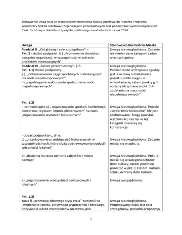 Zestawienie uwag wraz ze stanowiskiem Burmistrza Miasta Józefowa do Projektu Programu współpracy Miasta Józefowa z organizacjami pozarządowymi oraz podmiotami wymienionymi w art. 3 ust. 3 Ustawy o działalności pożytku publicznego i wolontariacie na rok 2014. Uwaga Rozdział II „Cel główny i cele szczegółowe” – Pkt. 2 ‐ dodać podpunkt. 6 ) „Promowanie dorobku i osiągnięć organizacji, w szczególności w zakresie projektów innowacyjnych”. Rozdział IV „Zakres przedmiotowy”, § 5: Pkt. 1.1) dodać podpunkty: g ) „dofinansowanie zajęć sportowych i rekreacyjnych dla osób niepełnosprawnych” h) „zapobieganie wykluczeniu społecznemu osób niepełnosprawnych”. Pkt. 1.2) ‐ zamienić ppkt a) „ organizowanie spotkań, konferencji, koncertów, wystaw i imprez plenerowych” na zapis „organizowanie wydarzeń kulturalnych” ‐ dodać podpunkty c, d i e: c) „organizowanie przedsięwzięć historycznych w szczególności tych, które służą podtrzymywaniu tradycji i tożsamości lokalnej” d) „działania na rzecz ochrony zabytków i miejsc pamięci” e) „organizowanie uroczystości państwowych i lokalnych” Pkt. 1.3) zapis f) „promocję zdrowego stylu życia” zamienić na „wspieranie sportu, aktywnego wypoczynku i zdrowego odżywiania wśród mieszkańców Józefowa jako 1 Stanowisko Burmistrza Miasta Uwaga nieuwzględniona. Zadanie nie mieści się w kategorii zadań własnych gminy. Uwaga nieuwzględniona. Podział zadań w Projekcie zgodny jest z ustawą o działalności pożytku publicznego i o wolontariacie, zatem punkty g i h zostaną utrzymane w pkt. 1.4 „działania na rzecz osób niepełnosprawnych” . Uwaga nieuwzględniona. Pojęcie „wydarzenie kulturalne” nie jest zdefiniowane. Mogą powstać wątpliwości, czy np. w tej kategorii mieszczą się konferencje. Uwaga nieuwzględniona. Zadanie mieści się w ppkt. a. Uwaga nieuwzględniona. Ppkt. d) mieści się w kategorii ochrony dóbr kultury, zatem powinien pozostać w pkt. 1.10) dot. kultury, sztuki, ochrony dóbr kultury. Uwaga uwzględniona. Uwaga nieuwzględniona. Proponowany zapis jest zbyt szczegółowy, ponadto propozycja profilaktyki zdrowia”. Pkt. 1.4). „działania na rzecz osób niepełnosprawnych poprzez” – usunąć Pkt. 1.5) ‐ w ppkt. a) „przeciwdziałanie wykluczeniu społecznemu oraz zwiększenie uczestnictwa w życiu społecznym seniorów poprzez m. in. szkolenia, warsztaty, treningi i seminaria usunąć „poprzez m. in. szkolenia, warsztaty, treningi i seminaria” ‐ usunąć ppkt. b) i c) b) organizowanie spotkań integracyjnych i okolicznościowych oraz wieczorów wspomnień, poświęconych pamięci i tradycji kulturowej, c) wspieranie realizacji programów zagospodarowania czasu wolnego dla seniorów z terenu Miasta Pkt. 1.6) w ppkt a) zapis „promocję firm” zamienić na „promocję instytucji wspierających działania organizacji pozarządowych w ramach realizacji zadań publicznych (np. sponsoring)” Pkt. 1.7) usunąć ppkt b) „wydawanie pisma lokalnego będącego źródłem informacji i integrujące społeczeństwo wokół spraw lokalnych i idei samorządności” Pkt.1.8) usunąć ppkt. b) „organizowanie zajęć pozaszkolnych, pozalekcyjnych i wychowawczych” Pkt.1.9) ‐ zmienić brzmienie nazwy zadania poprzez dodanie ”turystyki” i „dorosłych”. Proponowany zapis – „turystyki i krajoznawstwa oraz wypoczynku dzieci, młodzieży i dorosłych” 2 jest uwzględniona w pkt. 1.9, 1.11. Uwaga nieuwzględniona. Podział zadań w Projekcie zgodny jest z ustawą o działalności pożytku publicznego i o wolontariacie. Uwaga nieuwzględniona. Pozostawienie przykładów w ppkt. a i pkt. b i c ułatwi możliwość szerszego skorzystania ze wsparcia Miasta (emeryci stanowią ok. 20 %). Uwaga nieuwzględniona. Należy promować różne firmy przyczyniające się do rozwoju gospodarczego Miasta a nie tylko wspierające organizacje pozarządowe. Uwaga uwzględniona. Uwaga uwzględniona. Uwaga nieuwzględniona. Planowane zadania nie obejmują turystyki. Ideą Miasta jest wspieranie przede wszystkim dzieci i młodzieży a nie dorosłych ‐ dodanie ppkt. d) „Wspieranie działań sportowych i kulturalnych promujących miasto na arenie ponad gminnej” ‐ dodanie ppkt. e) „zaprojektowanie szlaków turystycznych oraz oznakowanie i odnowienie istniejących szlaków turystycznych” ‐ dodanie ppkt. f) „zagospodarowania brzegów Świdra” Pkt. 1.10) usunąć Pkt. 1.11) w ppkt. a) „prowadzenie zajęć sportowych w różnych dziedzinach, uzależnionych od potrzeb” usunąć „uzależnionych od potrzeb” Pkt. 1.13) ‐ w ppkt. b) „organizowanie selektywnej zbiórki odpadów” zastąpienie słowa „organizowanie” na „promowanie” ‐ rozszerzenie ppkt. d). Zastąpienie zapisu „pielęgnację pomników przyrody” na zapis „pielęgnację i promocję pomników przyrody oraz terenów chronionej przyrody” ‐ rozszerzenie ppkt. e) „wspieranie działań na rzecz bezdomnych zwierząt poprzez dodanie słowa „dzikich i” 3 Uwaga nieuwzględniona. Wspieranie działań sportowych ujęte jest w ppkt. 11 d). Uwaga nieuwzględniona ze względu na ograniczony budżet Miasta. j.w. Zadanie wymaga zaangażowania ponadgminnego, np. powiatu Uwaga nieuwzględniona. Podział zadań w Projekcie zgodny jest z ustawą o działalności pożytku publicznego i o wolontariacie. Ppkt. e) został przeniesiony do pkt. 1.2. Uwaga uwzględniona. Uwaga częściowo uwzględniona. Nowe brzmienie zapisu to „organizowanie i promowanie (…)” Uwaga nieuwzględniona ze względu na brak środków na realizację. Uwaga nieuwzględniona. Działania na rzecz dzikich zwierząt nie są zadaniami gminy lecz kół łowieckich. Uwaga nieuwzględniona. Pkt. 1.14. usunąć ppkt. b) „partnerstwo gmin” Rozdział V. „Formy współpracy” ‐w ppkt. 3.5) „umożliwienia organizacjom realizacji przedsięwzięć na terenie miejskich obiektów