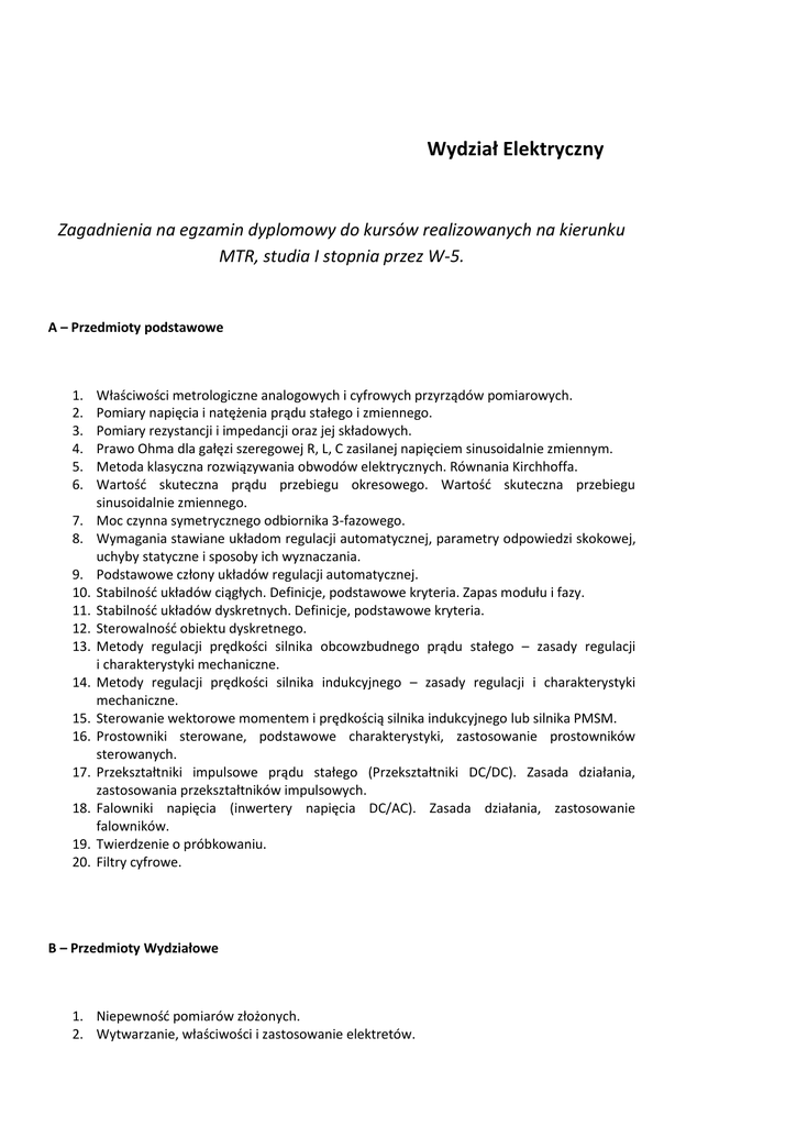 Wydział Elektryczny Zagadnienia na egzamin dyplomowy do kursów realizowanych na kierunku MTR, studia I stopnia przez W-5. A – Przedmioty podstawowe 1. 2. 3. 4. 5. 6. 7. 8. 9. 10. 11. 12. 13. 14. 15. 16. 17. 18. 19. 20. Właściwości metrologiczne analogowych i cyfrowych przyrządów pomiarowych. Pomiary napięcia i natężenia prądu stałego i zmiennego. Pomiary rezystancji i impedancji oraz jej składowych. Prawo Ohma dla gałęzi szeregowej R, L, C zasilanej napięciem sinusoidalnie zmiennym. Metoda klasyczna rozwiązywania obwodów elektrycznych. Równania Kirchhoffa. Wartość skuteczna prądu przebiegu okresowego. Wartość skuteczna przebiegu sinusoidalnie zmiennego. Moc czynna symetrycznego odbiornika 3-fazowego. Wymagania stawiane układom regulacji automatycznej, parametry odpowiedzi skokowej, uchyby statyczne i sposoby ich wyznaczania. Podstawowe człony układów regulacji automatycznej. Stabilność układów ciągłych. Definicje, podstawowe kryteria. Zapas modułu i fazy. Stabilność układów dyskretnych. Definicje, podstawowe kryteria. Sterowalność obiektu dyskretnego. Metody regulacji prędkości silnika obcowzbudnego prądu stałego – zasady regulacji i charakterystyki mechaniczne. Metody regulacji prędkości silnika indukcyjnego – zasady regulacji i charakterystyki mechaniczne. Sterowanie wektorowe momentem i prędkością silnika indukcyjnego lub silnika PMSM. Prostowniki sterowane, podstawowe charakterystyki, zastosowanie prostowników sterowanych. Przekształtniki impulsowe prądu stałego (Przekształtniki DC/DC). Zasada działania, zastosowania przekształtników impulsowych. Falowniki napięcia (inwertery napięcia DC/AC). Zasada działania, zastosowanie falowników. Twierdzenie o próbkowaniu. Filtry cyfrowe. B – Przedmioty Wydziałowe 1. Niepewność pomiarów złożonych. 2. Wytwarzanie, właściwości i zastosowanie elektretów. 3. Materiały inteligentne (smart materials): podział, właściwości, znaczenie w nauce i technice. 4. Budowa, zasada działania, ograniczenia sterowników mikroprocesorowych. 5. Podstawowe układy wejść i wyjść mikroprocesora. 6. Budowa, zasada działania sterowników PLC. 7. Języki programowania sterowników PLC. 8. Właściwości statyczne i dynamiczne czujników pomiarowych. 9. Czujniki temperatury. 10. Zabezpieczenia silników - rodzaje i zasady doboru. 11. Sposoby regulacji prędkości obrotowej silników. 12. Szybkie prototypowanie (ang. Rapid Prototyping). 13. Ogólne cechy i właściwości programów wspomagających projektowanie i prototypowanie systemów sterowania. 14. Metody adresowania pamięci na przykładzie dowolnego mikroprocesora. 15. Modulacja PWM oraz sposoby jej realizowania za pomocą mikrokontrolerów 16. Rozwiązania konstrukcyjne wyrzutni magnetronowych. 17. Metody pomiaru próżni wstępnej i wysokiej. 18. Klasyfikacje systemów automatyki budynkowej. Pojęcie inteligentnej instalacji i inteligentnego budynku. 19. System KNX – zasady topologii i logiki działania. 20. Podział urządzeń i struktura budowy urządzeń magistralnych w systemach KNX i LCN. Wydział Mechaniczny Zagadnienia na egzamin dyplomowy do kursów realizowanych na kierunku MTR, studia I stopnia przez W-10. A – Przedmioty podstawowe 1. 2. 3. 4. 5. 6. 7. 8. 9. 10. 11. 12. Moment siły względem punktu , moment główny, moment gnący, wyznaczanie. Warunki równowagi dla układów statycznie wyznaczalnych. Środek masy, moment statyczny, moment bezwładności ,momenty dewiacji. Ruch punktu materialnego Przyspieszenie styczne i normalne. Zasada zachowania energii mechanicznej. Zasada zachowania pędu oraz krętu Warunek wytrzymałości i sztywności na przykładzie ściskania lub skręcania, zjawisko utraty stateczności. Materiały konstrukcyjne ciągliwe i kruche. Współczynnik bezpieczeństwa, czynniki wpływające na jego wartości. Stan naprężenia w cienkościennym zbiorniku cylindrycznym obciążonym ciśnieniem wewnętrznym. Hipotezy wytrzymałościowe 13. Stałe sprężystości materiału izotropowego. Wyznaczanie doświadczalnie współczynnik Poissona i modułu Younga 14. Zjawisko zmęczenia materiałów konstrukcyjnych. 15. Charakterystyka tworzyw sztucznych 16. Charakterystyka materiałów ceramicznych 17. Charakterystyka materiałów kompozytowych 18. Cechy wiązania metalicznego 19. Obróbka cieplna stali 20. Podział stali ze względu na zastosowania 21. Podział i przykłady zastosowań stopów miedzi i stopów aluminium B – Przedmioty wydziałowe 1. Dokładność geometryczna, odchyłki, tolerancje wykonania części maszyn, oznaczenia na rysunkach 2. Pasowanie, rodzaje 3. Cechy metrologiczne narzędzi pomiarowych, grupy przyczyn powstawania błędów pomiaru 4. Symbole tolerancji kształtu oraz położenia 5. Najczęściej stosowane parametry chropowatości powierzchni. 6. Odlewanie , rodzaje 7. Spawanie łukowe, metody, zastosowanie 8. Zgrzewanie materiałów , metody, zastosowanie. 9. Lutowanie , metody, zastosowanie 10. Obróbka ubytkowa, rodzaje 11. Sposoby wykonywania gwintów. 12. Zasady obliczenia połączenia wpustowego dla wału o zadanej średnicy, przenoszącego ustalony moment obrotowy. 13. Zasady obliczeń mocy mechanicznej aktora, wykonującego ruch liniowy ze znaną prędkością przy ustalonej sile. 14. Podział łożysk , ważniejsze ich cechy. 15. Rodzaje przekładni cięgnowych, ważniejsze ich cechy. 16. Koło zębate, cechy geometryczne. 17. Synteza geometryczna układu korbowo-wahaczowego 18. Lepkości fizyczne i porównawcze cieczy hydraulicznych 19. Zawory różnicowe ciśnieniowe 20. Regulatory przepływu - zasada działania i zastosowanie Wydział Elektroniki Mikrosystemów i Fotoniki Zagadnienia na egzamin dyplomowy do kursów realizowanych na kierunku MTR, studia I stopnia przez W-12. A – Przedmioty podstawowe 1. Zjawisko korozji; definicja i podział. 2. Czynniki wpływające na szybkość reakcji. 3. Paradygmaty (zbiór najważniejszych założeń, sposób rozwi