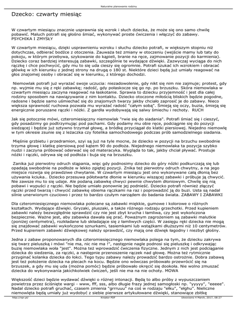 Naturalne planowanie rodziny Dzecko: czwarty miesiąc W czwartym miesiącu znacznie usprawnia się wzrok i słuch dziecka, że może się ono samo chwilę pobawić. Maluch potrafi się głośno śmiać, wykonywać proste ćwiczenia i włączyć do zabawy. PSYCHIKA I ZMYSŁY W czwartym miesiącu, dzięki usprawnieniu wzroku i słuchu dziecko potrafi, w większym stopniu niż dotychczas, odbierać bodźce z otoczenia. Zauważa też zmiany w otoczeniu (wejście mamy lub taty do pokoju, w którym przebywa, szykowanie do kąpieli, branie na ręce, zajmowanie pozycji do karmienia). Dziecko coraz bardziej interesują zabawki, szczególnie te wydające dźwięki. Zazwyczaj wyciąga do nich rączkę i chce pochwycić, gdy mu to się uda cieszy się ogromnie. Potrafi szukać ich wzrokiem i obracać główkę w ich kierunku z jednej strony na drugą o 180 st. Niektóre dzieci będą już umiały reagować na głos znajomej osoby i obracać się w kierunku, z którego dochodzi. Niemowlak potrafi już wyrażać swoje uczucia: niezadowolenie, gdy nikt się nim nie zajmuje; protest, gdy np. wyjmie mu się z ręki zabawkę; radość, gdy połaskocze się go np. po brzuszku. Skóra niemowlaka w czwartym miesiącu zaczyna reagować na łaskotanie. Sprawia to dziecku przyjemność i jest dla całej rodziny sposobem na nawiązywanie z nim kontaktu. Dziecko otoczone miłością bliskich będzie pogodne, radosne i będzie samo uśmiechać się do znajomych twarzy jakby chciało zaprosić je do zabawy. Nieco większa sprawność ruchowa pozwala mu wyrażać radość "całym sobą". Śmieją się oczy, buzia, śmieją się energicznie poruszane rączki i nóżki. Z gardła wydobywają się salwy śmiechu i rechoty. RUCH Jak się potocznie mówi, czteromiesięczny niemowlak "rwie się do siadania". Potrafi śmiać się i cieszyć, gdy posadzimy go podtrzymując pod pachami. Gdy podamy mu obie ręce, podciągnie się do pozycji siedzącej i będzie już sztywno trzymał głowę, a bródkę przyciągał do klatki piersiowej. Niejedno niemowlę w tym okresie zsunie się z leżaczka czy fotelika samochodowego podczas prób samodzielnego siadania. Mięśnie grzbietu i przedramion, szyi są już na tyle mocne, że dziecko w pozycji na brzuchu swobodnie trzyma głowę i klatkę piersiową pod kątem 90 do podłoża. Niejednego niemowlaka ta pozycja szybko nudzi i zaczyna próbować oderwać się od materacyka. Wygląda to tak, jakby chciał pływać. Prostuje nóżki i rączki, odrywa się od podłoża i buja się na brzuszku. Zanika już pierwotny odruch stąpania, więc gdy podnosimy dziecko do góry nóżki podkurczają się lub opadają swobodnie na podłoże w lekko zgiętej pozycji. Znika też pierwotny odruch chwytny, a na jego miejsce rozwija się prawdziwe chwytanie. W czwartym miesiącu jest ono wykonywane całą dłonią bez używania kciuka.. Dziecko przesuwa półotwarte dłonie w kierunku wiszącej zabawki i próbuje ją chwycić. Nie zawsze mu to się udaje. Ale podaną zabawkę chwyci pewnie chwytem dłoniowym. Chwilę się nią pobawi i wypuści z rączki. Nie będzie umiało ponownie jej podnieść. Dziecko potrafi również złączyć rączki przed twarzą i chwycić zabawkę obiema rączkami na raz i poprowadzić ją do buzi. Usta są nadal silnie unerwionym czuciowo i przez to bardzo czułym narządem do badania świata. ZABAWY I ZABAWKI Dla czteromiesięcznego niemowlaka polecane są zabawki miękkie, gumowe i kolorowe o różnych kształtach. Wydające dźwięki. Gryzaki, pluszaki, a także różnego rodzaju grzechotki. Przed kupieniem zabawki należy bezwzględnie sprawdzić czy nie jest zbyt krucha i łamliwa, czy jest wykończona bezpiecznie. Ważne jest, aby zabawka dawała się prać. Poważnym zagrożeniem są zabawki malutkie (poniżej centymetra), rozkładane lub składające się z łamliwych części. W zasięgu ręki dziecka nie mogą się znajdować zabawki wykończone sznurkami, tasiemkami lub wstążkami dłuższymi niż 10 centymetrów. Przed kupieniem zabawki dźwiękowej należy sprawdzić, czy mają one dźwięk łagodny i niezbyt głośny. Jedna z zabaw proponowanych dla czteromiesięcznego niemowlaka polega na tym, że dziecku zakrywa się twarz pieluszką i mówi "nie ma, nic nie ma !", następnie nagle podnosi się pieluszkę i odkrywając buzię niemowlaka woła "jest". Można też wprowadzić ćwiczenia fizyczne. Jednym z nich jest podciąganie dziecka do siedzenia, za rączki, a następnie przenoszenie rączek nad głowę. Można też rytmicznie przyginać kolanka dziecka do łokci. Tego typu zabawy należy prowadzić bardzo ostrożnie. Dobra zabawą jest też położenie dziecka na plecach na kocu. Będzie ono wówczas próbowało przewrócić się na brzuszek, a gdy mu się uda (można pomóc) będzie próbowało okręcić się dookoła. Nie wolno zmuszać dziecka do wykonywania jakichkolwiek ćwiczeń, jeśli nie ma na nie ochoty. MOWA Większość dzieci będzie wydawać dźwięki o różnej intonacji. Będą to albo próby z wypuszczaniem powietrza przez ściśnięte wargi - www, fff, sss, albo długie frazy jednej samogłoski np. "yyyyy", "eeeee". Nadal dziecko potrafi gruchać, czasem zmienia "grrruuu" na coś w rodzaju "ełku", "ełghu". Nieliczne niemowlęta będą umiały już wydobyć z siebie pierwsze artykułowane dźwięki, stanowiące zbitkę http://npr.pl/ Kreator PDF Utworzono 4 March, 2017, 08:27 Naturalne planowanie rodziny spółgłosek z samogłoskami i powiedzieć np. "gu-gu". UKŁADY WEWNĘTRZNE Najpóźniej w czwartym miesiącu zarasta ciemiączko tylne i zamyka się otwór owalny miedzy przedsionkami serca. Skóra niemowlęcia z bladawej robi się bardziej różowa, bo powoli zwiększa się liczba czerwonych krwinek i barwnika krwi - hemoglobiny. Powoli rośnie ilość ciał odpornościowych wytwarzanych przez organizm dziecka, ale na pełną sprawność tego układu trzeba jeszcze cierpliwie poczekać. Na razie lukę tę nadal wypełnia wyłączn