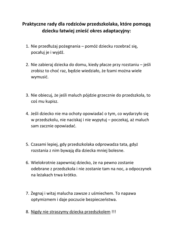 Praktyczne rady dla rodziców przedszkolaka, które pomogą dziecku łatwiej znieść okres adaptacyjny: 1. Nie przedłużaj pożegnania – pomóż dziecku rozebrać się, pocałuj je i wyjdź. 2. Nie zabieraj dziecka do domu, kiedy płacze przy rozstaniu – jeśli zrobisz to choć raz, będzie wiedziało, że łzami można wiele wymusić. 3. Nie obiecuj, że jeśli maluch pójdzie grzecznie do przedszkola, to coś mu kupisz. 4. Jeśli dziecko nie ma ochoty opowiadać o tym, co wydarzyło się w przedszkolu, nie naciskaj i nie wypytuj – poczekaj, aż maluch sam zacznie opowiadać. 5. Czasami lepiej, gdy przedszkolaka odprowadza tata, gdyż rozstania z nim bywają dla dziecka mniej bolesne. 6. Wielokrotnie zapewniaj dziecko, że na pewno zostanie odebrane z przedszkola i nie zostanie tam na noc, a odpoczynek na leżakach trwa krótko. 7. Żegnaj i witaj malucha zawsze z uśmiechem. To napawa optymizmem i daje poczucie bezpieczeństwa. 8. Nigdy nie straszymy dziecka przedszkolem !!! 9. Nigdy nie mówimy dziecku, że przyjdziemy wcześniej, jeśli to niemożliwe. Nie składajmy obietnic, których nie możemy dotrzymać. 10. Wdrażajmy dziecko do przestrzegania umów i zasad, do wykonywania prostych obowiązków. 11. Przyzwyczajajmy przedszkolaka do samoobsługi – do samodzielnego załatwiania potrzeb fizjologicznych, mycia się i ubierania. 12. Pozwólmy dziecku uczestniczyć w przygotowaniach do przedszkola, zachęcajmy do tego. 13. Nie okazujmy dziecku własnych obaw, lęków i rozterek zostawiając je w przedszkolu, ponieważ w ten sposób przekazalibyśmy mu swoje lęki.