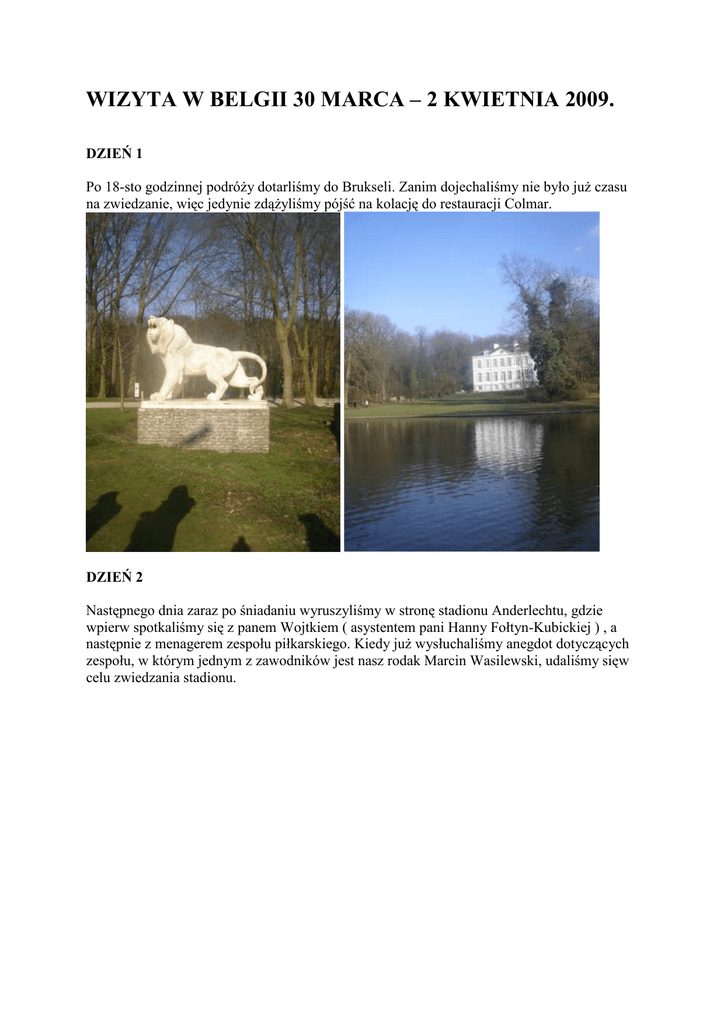 WIZYTA W BELGII 30 MARCA – 2 KWIETNIA 2009. DZIEŃ 1 Po 18-sto godzinnej podróŜy dotarliśmy do Brukseli. Zanim dojechaliśmy nie było juŜ czasu na zwiedzanie, więc jedynie zdąŜyliśmy pójść na kolację do restauracji Colmar. DZIEŃ 2 Następnego dnia zaraz po śniadaniu wyruszyliśmy w stronę stadionu Anderlechtu, gdzie wpierw spotkaliśmy się z panem Wojtkiem ( asystentem pani Hanny Fołtyn-Kubickiej ) , a następnie z menagerem zespołu piłkarskiego. Kiedy juŜ wysłuchaliśmy anegdot dotyczących zespołu, w którym jednym z zawodników jest nasz rodak Marcin Wasilewski, udaliśmy sięw celu zwiedzania stadionu. Następnym przystankiem był budynek Parlamentu Europejskiego, gdzie wpierw spotkaliśmy się z polską przedstawicielką. Uczestniczyliśmy w wykładzie na temat roli i funkcjonowania Parlamentu. Razem udaliśmy się do sali posiedzeń plenarnych. Kiedy wróciliśmy do auli miało tam miejsce spotkanie z europosłanką panią Hanną Fołtyn-Kubicką. Pani poseł opowiedziała o specyfice pracy w Parlamencie oraz o tematach, którymi aktualnie się zajmowała. Po lunchu udaliśmy się do centrum Brukseli w celu zwiedzania starówki. Wpierw odwiedziliśmy Łuk Tryumfalny, który został wybudowany na wzór francuskiego Łuku przez ówczesnego władcę Belgii-Leopolda II. Łuk Tryumfalny połączony jest z Muzeum Broni i Uzbrojenia, który zwiedziliśmy. Będąc w owym muzeum udaliśmy się na szczyt Łuku, z którego mieliśmy okazję obserwować panoramę Brukseli. Następnie wyruszyliśmy do Katedry pod wezwaniem św. Michała i św. Guduli. Kolejnym przystankiem była starówka, gdzie mieliśmy okazję zobaczyć siusiającego chłopczyka ( mała fontanna ☺ ) oraz być na głównym placu brukselskim. Wróciwszy do hotelu wzięliśmy udział w spotkaniu zorganizowanym przez pana Władka. Po wspólnym spędzeniu czasu udaliśmy się do swoich pokoi. DZIEŃ 3 Zaraz po śniadaniu odwiedziliśmy park w Muzeum Afrykańskim. Po spacerze pojechaliśmy do atomium( -model kryształu Ŝelaza powiększony 165 miliardów razy). U stóp atomium umiejscowiona jest ‘ mała Europa’. Zawiera ona charakterystyczne budowle danego miasta w kaŜdym członkowskim państwie Unii Europejskiej. W części poświęconej Polsce znajduje się Dwór Artusa, Neptun oraz 3 KrzyŜe ( budowle umiejscowione w Gdańsku). Po kolacji udaliśmy się do hotelu gdzie miejsce miało oraz spotkanie uczestników wycieczki. Głównym organizatorem był oczywiście pan Władek ☺. Miejsce miała kopia znanego programu ‘Mam talent’. Uczestników było duŜo i jak moŜna było to przewidzieć wygrał kaŜdy kto wystartował. DZIEŃ 4 Ostatni dzień wycieczki. Udaliśmy się do miasta oddalonego nieco od Brukseli-Antwerpii. Zwiedziliśmy starówkę, piękny renesansowy ratusz, rynek miasta. Mieliśmy takŜe okazje obejrzeć dom Piotra Rubensa, tak jak i jego pomnik w centrum miasta. W Antwerpii otrzymaliśmy czas na zakupy. Po obiedzie udaliśmy się do autokaru gdzie czekała nas 18-sto godzinna podróŜ powrotna do Polski .