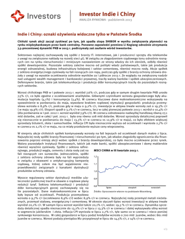 Investor Indie i Chiny ANALIZA RYNKOWA - październik 2013 Indie i Chiny: oznaki ożywienia widoczne tylko w Państwie Środka Chiński rynek akcji zaczął zyskiwać po tym, jak spadła stopa SHIBOR w wyniku zwiększenia płynności na rynku międzybankowym przez bank centralny. Ponowne zapowiedzi premiera Li Kegiang odnośnie utrzymania 7,5-procentowej dynamiki PKB w 2013 r. podtrzymały zaś zaufanie wśród inwestorów. Sektorowo najlepiej zachowywały się spółki z branży IT: internetowe, jak i producenci sprzętu dla telekomów z uwagi na zwiększone nakłady na rozwój sieci 4G. W związku ze złagodzeniem rządowego tonu odnośnie rosnących cen na rynku nieruchomości i mniejszym nastawieniem ze strony władzy do ich obniżek, odbiły również spółki deweloperskie. Pozostałe sektory zależne mocno od polityki władz państwowych, takie jak produkcja energii odnawialnej, budowa infrastruktury kolejowej i sektor cementowy, również mocno rosły. Akcje spółek z sektora energetycznego zyskiwały na fali rosnących cen ropy, podczas gdy spółki z branży ochrony zdrowia drożały z uwagi na wysokie oczekiwania odnośnie wyników za I półrocze 2013 r. Ze względu na zwiększony nadzór nad usługami wealth management i bankowości prywatnej, traciły walory banków i spółek ubezpieczeniowych. Defensywne branże, takie jak telekomunikacja i produkcja dóbr konsumpcyjnych traciły do pozostałych rosnących sektorów. Wzrost chińskiego PKB w I połowie 2013 r. wyniósł 7,6% r/r, podczas gdy w samym drugim kwartale PKB urosło 7,5% r/r, co było zgodne z oczekiwaniami analityków. Głównymi czynnikami wzrostu gospodarczego były akumulacja kapitału (4,1%) i konsumpcja (3,4%). W czerwcu kluczowe dane makroekonomiczne wskazywały na spowolnienie w porównaniu do maja, wywołane brakiem rządowej stymulacji gospodarki: produkcja przemysłowa wzrosła o 8,9% r/r, podczas gdy w maju o 9,2% r/r, inwestycje w aktywa trwałe wzrosły zaś o 19,3% r/r ( w maju 19,9% r/r). Eksport spadł o 3,1% r/r w czerwcu, lecz w całej pierwszej połowie 2013 r. wzrósł o 10,4% r/r (dla porównania w I poł. 2012 r. wzrost wyniósł 7,9% r/r). W czerwcu odnotowano nadwyżkę handlową równą 27,1 mld dolarów, zaś w całej I poł. 2013 r. była ona równa 108 mld dolarów. Wzrost sprzedaży detalicznej poprawił się nieznacznie w porównaniu do maja ( 13,3% r/r w czerwcu vs 12,9% r/r w maju), co było efektem większej sprzedaży biżuterii, złota i samochodów. Inflacja CPI była nieznacznie wyższa od oczekiwań i wyniosła 2,7% r/r w czerwcu vs 2,1% r/r w maju, na co miały przełożenie wyższe ceny wieprzowiny. W sierpniu akcje chińskich spółek kontynuowały wzrosty na fali lepszych od oczekiwań danych makro z lipca. Najszybciej rosły spółki branży finansowej i nieruchomości po tym, jak władze złagodziły ograniczenia dla finansowania poprzez emisję akcji wobec spółek z branży deweloperskiej, co było mocno oczekiwane przez rynek. Walory pozostałych instytucji finansowych, takich jak małe banki, spółki ubezpieczeniowe i domy maklerskie również wyraźnie zyskiwały. Spółki z sektora rafineryjnego, produkcji węgla, cementu i złota rosły zaś na MSCI CHINA w III kwartale 2013 r. fali rosnących cen surowców. Jednocześnie, spółki 1,2 z sektora ochrony zdrowia były na fali wyprzedaży w związku z obawami o antykorupcyjną kampanię 1,1 rządową, której celem ma być wyjaśnienie nieprawidłowości związanych z kanałami dystrybucji produktów ochrony zdrowia. 1,0 Wysoce regulowany sektor dystrybucji mediów uży0,9 teczności publicznej tracił w obawie o rządowe plany redukcji taryf. Sektory telekomunikacji i produkcji 0,8 lipiec sierpień wrzesień dóbr konsumpcyjnych gorzej zachowywały się na Źródło: Opracowanie własne na podstawie Bloomberg tle pozostałych. Dane makroekonomiczne w lipcu były lepsze od oczekiwań. Produkcja przemysłowa wzrosła o 9,7% r/r (oczekiwano 8,9% r/r) wobec 8,9% r/r w czerwcu. Najszybciej rosły przemysł metali nieżelaznych, przemysł stalowy, energetyczny i cementowy. W okresie styczeń-lipiec wzrost inwestycji w aktywa trwałe wyniósł 20,1% r/r. W samym lipcu wzrost wyniósł także 20,1% r/r, wobec 19,3 % r/r w czerwcu. Dynamika sprzedaży detalicznej spadła nieznacznie do 13,2% r/r w lipcu z 13,3% r/r w czerwcu i dalej wykazywała silny wzrost w segmencie jubilerskim i złota. Inflacja CPI wyniosła w lipcu 2,7% r/r, tyle samo co w czerwcu i nieco poniżej rynkowego konsensusu. W całej gospodarce w lipcu podaż kredytów wzrosła o 700 mld juanów, wobec 861 mld juanów w czerwcu. Wzrost podaży pieniądza M2 przyspieszył w lipcu do 14,5% r/r, z 14% r/r w czerwcu. 1/3 Investor Indie i Chiny ANALIZA RYNKOWA - październik 2013 Oficjalne chińskie PMI za sierpień wyniosło 51, czyli o 0,7 więcej niż w czerwcu, osiągając tym samym na fali nowych zamówień w gospodarce najwyższy poziom od maja 2012 r. We wrześniu, chińskie PMI publikowane przez bank HSBC urosło do 50,2 (wobec 50,1 w sierpniu) i osiągnęło najwyższy poziom od 5 miesięcy. Z uwagi na spadek popytu wewnętrznego było jednak na niższym poziomie niż jego wstępne odczyty wynoszące 51,1. Spowolnienie w zamówieniach krajowych zrekompensowała częściowo poprawa koniunktury w eksporcie, gdzie PMI wzrósł do 50,7 we wrześniu z 47,2 w sierpniu. Oficjalne chińskie PMI również urosło o 0,1 i wyniosło 51,2 (poprzednio 51,0). Indeks nastrojów wśród małych firm spadł we wrześniu do 48,4 wobec 48,8 w sierpniu, zaś w przypadku dużych przedsiębiorstw wzrósł do 52,1 wobec 51,8 w sierpniu. Koniunktura wśród nowych zamówień również poprawiła się, a PMI wzrósł w tym obszarze z 52,4 w sierpniu do 52,8 we wrześniu. Próby stymulacji gospodarczej widać ze strony rządu. Utrzymano wydatki publiczne na budownictwo mieszkaniowe, zwiększono nakłady na infrastrukturę, obniżono podatki dla małych przedsiębiorstw a w