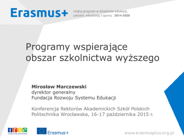 Programy wspierające obszar szkolnictwa wyższego Mirosław Marczewski dyrektor generalny Fundacja Rozwoju Systemu Edukacji Konferencja Rektorów Akademickich Szkół Polskich Politechnika Wrocławska, 16-17 października 2015 r. Budżet 2014-2020 Siedmioletni budżet programu wynosi 14,7 mld euro, co stanowi 40-procentowy wzrost w stosunku do poprzedniej edycji programów unijnych w dziedzinie edukacji. Budżet 2015 + 6,9 mln € z programu PO WER Wspieranie mobilności studentów i pracowników Miesięczne stawki stypendialne dla studentów Kraje należące do danej grupy Wyjazdy na studia Wyjazdy na praktyki Austria, Dania, Finlandia, Francja, Irlandia, Lichtenstein, Norwegia, Szwecja, Wielka Brytania, Włochy 500 € 600 € Belgia, Chorwacja, Cypr, Czechy, Grecja, Hiszpania, Holandia, Islandia, Luksemburg, Niemcy, Portugalia, Słowenia, Turcja 400 € 500 € Bułgaria, Estonia, FYROM (była republika Jugosławii Macedonia), Litwa, Łotwa, Malta, Rumunia, Słowacja, Węgry 300 € 400 € GRUPA 1. GRUPA 2. GRUPA 3. Akcja 2. Partnerstwa strategiczne na rzecz szkolnictwa wyższego Pierwsze dane statystyczne – konkurs 2015 W konkursie w roku 2015 NA dysponowała budżetem 2 604 666 € na dofinansowanie ok. 10-11 projektów w sektorze szkolnictwa wyższego. Ostatecznie spośród 72 złożonych zatwierdzono do finansowania 11 projektów. Fundusze EOG i norweskie FRSE jest również operatorem programu Fundusz Stypendialny i Szkoleniowy (FSS), w ramach którego w latach 2013-2016 realizowane są mobilności studentów i pracowników uczelni. Budżet całościowy: 15 mln € Działania: Mobilność akademicka: 1,6 mln € (nabór 2015/2016) Rozwój Polskich Uczelni: 5 mln € (nabór 2014) Najbardziej aktywne uczelnie Lp. Nazwa uczelni Liczba projektów 1 Uniwersytet Warmińsko-Mazurski 17 2 Uniwersytet Śląski 16 3 Uniwersytet Łódzki 13 4 Uniwersytet Medyczny w Białymstoku 10 5 Uniwersytet im. Adama Mickiewicza 9 6 Uniwersytet Ekonomiczny w Poznaniu 8 Wyższa Szkoła Bankowa w Gdańsku 8 Politechnika Częstochowska 8 Wyższa Szkoła Biznesu w Dąbrowie Górniczej 8 Dziękuję za uwagę! Więcej informacji: www.erasmusplus.org.pl www.fss.org.pl www.sciex.org.pl
