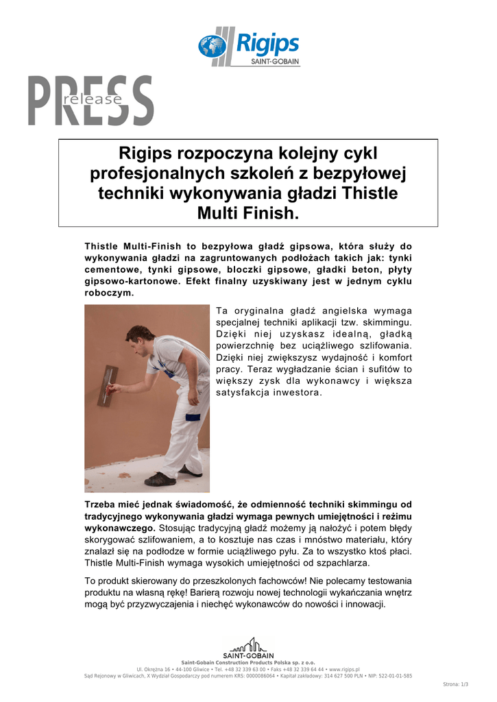 Rigips rozpoczyna kolejny cykl profesjonalnych szkoleń z bezpyłowej techniki wykonywania gładzi Thistle Multi Finish. Thistle Multi-Finish to bezpyłowa gładź gipsowa, która służy do wykonywania gładzi na zagruntowanych podłożach takich jak: tynki cementowe, tynki gipsowe, bloczki gipsowe, gładki beton, płyty gipsowo-kartonowe. Efekt finalny uzyskiwany jest w jednym cyklu roboczym. Ta oryginalna gładź angielska wymaga specjalnej techniki aplikacji tzw. skimmingu. Dzięki niej uzyskasz idealną, gładką powierzchnię bez uciążliwego szlifowania. Dzięki niej zwiększysz wydajność i komfort pracy. Teraz wygładzanie ścian i sufitów to większy zysk dla wykonawcy i większa satysfakcja inwestora. Trzeba mieć jednak świadomość, że odmienność techniki skimmingu od tradycyjnego wykonywania gładzi wymaga pewnych umiejętności i reżimu wykonawczego. Stosując tradycyjną gładź możemy ją nałożyć i potem błędy skorygować szlifowaniem, a to kosztuje nas czas i mnóstwo materiału, który znalazł się na podłodze w formie uciążliwego pyłu. Za to wszystko ktoś płaci. Thistle Multi-Finish wymaga wysokich umiejętności od szpachlarza. To produkt skierowany do przeszkolonych fachowców! Nie polecamy testowania produktu na własną rękę! Barierą rozwoju nowej technologii wykańczania wnętrz mogą być przyzwyczajenia i niechęć wykonawców do nowości i innowacji. Saint-Gobain Construction Products Polska sp. z o.o. Ul. Okrężna 16 • 44-100 Gliwice • Tel. +48 32 339 63 00 • Faks +48 32 339 64 44 • www.rigips.pl Sąd Rejonowy w Gliwicach, X Wydział Gospodarczy pod numerem KRS: 0000086064 • Kapitał zakładowy: 314 627 500 PLN • NIP: 522-01-01-585 Strona: 1/3 Oferta szkoleniowa Rigips jest odpowiedzią na pojawiające się co raz częściej pytania dotyczące możliwości zdobycia wiedzy w zakresie aplikacji Thistle Multi-Finisha. Wykonawcy widzą w Thistle Multi-Finish swoją szansę na budowanie przewagi konkurencyjnej. Jest to bardzo pozytywne zjawisko, ponieważ przyniesie korzyści wszystkim uczestnikom procesu budowlanego. Rigips prowadzi profesjonalny program odpłatnych szkoleń z nowej techniki gładzenia. Chcemy, aby jak najwięcej wykonawców miało możliwość wyszkolenia swoich pracowników. Szkolenia z wykonywania gładzi Thistle Multi-Finish (tzw. skimmingu) skierowane jest do szpachlarzy i gładziarzy, którzy: ❍ ❍ wykonują tradycyjne gładzie gipsowe (ze szlifowaniem) wykonują lekką zabudowę wnętrz (poddasza, ściany i sufity z płyt g-k) wraz ze szpachlowaniem połączeń i wygładzaniem całych powierzchni płyt g-k Korzyści wynikające z uczestnictwa w szkoleniu: ❍ ❍ ❍ ❍ opanowanie nowej techniki, która daje realną przewagę konkurencyjną Państwa firmy, gładź jest wykonywana minimum dwukrotnie szybciej, bez uciążliwego pyłu dla Państwa, ale i dla inwestora, szczególnie podczas remontów, otrzymanie informacji i gotowych wskazówek od Instruktora Rigips nie uczą się Państwo na własnych błędach; wiemy, że w wykonawstwie taka nauka ma wysoką cenę... (gorsza opinia, mniej zleceń, koszty reklamacji, strata czasu, stres itp.) Szkolenie jest dwudniowe. Drugiego dnia szkolenia odbywa się egzamin praktyczny oraz test teoretyczny. Po uzyskaniu pozytywnego wyniku na egzaminach uczestnik otrzymuje Zaświadczenie o ukończeniu szkolenia. Miejsce szkolenia: Ośrodek szkoleniowy przy Fabryce Rigips-Stawiany k.Pińczowa Uwaga! W koszcie szkolenia zapewniamy nocleg i wyżywienie. Zamówienia należy składać poprzez stronę http://multifinish.rigips.pl Rigips istnieje na polskim rynku od 1994 roku. Firma jest dostawcą najwyższej jakości systemów i rozwiązań do budowy komfortowych, przyjaznych i bezpiecznych wnętrz. Rigips oferuje klientom ściany działowe, poddasza, okładziny ścienne oraz sufity podwieszane. Rozwiązania Rigips zapewniają Saint-Gobain Construction Products Polska sp. z o.o. Ul. Okrężna 16 • 44-100 Gliwice • Tel. +48 32 339 63 00 • Faks +48 32 339 64 44 • www.rigips.pl Sąd Rejonowy w Gliwicach, X Wydział Gospodarczy pod numerem KRS: 0000086064 • Kapitał zakładowy: 314 627 500 PLN • NIP: 522-01-01-585 Strona: 2/3 najwyższą jakość wykończenia powierzchni mieszkalnych i biurowych, wysoki komfort akustyczny, bezpieczeństwo przeciwpożarowe, bezpieczny dla zdrowia i ekologiczny materiał – płyty Rigips produkowane są z naturalnego kamienia. Rigips posiada nowoczesną fabrykę produkcji płyt gipsowo – kartonowych w Szarbkowie. Rigips, jako jedyna marka na rynku, oferuje płytę PRO z nadrukowaną miarką na krawędziach, która umożliwia szybki i precyzyjny montaż. Firma wprowadziła również na rynek innowacyjne profile ULTRASTIL®, które dzięki specjalnym ryflowaniom są o ponad 50% sztywniejsze i bardziej wytrzymałe, niż zwykłe standardowe profile. Kontakt dla mediów: Katarzyna Kołodziejska Starszy specjalista marketingu Biuro Rigips w Warszawie ul. Cybernetyki 9 02-677 Warszawa e-mail: [email protected] Tel. kom.: +48 668 311 526 Saint-Gobain Construction Products Polska sp. z o.o. Ul. Okrężna 16 • 44-100 Gliwice • Tel. +48 32 339 63 00 • Faks +48 32 339 64 44 • www.rigips.pl Sąd Rejonowy w Gliwicach, X Wydział Gospodarczy pod numerem KRS: 0000086064 • Kapitał zakładowy: 314 627 500 PLN • NIP: 522-01-01-585 Strona: 3/3