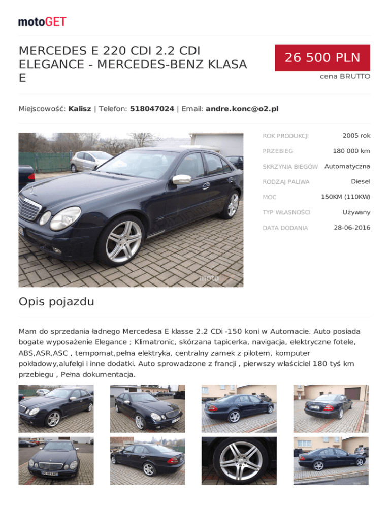 MERCEDES E 220 CDI 2.2 CDI ELEGANCE - MERCEDES-BENZ KLASA E 26 500 PLN cena BRUTTO Miejscowość: Kalisz | Telefon: 518047024 | Email: [email protected] 2005 rok 180 000 km Automatyczna Diesel 150KM (110KW) Używany 28-06-2016 Opis pojazdu Mam do sprzedania ładnego Mercedesa E klasse 2.2 CDi -150 koni w Automacie. Auto posiada bogate wyposażenie Elegance ; Klimatronic, skórzana tapicerka, navigacja, elektryczne fotele, ABS,ASR,ASC , tempomat,pełna elektryka, centralny zamek z pilotem, komputer pokładowy,alufelgi i inne dodatki. Auto sprowadzone z francji , pierwszy właściciel 180 tyś km przebiegu , Pełna dokumentacja.