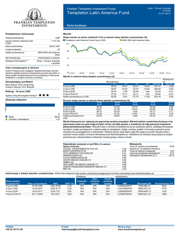 Franklin Templeton Investment Funds Akcje – Europa, Ameryka Łacińska Templeton Latin America Fund 31.01.2017 Karta funduszu Podstawowe informacje Wyniki Waluta podstawowa USD Łączna wartość aktywów netto (USD) 1.137 mln Stopa zwrotu za okres ostatnich 5 lat w walucie klasy tytułów uczestnictwa (%) Templeton Latin America Fund N (acc) USD MSCI EM Latin America Index 110 Data uruchomienia 28.02.1991 Liczba emitentów 43 Indeks porównawczy MSCI EM Latin America Index Styl inwestycyjny Inwestowanie w wartość Kategoria Morningstar™ 90 70 Akcje – Europa, Ameryka Łacińska 50 Cele inwestycyjne w skrócie Celem Funduszu jest osiąganie długoterminowego wzrostu wartości kapitału poprzez inwestowanie przede wszystkim w akcje spółek zarejestrowanych lub prowadzących kluczową działalność w krajach Ameryki Łacińskiej. 30 01/12 07/12 01/13 07/13 01/14 07/14 01/15 07/15 01/16 07/16 Zarządzający portfelem Średniorocz ne Skumulowane Mark Mobius, PhD: Hong Kong Gustavo Stenzel, CFA: Brazylia N (acc) USD A (acc) USD N (acc) EUR N (acc) PLN-H1 Indeks porównawczy w USD Ratingi - N (acc) USD Ogólny rating Morningstar Rating™: Alokacja aktywów 01/17 Wyniki w walucie klasy tytułów uczestnictwa (%) 1 r. 3 l. 5 l. 10 l. Od pocz. Od pocz. 38,30 38,97 38,70 37,38 48,29 -16,47 -15,22 4,35 -15,11 -4,91 -36,31 -34,70 -22,84 -33,11 -27,70 -14,43 -10,06 N/A N/A 11,46 167,14 288,48 -23,30 -30,90 434,18 4,95 9,02 -4,41 -5,01 8,59 Roczne stopy zwrotu w walucie klasy tytułów uczestnictwa (%) Akcje Gotówka i ekwiwalenty % 98,63 1,37 N (acc) USD A (acc) USD N (acc) EUR N (acc) PLN-H1 Indeks porównawczy w USD 01/16 01/17 01/15 01/16 01/14 01/15 01/13 01/14 01/12 01/13 38,30 38,97 38,70 37,38 48,29 -27,46 -27,08 -24,35 -27,42 -29,64 -16,74 -16,33 -0,54 -14,87 -8,85 -25,28 -24,90 -24,77 -24,07 -24,20 2,06 2,56 -1,71 3,78 0,31 Wyniki historyczne nie wskazują ani gwarantują wyników przyszłych. Wartość tytułów uczestnictwa funduszu oraz generowane przez nie zyski mogą nie tylko rosnąć, ale także spadać, a inwestorzy nie mają gwarancji odzyskania pełnej zainwestowanej kwoty. Wszystkie dane o wynikach przedstawione są we wskazanej walucie, zakładają reinwestycję dywidend i zostały pomniejszone o należne opłaty za zarządzanie. Opłaty, prowizje, podatki i inne koszty poniesione przez inwestora nie są uwzględnione w obliczeniach. Wahania kursów walut także mogą mieć wpływ na wyniki. Aktualne dane o wynikach można znaleźć na stronie internetowej www.franklintempleton.pl. Odniesienia do indeksów służą wyłącznie analizie porównawczej i odzwierciedleniu środowiska inwestycyjnego w danym okresie. Największe pozycje w portfelu (% całości) Nazwa emitenta ITAUSA - INVESTIMENTOS ITAU SA BANCO BRADESCO SA ITAU UNIBANCO HOLDING SA BM&FBOVESPA SA LOJAS AMERICANAS SA GRUPO MEXICO SAB DE CV AMBEV SA WAL-MART DE MEXICO SAB DE CV GRUPO FINANCIERO BANORTE SAB DE CV BRF SA Wskaźniki 7,85 6,48 6,41 5,66 4,82 4,65 4,58 3,96 3,93 3,43 Cena do zysków (na podstawie danych za 12 ostatnich miesięcy) Cena do wartości księgowej Cena do przepływów pieniężnych Odchylenie standardowe (5 l.) 16,42 2,07 6,31 20,72 Informacje o klasie tytułów uczestnictwa (Pełna lista dostępnych klas tytułów uczestnictwa dostępna jest na stronie internetowej www.franklintempleton.pl). Dywidendy Klasa tytułów uczestnictwa N (acc) USD A (acc) USD N (acc) EUR N (acc) PLN-H1 Telefon +48 22 33713 50 Data uruchomienia 30.09.1996 14.05.2001 18.03.2011 20.11.2009 NAV USD 28,09 USD 54,77 EUR 7,67 PLN 6,91 TER* (%) 2,79 2,29 2,80 2,80 Częstotliwość N/A N/A N/A N/A Identyfikatory Data ostatniej wypłaty N/A N/A N/A N/A E-mail [email protected] Kwota ostatniej wypłaty N/A N/A N/A N/A ISIN LU0094040077 LU0128526570 LU0592650591 LU0465790201 Bloomberg ID TEMLABI LX TEMLATA LX TEMLNAE LX TEMLNH1 LX Strona www www.franklintempleton.pl Kod funduszu TA 0842 0776 1235 1066 Templeton Latin America Fund 31.01.2017 Skład portfela Templeton Latin America Fund MSCI EM Latin America Index Alokacja geograficzna Brazylia Meksyk Chile Peru Włochy Luksemburg Panama Argentyna Kolumbia Gotówka i ekwiwalenty Rozkład kapitalizacji rynkowej w USD <2,00 miliardów 2,00-5,00 miliardów 5,00-10,00 miliardów 10,00-25,00 miliardów 25,00-50,00 miliardów >50,00 miliardów N/A 51,73 21,46 7,63 6,88 3,42 2,84 1,75 1,63 1,29 1,37 % całości / 59,53 / 25,35 / 8,79 / 3,01 / 0,00 / 0,00 / 0,00 / 0,00 / 3,32 / 0,00 % akcji 12,21 20,95 9,62 34,62 4,01 17,70 0,87 Alokacja sektorowa Finanse Dobra podstawowe Surowce Dobra wyższego rzędu Przemysł Energia Usługi komunalne Technologie informatyczne Usługi telekomunikacyjne Inne Gotówka i ekwiwalenty 44,38 19,29 11,51 8,05 6,16 4,29 1,98 1,63 0,78 0,55 1,37 % całości / 30,69 / 16,53 / 16,48 / 5,63 / 5,76 / 8,91 / 6,43 / 1,52 / 5,63 / 2,41 / 0,00 Ważne informacje Franklin Templeton Investment Funds ('Fundusz') to spółka SICAV z siedzibą w Luksemburgu. O ile nie zaznaczono inaczej, źródłem danych i informacji zawartych w niniejszym dokumencie jest Franklin Templeton Investments, a dane są aktualne na dzień wydania niniejszego dokumentu. O ile nie zaznaczono inaczej, dane dotyczące indeksów porównawczych pochodzą od FactSet i są aktualne na dzień wydania niniejszego dokumentu. Niniejszy dokument nie stanowi porady prawnej, podatkowej ani inwestycyjnej ani oferty tytułów uczestnictwa Funduszu. Decyzje o zapisach na tytuły uczestnictwa Funduszu należy podejmować wyłącznie w oparciu o informacje zawarte w aktualnym prospekcie Funduszu oraz w „Kluczowych informacjach dla inwestorów” (o ile taki dokument jest dostępny), a także w ostatnim poddanym audytowi sprawozdaniu rocznym lub półrocznym, które można znaleźć na naszej stronie internetowej www.franklintempleton.pl lub otrzymać bezpłatnie od Templeton Asset Management (Poland) TFI S.A., Rondo ONZ 1; 00-124 Warszawa, tel.: 48 22 337 13 50, faks: 48 22 337 13 70. Tytuły uczestnictwa Fu