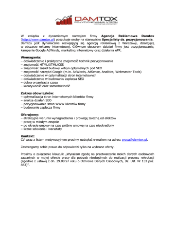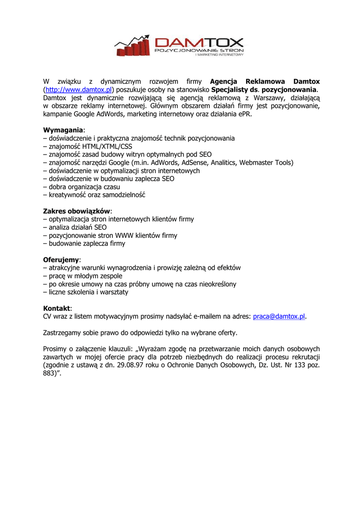 W związku z dynamicznym rozwojem firmy Agencja Reklamowa Damtox (http://www.damtox.pl) poszukuje osoby na stanowisko Specjalisty ds. pozycjonowania. Damtox jest dynamicznie rozwijającą się agencją reklamową z Warszawy, działającą w obszarze reklamy internetowej. Głównym obszarem działań firmy jest pozycjonowanie, kampanie Google AdWords, marketing internetowy oraz działania ePR. Wymagania: – doświadczenie i praktyczna znajomość technik pozycjonowania – znajomość HTML/XTML/CSS – znajomość zasad budowy witryn optymalnych pod SEO – znajomość narzędzi Google (m.in. AdWords, AdSense, Analitics, Webmaster Tools) – doświadczenie w optymalizacji stron internetowych – doświadczenie w budowaniu zaplecza SEO – dobra organizacja czasu – kreatywność oraz samodzielność Zakres obowiązków: – optymalizacja stron internetowych klientów firmy – analiza działań SEO – pozycjonowanie stron WWW klientów firmy – budowanie zaplecza firmy Oferujemy: – atrakcyjne warunki wynagrodzenia i prowizję zależną od efektów – pracę w młodym zespole – po okresie umowy na czas próbny umowę na czas nieokreślony – liczne szkolenia i warsztaty Kontakt: CV wraz z listem motywacyjnym prosimy nadsyłać e-mailem na adres: [email protected]. Zastrzegamy sobie prawo do odpowiedzi tylko na wybrane oferty. Prosimy o załączenie klauzuli: „Wyrażam zgodę na przetwarzanie moich danych osobowych zawartych w mojej ofercie pracy dla potrzeb niezbędnych do realizacji procesu rekrutacji (zgodnie z ustawą z dn. 29.08.97 roku o Ochronie Danych Osobowych, Dz. Ust. Nr 133 poz. 883)”.