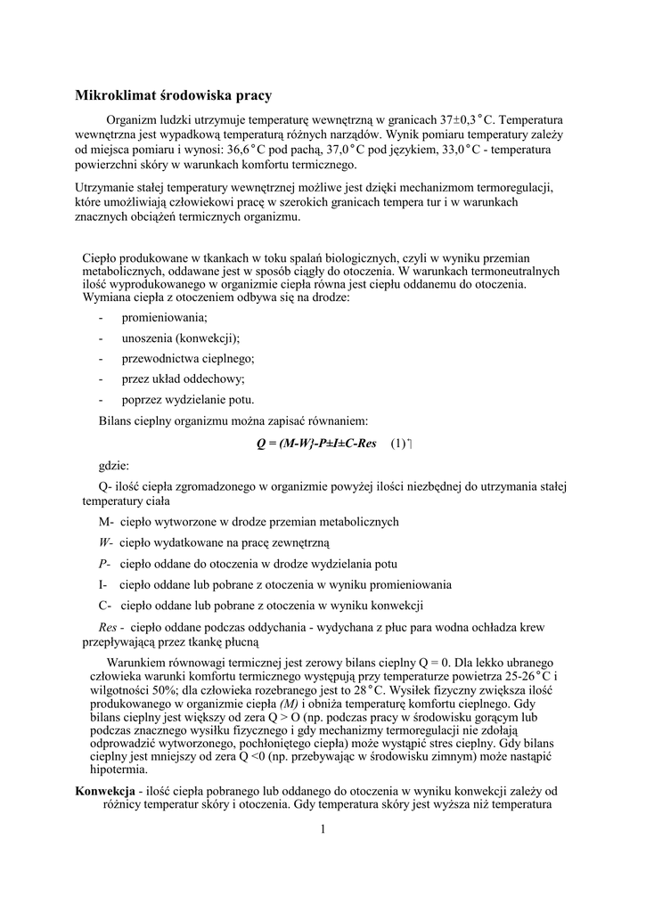 Mikroklimat środowiska pracy Organizm ludzki utrzymuje temperaturę wewnętrzną w granicach 37±0,3°C. Temperatura wewnętrzna jest wypadkową temperaturą róŜnych narządów. Wynik pomiaru temperatury zaleŜy od miejsca pomiaru i wynosi: 36,6°C pod pachą, 37,0°C pod językiem, 33,0°C - temperatura powierzchni skóry w warunkach komfortu termicznego. Utrzymanie stałej temperatury wewnętrznej moŜliwe jest dzięki mechanizmom termoregulacji, które umoŜliwiają człowiekowi pracę w szerokich granicach tempera tur i w warunkach znacznych obciąŜeń termicznych organizmu. Ciepło produkowane w tkankach w toku spalań biologicznych, czyli w wyniku przemian metabolicznych, oddawane jest w sposób ciągły do otoczenia. W warunkach termoneutralnych ilość wyprodukowanego w organizmie ciepła równa jest ciepłu oddanemu do otoczenia. Wymiana ciepła z otoczeniem odbywa się na drodze: - promieniowania; - unoszenia (konwekcji); - przewodnictwa cieplnego; - przez układ oddechowy; - poprzez wydzielanie potu. Bilans cieplny organizmu moŜna zapisać równaniem: Q = (M-W}-P±I±C-Res (1) gdzie: Q- ilość ciepła zgromadzonego w organizmie powyŜej ilości niezbędnej do utrzymania stałej temperatury ciała M- ciepło wytworzone w drodze przemian metabolicznych W- ciepło wydatkowane na pracę zewnętrzną P- ciepło oddane do otoczenia w drodze wydzielania potu I- ciepło oddane lub pobrane z otoczenia w wyniku promieniowania C- ciepło oddane lub pobrane z otoczenia w wyniku konwekcji Res - ciepło oddane podczas oddychania - wydychana z płuc para wodna ochładza krew przepływającą przez tkankę płucną Warunkiem równowagi termicznej jest zerowy bilans cieplny Q = 0. Dla lekko ubranego człowieka warunki komfortu termicznego występują przy temperaturze powietrza 25-26°C i wilgotności 50%; dla człowieka rozebranego jest to 28°C. Wysiłek fizyczny zwiększa ilość produkowanego w organizmie ciepła (M) i obniŜa temperaturę komfortu cieplnego. Gdy bilans cieplny jest większy od zera Q > O (np. podczas pracy w środowisku gorącym lub podczas znacznego wysiłku fizycznego i gdy mechanizmy termoregulacji nie zdołają odprowadzić wytworzonego, pochłoniętego ciepła) moŜe wystąpić stres cieplny. Gdy bilans cieplny jest mniejszy od zera Q <0 (np. przebywając w środowisku zimnym) moŜe nastąpić hipotermia. Konwekcja - ilość ciepła pobranego lub oddanego do otoczenia w wyniku konwekcji zaleŜy od róŜnicy temperatur skóry i otoczenia. Gdy temperatura skóry jest wyŜsza niŜ temperatura 1 otoczenia, organizm ogrzewa warstwę powietrza znajdującą się przy skórze, ciepłe powietrze unoszone jest ku górze, a jego miejsce zajmuje powietrze chłodniejsze, proces trwa aŜ do wyrównania temperatur. Promieniowanie - kaŜde ciało o temperaturze powyŜej zera bezwzględnego emituje promieniowanie; jeśli temperatura powierzchni ciała jest wyŜsza niŜ temperatura otoczenia, ciało oddaje energię do otoczenia. Temperatura ciała jest regulowana przez ośrodkowy układ nerwowy. Główny ośrodek termoregulacyjny jest zlokalizowany w podwzgórzu. Informacje o termicznym stanie ciała odbierane są przez specjalne czujniki - zwane termoreceptorami. W podwzgórzu dokonywana jest bieŜąca ocena aktualnego stanu temperatury i z ośrodków termoregulacyjnych wychodzą dyspozycje korygujące procesy tworzenia i rozpraszania ciepła. Niewielkie nawet odchylenia od normy temperatury ciała wyzwalają w podwzgórzu pobudzenia, które prowadzą do uruchomienia reakcji termoregulacyjnych o charakterze kompensacyjnym. W wyniku tego działania dochodzi do przywrócenia optymalnej temperatury wnętrza ciała. Zasadnicze znaczenie w informowaniu centralnych ośrodków termoregulacyjnych i przenoszeniu ciepła w organizmie ma krew. Krew jest jedynym pośrednikiem wymiany ciepła między wnętrzem ciała a jego powierzchnią. Ciepło metaboliczne wytwarzane przez całe Ŝycie w takich narządach, jak wątroba, mózg czy nerki, albo powstające w pracujących mięśniach, jest przenoszone przez krew do obszarów ciała naraŜonych na znaczne utraty ciepła. UmoŜliwia to utrzymywanie dość stałej i odpowiedniej temperatury w odległych częściach ciała. Krew ostudzona na powierzchni ciała dochodzi do narządów wewnętrznych i ochładza je. W ten sposób krąŜąca krew chroni w pewnej mierze narządy wewnętrzne przed przegrzaniem. Mechanizmy termoregulacji powodują oddawanie ciepła do otoczenia lub zachowanie ciepła. Do mechanizmów termoregulacji naleŜą: reakcja naczyniowa - rozszerzenie/skurcz naczyń krwionośnych skóry; pobudzenie gruczołów potowych; drŜenie mięśni; zwiększenie wydzielania hormonów wzmagających metabolizm Zmiana ukrwienia skóry moŜe prowadzić do utraty lub zachowania ciepła w organizmie. Rozszerzenie naczyń krwionośnych powoduje wzrost skórnego przepływu krwi i wzrost temperatury powierzchni ciała. Jeśli temperatura otoczenia jest niŜsza, reakcja ta prowadzi do zwiększenia utraty ciepła w drodze promieniowania i konwekcji. Skurcz naczyń krwionośnych powoduje obniŜenie temperatury skóry i zmniejszenie szybkości wymiany ciepła z otoczeniem. Zarówno skurcz, jak i rozszerzenie naczyń krwionośnych nie jest bez wpływu na pracę układu krąŜenia. Rozszerzenie naczyń krwionośnych powoduje obniŜenie ciśnienia tętniczego krwi, rekompensowanego zwiększeniem częstotliwości skurczów serca. Zwiększenie ukrwienia skóry odbywa się kosztem ukrwienia innych narządów. Podobnie skurcz naczyń krwionośnych prowadzi do wzrostu ciśnienia tętniczego krwi. Początkowo częstość skurczów serca obniŜa się, a następnie w wyniku wzrostu oporu obwodowego częstość skurczów serca rośnie. Najbardziej efektywną reakcją organizmu z punktu widzenia utraty ciepła jest pobudzenie gruczołów potowych; mechanizm ten zostaje uruchomiony przy temperaturze otoczenia ok. 2832°C . Pobudzone gruczoły potowe wydzielają duŜ