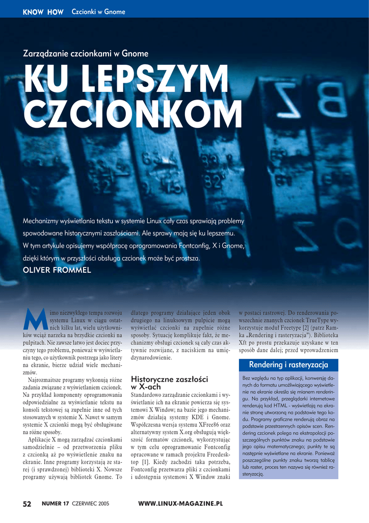 KNOW HOW Czcionki w Gnome Zarządzanie czcionkami w Gnome KU LEPSZYM CZCIONKOM Mechanizmy wyświetlania tekstu w systemie Linux cały czas sprawiają problemy spowodowane historycznymi zaszłościami. Ale sprawy mają się ku lepszemu. W tym artykule opisujemy współpracę oprogramowania Fontconfig, X i Gnome, dzięki którym w przyszłości obsługa czcionek może być prostsza. OLIVER FROMMEL M imo niezwykłego tempa rozwoju systemu Linux w ciągu ostatnich kilku lat, wielu użytkowników wciąż narzeka na brzydkie czcionki na pulpitach. Nie zawsze łatwo jest dociec przyczyny tego problemu, ponieważ w wyświetlaniu tego, co użytkownik postrzega jako litery na ekranie, bierze udział wiele mechanizmów. Najrozmaitsze programy wykonują różne zadania związane z wyświetlaniem czcionek. Na przykład komponenty oprogramowania odpowiedzialne za wyświetlanie tekstu na konsoli tekstowej są zupełnie inne od tych stosowanych w systemie X. Nawet w samym systemie X czcionki mogą być obsługiwane na różne sposoby. Aplikacje X mogą zarządzać czcionkami samodzielnie – od przetworzenia pliku z czcionką aż po wyświetlenie znaku na ekranie. Inne programy korzystają ze starej (i sprawdzonej) biblioteki X. Nowsze programy używają bibliotek Gnome. To 52 NUMER 17 CZERWIEC 2005 dlatego programy działające jeden obok drugiego na linuksowym pulpicie mogą wyświetlać czcionki na zupełnie różne sposoby. Sytuację komplikuje fakt, że mechanizmy obsługi czcionek są cały czas aktywnie rozwijane, z naciskiem na umiędzynarodowienie. w postaci rastrowej. Do renderowania powszechnie znanych czcionek TrueType wykorzystuje moduł Freetype [2] (patrz Ramka „Rendering i rasteryzacja”). Biblioteka Xft po prostu przekazuje uzyskane w ten sposób dane dalej; przed wprowadzeniem Rendering i rasteryzacja Historyczne zaszłości w X-ach Standardowo zarządzanie czcionkami i wyświetlanie ich na ekranie powierza się systemowi X Window; na bazie jego mechanizmów działają systemy KDE i Gnome. Współczesna wersja systemu XFree86 oraz alternatywny system X.org obsługują większość formatów czcionek, wykorzystując w tym celu oprogramowanie Fontconfig opracowane w ramach projektu Freedesktop [1]. Kiedy zachodzi taka potrzeba, Fontconfig przetwarza pliki z czcionkami i udostępnia systemowi X Window znaki WWW.LINUX-MAGAZINE.PL Bez względu na typ aplikacji, konwersję danych do formatu umożliwiającego wyświetlenie na ekranie określa się mianem renderingu. Na przykład, przeglądarki internetowe renderują kod HTML - wyświetlają na ekranie stronę utworzoną na podstawie tego kodu. Programy graficzne renderują obraz na podstawie przestrzennych opisów scen. Rendering czcionek polega na ekstrapolacji poszczególnych punktów znaku na podstawie jego opisu matematycznego; punkty te są następnie wyświetlane na ekranie. Ponieważ poszczególne punkty znaku tworzą tablicę lub raster, proces ten nazywa się również rasteryzacją. oprogramowania Fontconfig to właśnie ona odpowiadała za rendering czcionek. Generalnie w środowisku Gnome aplikacje korzystają z czcionek właśnie za pośrednictwem tych mechanizmów. Gnome posiada także bibliotekę Pango, która służy głównie do obsługi układów bloków tekstu zestawianych w Unikodzie. Wprowadzenie oprogramowania Fontconfig pozwoliło rozwiązać wiele problemów z czcionkami, jakie występowały w systemie Linux. Aplikacje korzystające z tej biblioteki mają dostęp do wszystkich czcionek systemu. Na przykład w obecnej wersji Gimpa wreszcie można używać czcionek TrueType – wystarczy, żeby w systemie był zainstalowany pakiet Fontconfig. Także Mozilla lepiej obsługuje teraz czcionki, ponieważ programiści zdecydowali o wprowadzeniu obsługi opisywanego pakietu. Żeby kolejne aplikacje nie musiały przeglądać raz po raz listy czcionek i katalogów, Fontconfig przechowuje informacje o czcionkach w plikach podręcznych. Następujące polecenie powoduje zainstalowanie czcionki o nazwie ACID.TTF w katalogu prywatnym: cd cp ACID.TTF .fonts cd .fonts fc-cache Polecenie fc-cache wydane w katalogu czcionek powoduje uaktualnienie znajdującego się tam pliku podręcznego (o ile działa system X). Od tej pory czcionka AcidBath dostępna jest dla wszystkich aplikacji Gnome. Konfiguracja oprogramowania Fontconfig Programy Gnome, które korzystają z opisanych bibliotek, mają dostęp do wszystkich czcionek zainstalowanych w systemie; dostęp ten jest realizowany z użyciem standardowego interfejsu. Fontconfig zapewnia także liczne korzyści dla użytkowników i administratorów. Pliki konfiguracyjne znajdują się w katalogu /etc/fonts. W pliku fonts.conf w formacie XML zdefiniowano ścieżki do plików czcionek i powszechnie stosowane nazwy zamienne – na przykład Sans dla czcionek bezszeryfowych. Same czcionki zazwyczaj znajdują się w katalogach /usr/share/fonts i /usr/X11R6/lib/X11/fonts. Na Listingu 1 widzimy odpowiedzialny za to ustawienie fragment pliku konfiguracyjnego. W ostatniej linijce widzimy katalog .fonts, znajdujący się w katalogu domowym każdego użytkownika. Umieszczone tam czcionki będą dostępne dla wszystkich aplikacji korzystających z mechanizmu Fontconfig. Listing 1: /etc/fonts/fonts.conf <dir>/usr/share/fonts</dir> <dir>/usr/X11R6/lib/X11/fonts/U Type1</dir> <dir>/usr/local/share/fonts</dir> <dir>~/.fonts</dir> Rysunek 1: Okno przedstawiające właściwości czcionek GNOME Konfiguracja czcionek W środowisku Gnome dostępny jest program do konfigurowania standardowych czcionek; na przykład w dystrybucji Ubuntu do narzędzia tego dotrzemy, klikając kolejno Computer | Desktop Settings | Font (Komputer | Ustawienia środowiska | Czcionka). To tutaj zapisane są ustawienia czcionek aplikacji, pulpitu, tytułów okien oraz terminali. Można tutaj również określić jakość czcionki, np. Best Shape (Najlepszy kształt), Best contrast (Najlepszy kontrast) czy wygładzanie na poziomie fragm