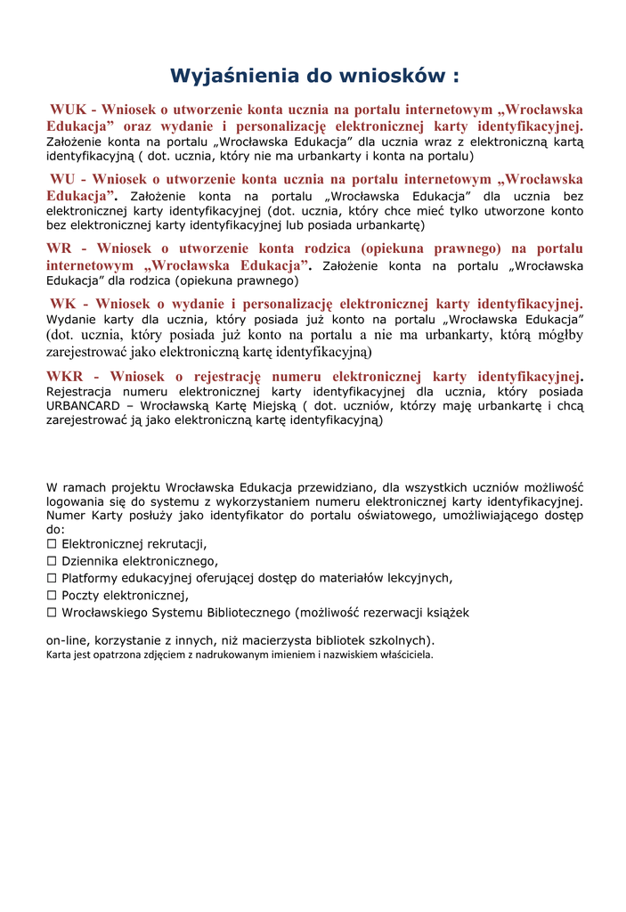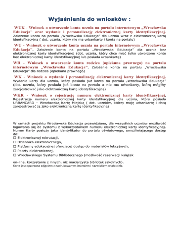Wyjaśnienia do wniosków : WUK - Wniosek o utworzenie konta ucznia na portalu internetowym „Wrocławska Edukacja” oraz wydanie i personalizację elektronicznej karty identyfikacyjnej. Założenie konta na portalu „Wrocławska Edukacja” dla ucznia wraz z elektroniczną kartą identyfikacyjną ( dot. ucznia, który nie ma urbankarty i konta na portalu) WU - Wniosek o utworzenie konta ucznia na portalu internetowym „Wrocławska Edukacja”. Założenie konta na portalu „Wrocławska Edukacja” dla ucznia bez elektronicznej karty identyfikacyjnej (dot. ucznia, który chce mieć tylko utworzone konto bez elektronicznej karty identyfikacyjnej lub posiada urbankartę) WR - Wniosek o utworzenie konta rodzica (opiekuna prawnego) na portalu internetowym „Wrocławska Edukacja”. Założenie konta na portalu „Wrocławska Edukacja” dla rodzica (opiekuna prawnego) WK - Wniosek o wydanie i personalizację elektronicznej karty identyfikacyjnej. Wydanie karty dla ucznia, który posiada już konto na portalu „Wrocławska Edukacja” (dot. ucznia, który posiada już konto na portalu a nie ma urbankarty, którą mógłby zarejestrować jako elektroniczną kartę identyfikacyjną) WKR - Wniosek o rejestrację numeru elektronicznej karty identyfikacyjnej. Rejestracja numeru elektronicznej karty identyfikacyjnej dla ucznia, który posiada URBANCARD – Wrocławską Kartę Miejską ( dot. uczniów, którzy maję urbankartę i chcą zarejestrować ją jako elektroniczną kartę identyfikacyjną) W ramach projektu Wrocławska Edukacja przewidziano, dla wszystkich uczniów możliwość logowania się do systemu z wykorzystaniem numeru elektronicznej karty identyfikacyjnej. Numer Karty posłuży jako identyfikator do portalu oświatowego, umożliwiającego dostęp do: edukacyjnej oferującej dostęp do materiałów lekcyjnych, on-line, korzystanie z innych, niż macierzysta bibliotek szkolnych). Karta jest opatrzona zdjęciem z nadrukowanym imieniem i nazwiskiem właściciela. Wzory wniosków : WUK - Wniosek o utworzenie konta ucznia na portalu internetowym „Wrocławska Edukacja” oraz wydanie i personalizację elektronicznej karty identyfikacyjnej. Założenie konta na portalu „Wrocławska Edukacja” dla ucznia wraz z elektroniczną kartą identyfikacyjną ( dot. ucznia, który nie ma urbankarty i konta na portalu) WU - Wniosek o utworzenie konta ucznia na portalu internetowym „Wrocławska Edukacja”. Założenie konta na portalu „Wrocławska Edukacja” dla ucznia bez elektronicznej karty identyfikacyjnej (dot. ucznia, który chce mieć tylko utworzone konto bez elektronicznej karty identyfikacyjnej) WR - Wniosek o utworzenie konta rodzica (opiekuna prawnego) na portalu internetowym „Wrocławska Edukacja”. Założenie konta na portalu „Wrocławska Edukacja” dla rodzica (opiekuna prawnego) WK - Wniosek o wydanie i personalizację elektronicznej karty identyfikacyjnej. Wydanie karty dla ucznia, który posiada już konto na portalu „Wrocławska Edukacja” (dot. ucznia, który posiada już konto na portalu a nie ma urbankarty, którą mógłby zarejestrować jako elektroniczną kartę identyfikacyjną) WKR - Wniosek o rejestrację numeru elektronicznej karty identyfikacyjnej. Rejestracja numeru elektronicznej karty identyfikacyjnej dla ucznia, który posiada URBANCARD – Wrocławską Kartę Miejską ( dot. uczniów, którzy maję urbankartę i chcą zarejestrować ją jako elektroniczną kartę identyfikacyjną) W ramach projektu Wrocławska Edukacja przewidziano, dla wszystkich uczniów możliwość logowania się do systemu z wykorzystaniem numeru elektronicznej karty identyfikacyjnej. Numer Karty posłuży jako identyfikator do portalu oświatowego, umożliwiającego dostęp do: siążek on-line, korzystanie z innych, niż macierzysta bibliotek szkolnych). Karta jest opatrzona zdjęciem z nadrukowanym imieniem i nazwiskiem właściciela.