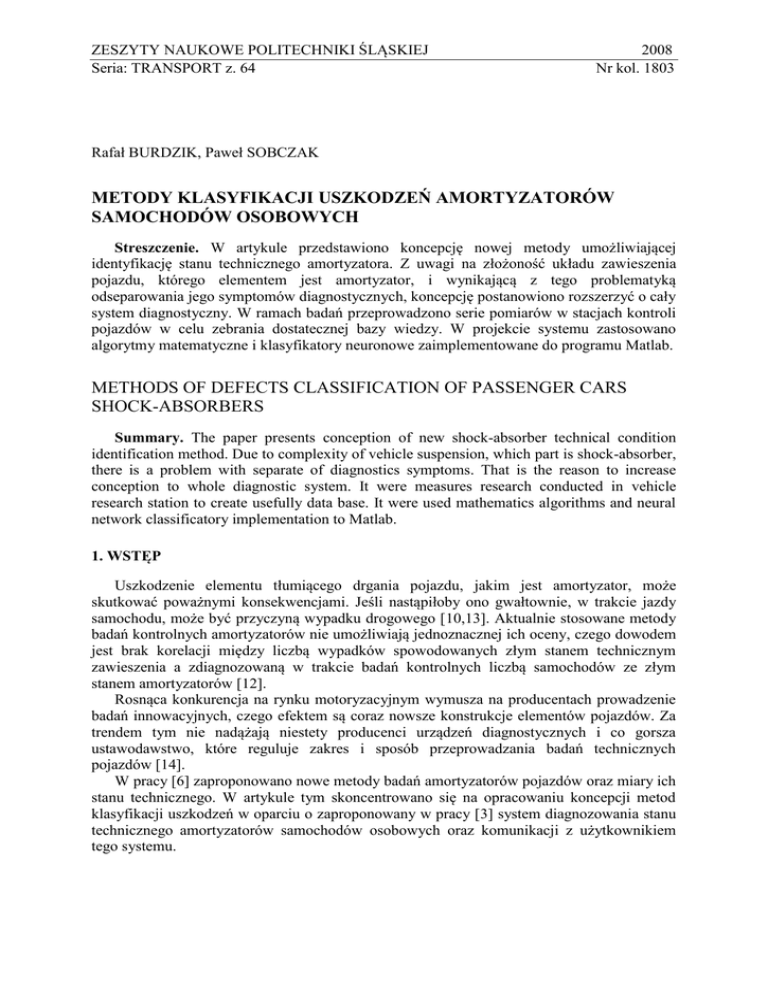 ZESZYTY NAUKOWE POLITECHNIKI ŚLĄSKIEJ Seria: TRANSPORT z. 64 2008 Nr kol. 1803 Rafał BURDZIK, Paweł SOBCZAK METODY KLASYFIKACJI USZKODZEŃ AMORTYZATORÓW SAMOCHODÓW OSOBOWYCH Streszczenie. W artykule przedstawiono koncepcję nowej metody umożliwiającej identyfikację stanu technicznego amortyzatora. Z uwagi na złożoność układu zawieszenia pojazdu, którego elementem jest amortyzator, i wynikającą z tego problematyką odseparowania jego symptomów diagnostycznych, koncepcję postanowiono rozszerzyć o cały system diagnostyczny. W ramach badań przeprowadzono serie pomiarów w stacjach kontroli pojazdów w celu zebrania dostatecznej bazy wiedzy. W projekcie systemu zastosowano algorytmy matematyczne i klasyfikatory neuronowe zaimplementowane do programu Matlab. METHODS OF DEFECTS CLASSIFICATION OF PASSENGER CARS SHOCK-ABSORBERS Summary. The paper presents conception of new shock-absorber technical condition identification method. Due to complexity of vehicle suspension, which part is shock-absorber, there is a problem with separate of diagnostics symptoms. That is the reason to increase conception to whole diagnostic system. It were measures research conducted in vehicle research station to create usefully data base. It were used mathematics algorithms and neural network classificatory implementation to Matlab. 1. WSTĘP Uszkodzenie elementu tłumiącego drgania pojazdu, jakim jest amortyzator, może skutkować poważnymi konsekwencjami. Jeśli nastąpiłoby ono gwałtownie, w trakcie jazdy samochodu, może być przyczyną wypadku drogowego [10,13]. Aktualnie stosowane metody badań kontrolnych amortyzatorów nie umożliwiają jednoznacznej ich oceny, czego dowodem jest brak korelacji między liczbą wypadków spowodowanych złym stanem technicznym zawieszenia a zdiagnozowaną w trakcie badań kontrolnych liczbą samochodów ze złym stanem amortyzatorów [12]. Rosnąca konkurencja na rynku motoryzacyjnym wymusza na producentach prowadzenie badań innowacyjnych, czego efektem są coraz nowsze konstrukcje elementów pojazdów. Za trendem tym nie nadążają niestety producenci urządzeń diagnostycznych i co gorsza ustawodawstwo, które reguluje zakres i sposób przeprowadzania badań technicznych pojazdów [14]. W pracy [6] zaproponowano nowe metody badań amortyzatorów pojazdów oraz miary ich stanu technicznego. W artykule tym skoncentrowano się na opracowaniu koncepcji metod klasyfikacji uszkodzeń w oparciu o zaproponowany w pracy [3] system diagnozowania stanu technicznego amortyzatorów samochodów osobowych oraz komunikacji z użytkownikiem tego systemu. 86 R. Burdzik, P. Sobczak 2. AKTUALNIE STOSOWANE METODY BADAŃ I OCENY (KLASYFIKACJI) AMORTYZATORÓW Aktualnie wytyczne w sprawie badań kontrolnych pojazdów w zakresie kontroli stanu zawieszenia nakazują diagnoście ocenę: - stanu i sztywności elementów sprężystych zawieszenia, - stanu i stopnia tłumienia elementów tłumiących, - luzów występujących w połączeniach, - oporów tarcia związanych z ruchem elementów zawieszenia. W czasie oceny organoleptycznej największą trudność sprawia prawidłowa ocena stanu technicznego elementów tłumiących. Natomiast ocena jego stopnia tłumienia bez zastosowania odpowiednich urządzeń jest niemożliwa. Powszechnie stosowanymi na stacjach kontroli pojazdów urządzeniami do kontroli amortyzatorów są stanowiska wykorzystujące metody drgań wymuszonych: - boge, - eusama, - eusama plus. Dwie pierwsze z wymienionych metod zostały opisane w [4,6,8]. Z uwagi na problemy z prawidłową klasyfikacją stanu technicznego różnych grup pojazdów w metodzie eusama wprowadzono dodatkowe kryteria i grupy klasyfikacji wskaźnika eusama (WE). W standardowych rozwiązaniach systemów diagnostycznych wartość współczynnika podzielona jest na 4 klasy. Klasyfikację tę przedstawiono w tablicy 1. Tablica 1 Klasyfikacja wartości WE Wartość wskaźnika WE 0 – 20% 21 – 40% 41 – 60% >60% Ocena amortyzatora Zły stan techniczny Dopuszczalna wartość tłumienia, amortyzator wymaga dodatkowego badania po wymontowaniu z pojazdu Dobra wartość tłumienia Bardzo dobra wartość tłumienia Modyfikacja klasyfikacji polegała na zastosowaniu zróżnicowania wymagań w stosunku do wartości współczynnika WE w zależności od masy pojazdu. Pojazdy podzielono na następujące grupy: grupa I – pojazdy o masie własnej powyżej 1400 [kg], grupa II – pojazdy o masie własnej w przedziale 900 – 1399 [kg], grupa III – pojazdy o masie własnej poniżej 899 [kg]. Dopuszczalne wartości wskaźnika WE dla pojazdów wymienionych grup przedstawiono w tablicy 2. Tablica 2 Dopuszczalne wartości WE Dopuszczalna wartość wskaźnika WE Numer grupy I II III Stan bardzo dobry 70 – 100% 60 – 100% 60 – 100% Stan dobry Stan dostateczny 50 – 69% 40 – 59% 30 – 59% 30 – 49% 20 – 39% 20 – 29% Stan niedostateczny 0 – 29% 0 – 19% 0 – 19% Metody klasyfikacji uszkodzeń… 87 Wymagania w stosunku do dopuszczalnej różnicy uzyskanych wyników pomiarów pomiędzy kołami jednej osi także są zróżnicowane. Dla pojazdów grup I i II różnica ta wynosi 25%, natomiast dla pojazdów grupy III – 20%. Metoda eusama plus jest rozwinięciem metody eusama. Główna cecha różniąca te metody to założenie występowania zmiennej częstotliwości rezonansowej w trakcie analizy. W systemie eusama plus proces pomiarowy można podzielić na dwa etapy: etap wstępny i etap pomiaru współczynnika tłumienia. Podczas etapu wstępnego następuje rozgrzanie oleju w amortyzatorze w celu uzyskania jego właściwej lepkości. Płyta stanowiska w tym etapie generuje wymuszenia niskoczęstotliwościowe przez około 10 sekund. Równolegle prowadzony jest pomiar ciśnienia w ogumieniu – w przypadku gdy różnica pomiędzy ciśnieniem w ogumieniu a ciśnieniem nominalnym przekracza 0,05 [MPa], pomiar zostaje przerwany. Drugi etap pracy urządzenia to pomiar współczynnika tłumienia. 