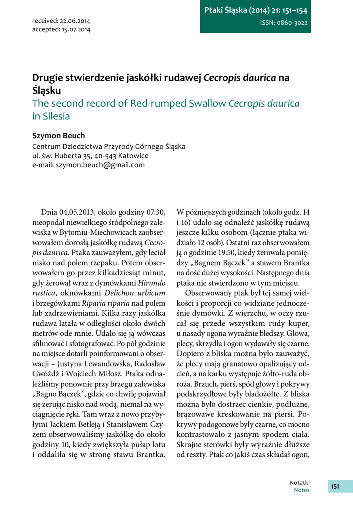 Drugie stwierdzenie jaskółki rudawej Cecropis daurica na Śląsku