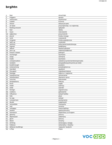 vocapp.es brghtn 1. 2. 3. 4. 5. 6. 7. 8. 9. 10. 11. 12. 13. 14. 15. 16. 17. 18. 19. 20. 21. 22. 23. 24. 25. 26. 27. 28. 29. 30. 31. 32. 33. 34. 35. 36. 37. 38. 39. 40. 41. 42. 43. 44. 45. 46. 47. 48. 49. 50. 51. 52. 53. 54. 55. 56. fear strach/lęk triggers veins/vein casket shiver at least fooling around fool noun adjective plural verb singular split up petition signed afford pick up knock it down exchange swap trade compensation random brakthrough enterprising standed thougest footage hypothermia heartbroken luxuries temptations brick wider wide foreign cookery influence tide to sag comparison doubt remarkble sad unhappy wistful homesick gloomy depressed glum down striking hideous defaces buildings a flop spusty styl/humor trumna dreszcz/ciarki przynajmniej / co najmniej zgłupieć idiota rzeczownik przymiotnik liczba mnoga czasownik liczba pojedyncza rozdzielic petycja/wniosek/skarga podpisany dawać/udzielać zabierać/odbierać potrącić wymiana zamiana wymiana zadośćuczynienie/rekompensata przypadkowy/inny/nie po kolei przełom przedsiębiorczy zgubieni najodwazniejsza zdjecia z nagrania zamarzanie złamane serce luksusowe Pokusy cegła szerszy szeroki zagraniczny gotowanie wstyd hańba pływ zwisać porównanie wątpliwość niezwykly smutny nieszczęśliwy tęskny/smutny stęskniony za krajem ponury załamany ponury smutny zwracający uwagę szkaradny / ohydny 'zepsute' budynki klapa - Página 1 - vocapp.es 57. 58. 59. 60. 61. 62. 63. 64. 65. 66. 67. 68. 69. 70. 71. 72. 73. 74. 75. 76. 77. 78. 79. 80. 81. 82. 83. 84. 85. a letdown rave mainstream alternative betray principles weigh up analyse assess poignant electrifying fast-paced creepy dull unforgetable moving horrific weak touching predictable gripping awful terrible dreadful despicable horrible atrocious horrendous abominable porażka pozytywne główny nurt coś innego oszukać Zasady ważyć się analizować oszacować wzruszający elektryzująca szybkim tempie straszny nudny niezapomniane poruszający przerażający słaby wzruszający przewidywalny trzymający w napięciu okropny / wstrętny okropny straszny podły okropny okropny straszliwy wstrętny - Página 2 - Powered by TCPDF (www.tcpdf.org)