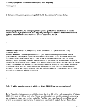 Czołowy dystrybutor chemiczno-kosmetyczny idzie na giełdę Wpisany przez Z Dariuszem Kaweckim, prezesem spółki DELKO S.A. rozmawia Tomasz Gołąb. Dlaczego spółka DELKO chce pozyskać kapitał z giełdy? Czy działalność w czasie kryzysu może być zyskowna? Jakie są plany strategiczne spółki? Na te i inne ciekawe pytania odpowiada Dariusz Kawecki, prezes spółki DELKO SA. Tomasz Gołąb/IPO.pl: W jakiej branży działa spółka DELKO i jakie wyniosła z niej doświadczenia? Dariusz Kawecki: Grupa Kapitałowa DELKO jest ogólnopolskim dystrybutorem chemii gospodarczej i kosmetyków. Spółka została założona w 1994 r. przez właścicieli kilkunastu hurtowni chemiczno-kosmetycznych z całej Polski. Przez ten czas udało nam się zdobyć wiodącą rolę w dystrybucji hurtowej produktów chemii gospodarczej, kosmetyków i artykułów higieny osobistej w tradycyjnym handlu. Dziś jesteśmy jedynym operatorem sieciowym w swojej branży, zapewniającym dostawcom dystrybucję produktów na terenie całego kraju. W ofercie posiadamy także produkty sprzedawane pod własnymi markami. Od początku działalności stawiamy przede wszystkim na jakość naszych usług i produktów, co pozwoliło nam uzyskać status lidera na rynku, w którym działamy. T.G.: W jakim stopniu segment, w którym działa DELKO jest perspektywiczny? D.K.: Wartość polskiego rynku produktów drogeryjnych to 3,5 mld zł i cały czas rośnie. W latach 2004-2008 było to 6-8% w skali roku. Można spodziewać się, że trend ten zostanie utrzymany ze względu na ciągle niski poziom wydatków Polaków na wyroby kosmetyczne, higieniczne i chemii gospodarczej w porównaniu do poziomu w rozwiniętych krajach Europy Zachodniej. 1/4 Czołowy dystrybutor chemiczno-kosmetyczny idzie na giełdę Wpisany przez T.G.: Dlaczego spółka chce wejść na rynek główny oraz na co przeznaczy pozyskany kapitał? D.K.: Nasza decyzja o wejściu na giełdę jest związana przede wszystkim ze strategicznym celem Grupy Delko, czyli umocnieniem pozycji lidera na rynku dystrybucji produktów chemiczno-kosmetycznych. Cel ten chcemy zrealizować m.in. poprzez przejęcia i akwizycję oraz rozwój organiczny, czyli zwiększenie sprzedaży produktów własnych marek oraz rozbudowę sieci salonów „Blue Drogerie". Stąd konieczność zasilenia Spółki. Środki pozyskane z emisji zamierzamy przeznaczyć także na zwiększenie kapitału obrotowego oraz zakup nowoczesnego systemu informatycznego. Jego wdrożenie usprawni procesy biznesowe, podniesie efektywność i obniży koszty. T.G.: Jakie są atuty spółki DELKO wyróżniające ją na tle konkurencji? D.K.: Delko S.A. jest największym ogólnopolskim hurtowym dystrybutorem produktów drogeryjnych. Jako jedyny operator sieciowy w swojej branży, zapewniamy dostawcom dystrybucję produktów na terenie całego kraju. Posiadamy największą sieć dystrybucyjną w Polsce, na którą składa się m.in. 13 regionalnych dystrybutorów, 15 Blue Drogerii i 45 magazynów. Mamy doświadczenie i know-how. Współpracujemy z największymi producentami kosmetyków i chemii gospodarczej, w tym m.in. z: SC Johnson, Henkel, Kimberly Clark, L'Oreal, Procter & Gamble i inne. Jako jedyni pośród naszych konkurentów sprzedajemy produkty pod własnymi markami. T.G.: Dlaczego inwestorzy powinni kupić akcje spółki DELKO? D.K.: Powodów, dla których warto zainwestować w naszą Spółkę jest oczywiście bardzo wiele, niemniej jednak ja pozwolę sobie wskazać na kilka najistotniejszych z punktu widzenia potencjalnych inwestorów. Przede wszystkim Grupa Kapitałowa DELKO to lider na rynku dystrybucji produktów drogeryjnych, z 11% udziałem w rynku wartym ponad 3,5 mld zł. Działamy w bardzo perspektywicznej branży, której wartość rośnie z roku na rok niezależnie od koniunktury gospodarczej. Współpracujemy z tak renomowanymi partnerami handlowymi, jak m.in. HENKEL, L'OREAL, NIVEA, S.C.JOHNSON, KIMBERLY CLARK, METSA TISSUE, TZMO, GLOBAL czy INCO VERITAS. Stoi za nami wieloletni stabilny wzrost wyników finansowych (roczna dynamika wzrostu przychodów w ostatnich 4 latach to ponad 27%, zysku 2/4 Czołowy dystrybutor chemiczno-kosmetyczny idzie na giełdę Wpisany przez netto ponad 43%), doświadczenie oraz know-how. Mamy efektywną i przejrzystą strategię działania, a to pozwala mi twierdzić, że inwestycja w Delko S.A. będzie udana. T.G.: Jakie są plany i założenia długoterminowej strategii spółki? D.K.: Celem strategicznym Delko jest umacnianie pozycji lidera rynku produktów drogeryjnych w Polsce. By to osiągnąć, chcemy konsolidować rynek, w którym działamy poprzez akwizycje i przejęcia firm o podobnym profilu. Ale inwestujemy też w rozwój organiczny. Planujemy zwiększyć sprzedaż produktów marek własnych. Obecnie jest ich dziewięć, ale naszą ofertę chcemy systematycznie powiększać zarówno jeśli chodzi o asortyment istniejących już marek, jak i tworzenie nowych. Planujemy też rozwijać sieć sprzedaży w segmencie detalicznym, m.in. poprzez rozbudowę sieci salonów pod marką DELKO S.A. - „BLUE DROGERIE". Dziś działa 15 takich drogerii, docelowo ma ich być 70. T.G.: Czy spółka planuje rozszerzenie działalności na inne segmenty rynku? D.K.: W najbliższych latach chcemy się skupić na tych obszarach rynku, na których już jesteśmy obecni. W miarę rozwoju firmy nie wykluczamy jednak rozszerzenia naszej działalności na nowe segmenty. T.G.: Czy kryzys finansowy odcisnął piętno na działalności spółki? D.K.: Branża chemiczno-kosmetyczna w Polsce nie odczuła skutków obecnego kryzysu finansowego. Jest to związane z dużym opóźnieniem Polaków w zakresie wydatków na wyroby kosmetyczno-chemiczne w porównaniu do poziomu w rozwiniętych krajach Europy Zachodniej. Zauważalny jest także tzw. efekt szminki. Polega on na tym, że w czasach kryzysu, kiedy ograniczamy wydatki i np. wstrzymujemy się z zakupem nowego samochodu, rekompensujemy sobi
