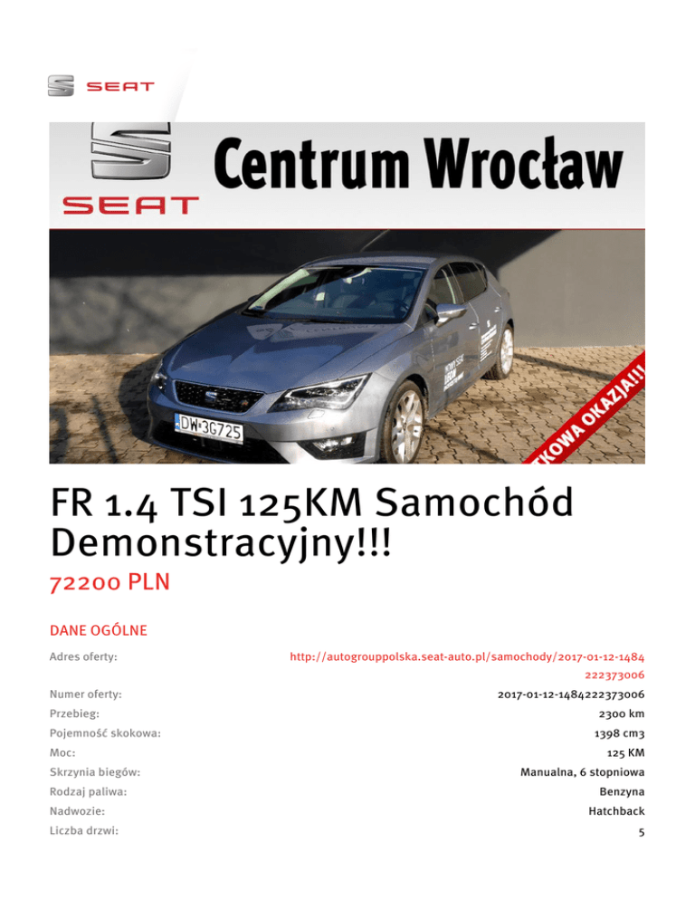 FR 1.4 TSI 125KM Samochód Demonstracyjny!!! 72200 PLN DANE OGÓLNE Adres oferty: http://autogrouppolska.seat-auto.pl/samochody/2017-01-12-1484 222373006 Numer oferty: Przebieg: Pojemność skokowa: Moc: Skrzynia biegów: Rodzaj paliwa: Nadwozie: Liczba drzwi: 2017-01-12-1484222373006 2300 km 1398 cm3 125 KM Manualna, 6 stopniowa Benzyna Hatchback 5 Liczba miejsc: 5 Kolor: Moonstone Silver Rok produkcji: 2016 WYPOSAŻENIE / ABS / Alufelgi / ASR (kontrola trakcji) / Asystent pasa ruchu / CD / Centralny zamek / Czujnik deszczu / Czujnik zmierzchu / Czujniki parkowania przednie / Czujniki parkowania tylne / Elektrochromatyczne lusterko wsteczne / Elektryczne szyby przednie / Elektryczne szyby tylne / Elektrycznie ustawiane lusterka / ESP (stabilizacja toru jazdy) / Gniazdo AUX / Gniazdo SD / Gniazdo USB / Immobilizer / Isofix / Kamera cofania / Klimatyzacja automatyczna / Klimatyzacja dwustrefowa / Komputer pokładowy / Kurtyny powietrzne / MP3 / Ogranicznik prędkości / Podgrzewane lusterka boczne / Podgrzewane przednie siedzenia / Poduszka powietrzna chroniąca kolana / Poduszka powietrzna kierowcy / Poduszka powietrzna pasażera / Poduszki boczne przednie / Przyciemniane szyby / Radio fabryczne / Światła do jazdy dziennej / Światła LED / Światła przeciwmgielne / System Start-Stop / Tempomat / Tempomat aktywny / Wielofunkcyjna kierownica / Wspomaganie kierownicy OPIS Autoryzowany Dealer SEAT Auto Group Polska Sp. z o.o. Sp. K.SEAT Leon FR 1.4 TSI 125KM Samochód demonstracyjny Wyposażenie: • ESC z ABS, ASR i EBA • XDS i asystent podjazdu pod wzniesienia • 7 poduszek powietrznych • Dezaktywacja poduszki powietrznej pasażera • Automatyczna klimatyzacja dwustrefowa Climatronic • 18-calowe felgi aluminiowe Performance • System przypominający o obowiązku zapinania pasów bezpieczeństwa przy przednich fotelach • ISOFIX • Automatyczny hamulec pokolizyjny • System kontroli ciśnienia powietrza w oponach • Centralny zamek • Elektrycznie sterowane szyby boczne z przodu i z tyłu • Elektrycznie regulowane, podgrzewane i składane lusterka boczne • Pełne światła LED, światła do jazdy dziennej LED, światła tylne LED, oświetlenie tablicy rejestracyjnej w technologii LED • Przyciemniane szyby • Przednie światła przeciwmgielne • Przednie fotele sportowe • Czarno-czerwona tapicerka ze skóry ekologicznej i tkaniny • Fotel kierowcy i pasażera z regulacją wysokości i podparcia odcinka lędźwiowego • Podłokietnik z przodu • Dywaniki materiałowe z przodu i z tyłu • Uchwyt na napoje w przedniej konsoli • Rozbudowana tablica przyrządów z elementami chromowanymi i ekranem 3,5"; TFT • SEAT Drive Profile: 4 profile jazdy umożliwiające zmianę reakcji silnika, wspomagania kierownicy, oświetlenia wewnątrz pojazdu • Sportowe przednie fotele wykonane w połączeniu tkaniny i skóry ekologicznej • Dojazdowe koło zapasowe • Sportowe zawieszenie FR • Sportowa kierownica wielofunkcyjna z logo FR i dźwignia hamulca ręcznego obszyte skórą z czerwonymi przeszyciami • Pakiet Techno+: kamera cofania, system multimedialny Media System Plus z 6,5-calowym ekranem dotykowym, radiem, wejściami USB i Aux oraz systemem Bluetooth, Pakiet wspomagania jazdy (Asystent świateł drogowych, Asystent pasa ruchu), Pakiet praktyczny (czujnik deszczu, czujnik zmierzchu, funkcja „Coming and leaving home”, automatycznie ściemniające się lusterko wsteczne) • Pakiet Comfort+: czujniki parkowania z przodu i z tyłu, aktywny tempomat, pakiet zimowy (podgrzewane przednie fotele, spryskiwacze reflektorów, podgrzewane dysze spryskiwaczy szyby) • System Full Link • Lakier metalizowany Moonstone SilverCena katalogowa: 96 631 zł Upust: 24 431 złSzczegółowe informacje o ofercie u sprzedawcy: - Adrian Papiór 885 800 338 - Agnieszka Zamiara 885 800 332 Ogłoszenie jest ważne do czasu sprzedaży danego pojazdu.Zapraszamy: SEAT Centrum Wrocławul. Karkonoska 59A53-015 WrocławNiniejsze ogłoszenie jest wyłącznie informacją handlową i nie stanowi oferty w myśl art. 66, § 1. Kodeksu Cywilnego. Sprzedający nie odpowiada za ewentualne błędy lub nieaktualność ogłoszenia
