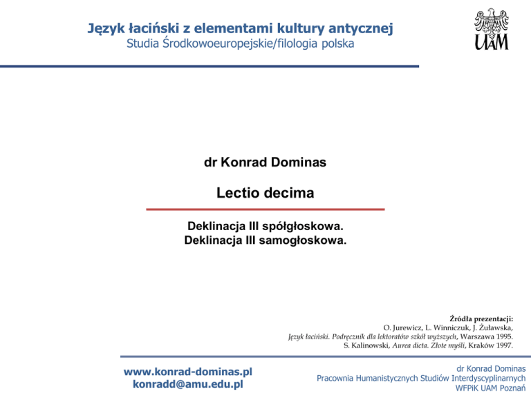 Język łaciński z elementami kultury antycznej Studia Środkowoeuropejskie/filologia polska dr Konrad Dominas Lectio decima Deklinacja III spółgłoskowa. Deklinacja III samogłoskowa. Źródła prezentacji: O. Jurewicz, L. Winniczuk, J. Żuławska, Język łaciński. Podręcznik dla lektoratów szkół wyższych, Warszawa 1995. S. Kalinowski, Aurea dicta. Złote myśli, Kraków 1997. www.konrad-dominas.pl [email protected] dr Konrad Dominas Pracownia Humanistycznych Studiów Interdyscyplinarnych WFPiK UAM Poznań Język łaciński z elementami kultury antycznej Studia Środkowoeuropejskie/filologia polska Lectio decima Trzy sentencje łacińskie Civis Romanus sum Jestem obywatelem rzymskim Cogitationis poenam nemo patitur Nikt nie ponosi odpowiedzialności za swoje myśli Ulpian, Digesta 48,19,18 Convenienter naturae vivere Żyć zgodnie z naturą Diogenes Laertios, Żywoty i poglądy sławnych filozofów 7,87. www.konrad-dominas.pl [email protected] dr Konrad Dominas Pracownia Humanistycznych Studiów Interdyscyplinarnych WFPiK UAM Poznań Język łaciński z elementami kultury antycznej Studia Środkowoeuropejskie/filologia polska Lectio decima Zwroty i skróty in persona osobiście in promptu natychmiast, na poczekaniu, od ręki in spe w nadziei, w przyszłości in statu nascendi w stanie rodzenia się, w chwili powstania interim tymczasowo www.konrad-dominas.pl [email protected] dr Konrad Dominas Pracownia Humanistycznych Studiów Interdyscyplinarnych WFPiK UAM Poznań Język łaciński z elementami kultury antycznej Studia Środkowoeuropejskie/filologia polska Lectio decima Deklinacja III spółgłoskowa abl. sing. –e; acc., voc., pl. neutr. –a; gen. pl. –um Według deklinacji III spółgłoskowej odmieniają się rzeczowniki nierównozgłoskowe rodzaju męskiego, żeńskiego i nijakiego, których temat kończy się na spółgłoskę oraz kilka rzeczowników równozgłoskowych. Rzeczowni deklinacji III spółgłoskowej równozgłoskowe: • pater, patris m – ojciec; • mater, matris f – matka; • frater, fratris m – brat; • vates, vatis m/f – wieszcz; www.konrad-dominas.pl [email protected] • • • iuvenis, iuvenis m/f – młodzieniec, młoda dziewczyna; senex, senis m – starzec; canis, canis m/f – pies, suka. dr Konrad Dominas Pracownia Humanistycznych Studiów Interdyscyplinarnych WFPiK UAM Poznań Język łaciński z elementami kultury antycznej Studia Środkowoeuropejskie/filologia polska Lectio decima Deklinacja III spółgłoskowa – odmiana Masculinum Femininum Neutrum Singularis Pluralis Singularis Pluralis Singularis Pluralis N. imperator imperator-es lex leg-es nomen nomin-a G. imperator-is imperator-um leg-is leg-um nomin-is nomin-um D. imperator-i imperator-ibus leg-i leg-ibus nomin-i nomin-ibus Acc. imperator-em imperator-es leg-em leg-es nomen nomin-a Abl. imperator-e imperator-ibus leg-e leg-ibus nomin-e nomin-ibus imperator imperator-es lex leg-es nomen nomin-a V. www.konrad-dominas.pl [email protected] dr Konrad Dominas Pracownia Humanistycznych Studiów Interdyscyplinarnych WFPiK UAM Poznań Język łaciński z elementami kultury antycznej Studia Środkowoeuropejskie/filologia polska Lectio decima Deklinacja III samogłoskowa – odmiana abl. sing. -i; acc., voc., pl. neutr. -i-a; gen. pl. -i-um Neutrum Singularis Pluralis N. vectigal vectigali-a G. vectigalis vectigali-um D. vectigali vectigali-bus Acc. vectigal vectigali-a Abl. vectigali vectigali-bus V. vectigal vectigali-a www.konrad-dominas.pl [email protected] Według deklinacji III samogłoskowej odmieniają się rzeczowniki rodzaju nijakiego zakończone w nom. sing. na -e, -al, -ar, np. mare (morze); vectigal (podatek); exemplar (przykład) dr Konrad Dominas Pracownia Humanistycznych Studiów Interdyscyplinarnych WFPiK UAM Poznań