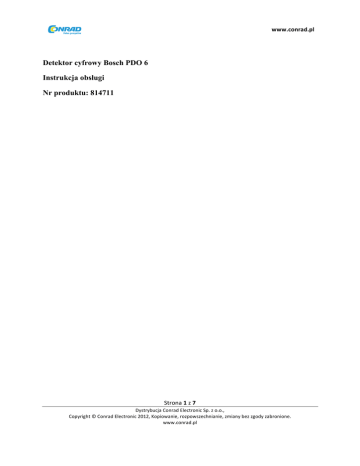 www.conrad.pl Detektor cyfrowy Bosch PDO 6 Instrukcja obsługi Nr produktu: 814711 Strona 1 z 7 Dystrybucja Conrad Electronic Sp. z o.o., Copyright © Conrad Electronic 2012, Kopiowanie, rozpowszechnianie, zmiany bez zgody zabronione. www.conrad.pl www.conrad.pl Strona 2 z 7 Dystrybucja Conrad Electronic Sp. z o.o., Copyright © Conrad Electronic 2012, Kopiowanie, rozpowszechnianie, zmiany bez zgody zabronione. www.conrad.pl www.conrad.pl Opis działania Prawidłowe działanie przyrządu pomiarowego jest możliwie tylko po uprzednim zapoznaniu się z instrukcją działania oraz ścisłym zastosowaniu się do podanych w niej wskazówek. NALEŻY ZACHOWAĆ INSTRUKCJĘ. Użytkowanie zgodnie z przeznaczeniem Przyrząd pomiarowy jest przeznaczony do wykrywania metali żelaznych i nieżelaznych oraz przewodów elektrycznych pod napięciem w ścianach, sufitach i podłogach. Przedstawione komponenty graficzne Numeracja przedstawionych komponentów odnosi się do schematu urządzenia znajdującego się na stronie graficznej. 1. Dioda ( w kształcie pierścienia) 2. Otwór zaznaczania 3. Wyświetlacz 4. Włącznik/ Wyłącznik 5. Zakres czujnika 6. Pokrywa baterii 7. Blokada pokrywy baterii Elementy wyświetlacza a. Wskaźnik zużycia baterii b. Wskaźnik przewodów pod napięciem c. Wskaźnik pomiaru d. Wskaźnik kalibrowania ‘AutoCal’ Dane techniczne Detektor cyfrowy Numer katalogowy PDO 6 3 603 K10 100 Maksymalna głębokość pomiaru*: Strona 3 z 7 Dystrybucja Conrad Electronic Sp. z o.o., Copyright © Conrad Electronic 2012, Kopiowanie, rozpowszechnianie, zmiany bez zgody zabronione. www.conrad.pl www.conrad.pl - Metale żelazne 60 mm - Metale nieżelazne (rury miedziane) 50 mm - Przewody miedziane pod napięciem 30mm Automatyczny wyłącznik po około 10 min Temperatura działania -10°C…+50°C Temperatura przechowywania -20°C…+70°C Bateria 1 x 9 V 6LR61 Akumulator 1 x 9 V 6F22 Czas pracy ( baterii alkaliczno – manganowych) około 6h Ciężar zgodny z EPTA-Procedure 01/2003 0,2 kg *zależy od materiału i rozmiaru przedmiotu oraz jego stanu i struktury ** mniejsza głębokość pomiaru dla kabli i przewodów pod napięciem Należy zwrócić uwagę na numer katalogowy na tabliczce znamionowej Państwa przyrządu pomiarowego. Nazwy handlowe poszczególnych przyrządów pomiarowych mogą się różnić. Montaż Wkładanie/ wymiana baterii Należy używać tylko baterii alkaiczno – manganowych lub akumulatorów. Aby otworzyć pokrywę baterii 6, należy wcisnąć blokadę 7 w kierunku strzałki, następnie można zdjąć pokrywę. Włożyć do wnęki załączone do zestawu baterie. Należy zachować poprawną biegunowość baterii zgodnie ze schematem wewnątrz wnęki. Gdy wskaźnik zużycia baterii a zaświeci się na wyświetlaczu, to przy użyciu baterii alkaiczno – manganowych pomiar jest możliwy przez około godzinę ( krótszy czas użytkowania przy akumulatorach). Kiedy wskaźnik zużycia baterii a zaczyna migać, dokonywanie pomiaru jest możliwe przez jeszcze około 10 minut. Kiedy zarówno wskaźnik zużycia baterii a oraz dioda ( w kształcie pierścienia) 1 ( czerwona) zaczynają migać, dokonywanie pomiarów nie jest już możliwe i należy wymienić baterię. Jeżeli urządzenie pomiarowe jest nieużywane przez dłuższy czas, należy wyjąć z niego baterię. Bateria może ulec korozji lub rozładowaniu nie będąc przez dłuższy czas w użyciu. Strona 4 z 7 Dystrybucja Conrad Electronic Sp. z o.o., Copyright © Conrad Electronic 2012, Kopiowanie, rozpowszechnianie, zmiany bez zgody zabronione. www.conrad.pl www.conrad.pl Praca urządzenia Włączenie Należy chronić urządzenie pomiarowe przed wilgocią oraz bezpośrednim promieniowaniem słonecznym. Włączanie/ Wyłączanie Przed włączeniem urządzenia pomiarowego należy upewnić się że okolice czujnika nie uległy zawilgoceniu. Jeżeli tak, należy osuszyć urządzenie przy użyciu ściereczki. Jeżeli urządzanie pomiarowe zostało poddane dużym wahaniom temperatury, należy przed włączeniem pozwolić powrócić mu do normalnej temperatury. Aby włączyć urządzenie pomiarowe, należy przycisnąć włącznik/ wyłącznik 4. Po dokonaniu krótkiego auto- testu urządzenie pomiarowe jest gotowe do działania. Gotowość do działania jest sygnalizowania pojawieniem się haczyka ze wskaźnikiem kalibrowania ‘AutoCal’ d. Aby wyłączyć urządzenie pomiarowe, należy przycisnąć włącznik/ wyłącznik 4. Aby przedłużyć trwałość baterii, urządzenie pomiarowe wyłącza się automatycznie po około 10 min, kiedy nie są dokonywane pomiary. Strona 5 z 7 Dystrybucja Conrad Electronic Sp. z o.o., Copyright © Conrad Electronic 2012, Kopiowanie, rozpowszechnianie, zmiany bez zgody zabronione. www.conrad.pl www.conrad.pl Rodzaje pracy Urządzenie pomiarowe wykrywa obiekty znajdujące się w zasięgu czujnika 5. Wykrywanie obiektów metalowych Po włączeniu dioda w kształcie pierścienia 1, zapala się na zielono. Przyłóż urządzenie pomiarowe do przeszukiwanej powierzchni i poruszaj nim na boki. Kiedy dioda w kształcie pierścienia świeci na zielono i nie słychać żadnego sygnału dźwiękowego, oznacza to że nie wykryto metalowych obiektów pod powierzchnią. Zbliżając urządzenie pomiarowe do metalowego obiektu, wychylenie wartości pomiaru c wzrasta. Kiedy urządzenie pomiarowe znajduję się nad metalowym obiektem, wtedy dioda w kształcie pierścienia 1 świeci na czerwono i rozbrzmiewa sygnał dźwiękowy. Poruszając się po powierzchni po raz pierwszy, pozycja metalowego obiektu może zostać wskazana w przybliżeniu. Poruszając kilkakrotnie nad metalowym obiektem ( nie podnosząc urządzenia z powierzchni), pozycja metalowego obiektu może zostać wskazana dokładnie: kiedy dioda w kształcie pierścienia świeci na czerwono i rozbrzmiewa sygnał dźwiękowy, oznacza to że metalowy obiekt znajduję się poniżej na środku czujnika ( poniżej otworu zaznaczania 2). Wykrywani