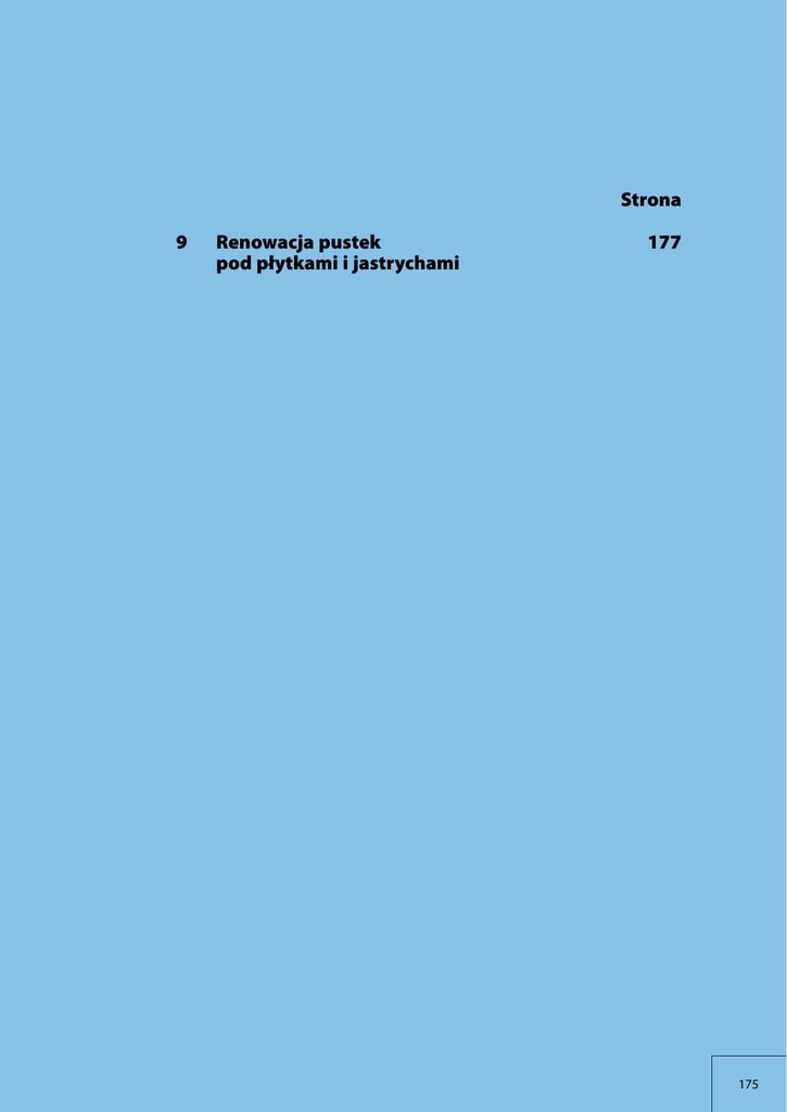 Strona 9 Renowacja pustek pod płytkami i jastrychami 177 175 Renowacja pustek pod płytkami i jastrychami 9 Soprodur® – środek iniekcyjny do wypełniania pustek pod płytkami ceramicznymi Często okładziny ceramiczne, kamienne lub jastrychy odspajają się od podłoża. Wymaga to podjęcia pracochłonnych środków naprawczych, które przeważnie prowadzą do kompletnej renowacji. Jest ona kosztowna i zazwyczaj oznacza wyłączenie pomieszczeń z użytkowania. Alternatywę dla tego kosztownego i czasochłonnego rozwiązania stanowi częściowa renowacja posiadanej okładziny podłogowej. Uszkodzenia zostaną wtedy naprawione bez usuwania czy niszczenia okładziny. Oznacza to ogromną redukcję kosztów, a istniejąca okładzina pozostanie optycznie nienaruszona. Warunkiem jest, aby zastosowana zawiesina samoistnie, względnie pod ciśnieniem mogła się rozprzestrzenić pod okładziną, docierając do wypełnianej pustki. Jest to możliwe do ustalenia i ocenienia, dzięki wcześniej przeprowadzonej próbie iniekcji. Usuwanie uszkodzeń (pustek pod płytkami) Przy użyciu cementowej zaprawy iniekcyjnej, która jest wytwarzana z mikrocementów, wypełniane są drobne pęknięcia w klejowej zaprawie cienkowarstwowej, pory w zaprawie grubowarstwowej i puste przestrzenie w jastrychu. Pustki pod okładziną ceramiczną. Porównanie wielkości ziaren „normalne” ziarna cementu 0,04 mm ziarna cementu drobnoziarnistego 0,0095 mm Zalety technologii Soprodur®: ● nie jest potrzebna całkowita renowacja ● brak materiału rozbiórkowego ● brak przestojów ● powierzchnie nadają się do użytku już na następny dzień Porowaty jastrych cementowy z otwartymi porami. Spójna struktura po zastosowaniu zaprawy iniekcyjnej do usuwania pustek pod płytkami Sopro Soprodur®. 177 Renowacja pustek pod płytkami i jastrychami 9 Soprodur® – środek iniekcyjny do wypełniania pustek pod płytkami ceramicznymi 1. Technika zalewania Technika zalewania jest najprostszym sposobem pozbycia się ubytków. Wymieszany materiał wlewa się przez otwarte fugi do uprzednio nawilżonych pustek. Materiał wlewa się tak długo, aż pustki się całkowicie zapełnią. Nadmiar substancji usuwa się wilgotną gąbką. Zastygłą substancję usuwa się z fug, które następnie wypełnia się zaprawą fugową. płytka ceramiczna zaprawa do układania / jastrych beton Wypełnianie przez otwartą fugę. 2. Technika wtryskiwania Przy pomocy strzykawki ręcznej substancja iniekcyjna może zostać wstrzyknięta szybko i dokładnie przez otwarte fugi lub specjalnie nawiercone otwory. Przy użyciu odpowiednich strzykawek, pustki mogą być wypełniane pod ciśnieniem do 2 barów. płytka ceramiczna Wpompowywanie środka iniekcyjnego za pomocą strzykawki ręcznej, w przypadku małych powierzchni. zaprawa do układania / jastrych beton 178 Renowacja pustek pod płytkami i jastrychami 9 Soprodur® – środek iniekcyjny do wypełniania pustek pod płytkami ceramicznymi 3. Technika iniekcji Jeżeli uprzednio omawiane techniki okażą się nie wystarczające, należy zastosować technikę iniekcji. Substancja iniekcyjna jest wówczas wstrzykiwana pod ciśnieniem do 15 barów. płytka ceramiczna Aby substancja iniekcyjna nie wylewała się w innych miejscach, należy wkręcić siłowo tzw. gniazda. Liczba otworów do wywiercenia i gniazd do zastosowania jest zależna od rodzaju konstrukcji i wielkości ubytków (ok. 1-5 otworów/m2). zaprawa do układania / jastrych Wstrzykiwanie za pomocą techniki iniekcyjnej (15 barów). Wybór właściwego gniazda Gniazda do płytek okładzinowych iniekcja pierścień uszczelniający płytka ceramiczna zaprawa do układania płytek beton W przypadku pustek pod płytkami i płytami zalecamy zastosować gniazda do płytek okładzino wych, przez które środek iniekcyjny wydostaje się specjalnymi otworkami po bokach gniazda. Do wypełniania pustek pod płytkami, powstałymi przy zastosowaniu zapraw grubowarstwowych lub do wypełniania pustek pod jastrychami, należy zastosować gniazda do zapraw ze szczeliną iniekcyjną u dołu gniazda. Do gniazd podłącza się pompkę iniekcyjną, która pod ciśnieniem do 15 barów wstrzykuje sub stancję iniekcyjną do miejsc występowania pustek. Przed iniekcją lub wstrzykiwaniem – pustki należy zwilżyć wodą za pomocą tej samej pompki. Po wypełnieniu pustych przestrzeni, płytki należy obciążyć (paczką z płytkami, workiem zapra wy), usunąć gniazda i wyczyścić wodą. wkładka uszczelniająca jastrych podłoże betonowe Gniazda do zapraw iniekcja pierścień uszczelniający płytka ceramiczna warstwa kontaktowa wkładka uszczelniająca zaprawa 179 Renowacja pustek pod płytkami i jastrychami 9 Soprodur® – środek iniekcyjny do wypełniania pustek pod płytkami ceramicznymi Wskazówki: Sopro Soprodur® – narzędzia: ● Pustki należy wcześniej zlokalizować (np. opukując płytki) i odpowiednio oznaczyć. ● W przypadku jastrychów na war- stwach rozdzielających należy zwrócić uwagę, by substancja nie dostała się w obszary izolacji, dylatacji brzegowych lub innych wolnych przestrzeni np. przez przeciekające lub nieprofesjonalnie wykonane uszczelnienia albo dylatacje brzegowe. Oznaką tego może być zbyt duże zużycie materiału. Zestaw do mieszania. Sopro Soprodur® Środek iniekcyjny ● Przy ogrzewaniu podłogowym nale- ży zwrócić uwagę, aby nie uszkodzić przewodów grzewczych podczas nawiercania otworów na gniazda. ● Środek iniekcyjny Soprodur® nie jest przeznaczony do podłoży wrażliwych na wilgoć (np. do podłoży drewnianych). Strzykawka ręczna. Pompka iniekcyjna, zestaw końcówek wtryskowych. Gniazda do płytek okładzinowych 6 i 8 mm. Gniazda do zapraw 6 i 8 mm. Modernizacja powierzchni pionowych* Pustki powietrzne pod płytkami na ścianie mogą być również wypełniane i trwale naprawiane. * Jeżeli renowacji podlegają pustki pod płytkami na powierzchni ściany, należy je również zl