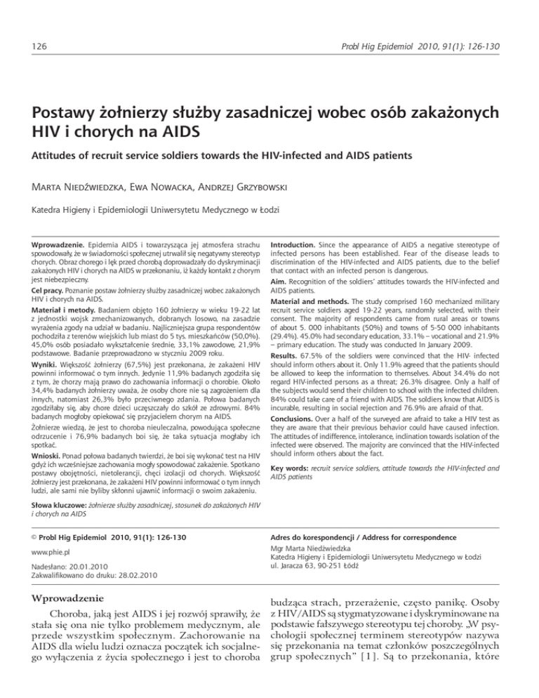 126 Probl Hig Epidemiol 2010, 91(1): 126-130 Postawy żołnierzy służby zasadniczej wobec osób zakażonych HIV i chorych na AIDS Attitudes of recruit service soldiers towards the HIV-infected and AIDS patients Marta Niedźwiedzka, Ewa Nowacka, Andrzej Grzybowski Katedra Higieny i Epidemiologii Uniwersytetu Medycznego w Łodzi Wprowadzenie. Epidemia AIDS i towarzysząca jej atmosfera strachu spowodowały, że w świadomości społecznej utrwalił się negatywny stereotyp chorych. Obraz chorego i lęk przed chorobą doprowadzały do dyskryminacji zakażonych HIV i chorych na AIDS w przekonaniu, iż każdy kontakt z chorym jest niebezpieczny. Cel pracy. Poznanie postaw żołnierzy służby zasadniczej wobec zakażonych HIV i chorych na AIDS. Materiał i metody. Badaniem objęto 160 żołnierzy w wieku 19-22 lat z jednostki wojsk zmechanizowanych, dobranych losowo, na zasadzie wyrażenia zgody na udział w badaniu. Najliczniejsza grupa respondentów pochodziła z terenów wiejskich lub miast do 5 tys. mieszkańców (50,0%). 45,0% osób posiadało wykształcenie średnie, 33,1% zawodowe, 21,9% podstawowe. Badanie przeprowadzono w styczniu 2009 roku. Wyniki. Większość żołnierzy (67,5%) jest przekonana, że zakażeni HIV powinni informować o tym innych. Jedynie 11,9% badanych zgodziła się z tym, że chorzy mają prawo do zachowania informacji o chorobie. Około 34,4% badanych żołnierzy uważa, że osoby chore nie są zagrożeniem dla innych, natomiast 26,3% było przeciwnego zdania. Połowa badanych zgodziłaby się, aby chore dzieci uczęszczały do szkół ze zdrowymi. 84% badanych mogłoby opiekować się przyjacielem chorym na AIDS. Żołnierze wiedzą, że jest to choroba nieuleczalna, powodująca społeczne odrzucenie i 76,9% badanych boi się, że taka sytuacja mogłaby ich spotkać. Wnioski. Ponad połowa badanych twierdzi, że boi się wykonać test na HIV gdyż ich wcześniejsze zachowania mogły spowodować zakażenie. Spotkano postawy obojętności, nietolerancji, chęci izolacji od chorych. Większość żołnierzy jest przekonana, że zakażeni HIV powinni informować o tym innych ludzi, ale sami nie byliby skłonni ujawnić informacji o swoim zakażeniu. Introduction. Since the appearance of AIDS a negative stereotype of infected persons has been established. Fear of the disease leads to discrimination of the HIV-infected and AIDS patients, due to the belief that contact with an infected person is dangerous. Aim. Recognition of the soldiers’ attitudes towards the HIV-infected and AIDS patients. Material and methods. The study comprised 160 mechanized military recruit service soldiers aged 19-22 years, randomly selected, with their consent. The majority of respondents came from rural areas or towns of about 5. 000 inhabitants (50%) and towns of 5-50 000 inhabitants (29.4%). 45.0% had secondary education, 33.1% – vocational and 21.9% – primary education. The study was conducted In January 2009. Results. 67.5% of the soldiers were convinced that the HIV- infected should inform others about it. Only 11.9% agreed that the patients should be allowed to keep the information to themselves. About 34.4% do not regard HIV-infected persons as a threat; 26.3% disagree. Only a half of the subjects would send their children to school with the infected children. 84% could take care of a friend with AIDS. The soldiers know that AIDS is incurable, resulting in social rejection and 76.9% are afraid of that. Conclusions. Over a half of the surveyed are afraid to take a HIV test as they are aware that their previous behavior could have caused infection. The attitudes of indifference, intolerance, inclination towards isolation of the infected were observed. The majority are convinced that the HIV-infected should inform others about the fact. Key words: recruit service soldiers, attitude towards the HIV-infected and AIDS patients Słowa kluczowe: żołnierze służby zasadniczej, stosunek do zakażonych HIV i chorych na AIDS © Probl Hig Epidemiol 2010, 91(1): 126-130 www.phie.pl Nadesłano: 20.01.2010 Zakwalifikowano do druku: 28.02.2010 Wprowadzenie Choroba, jaką jest AIDS i jej rozwój sprawiły, że stała się ona nie tylko problemem medycznym, ale przede wszystkim społecznym. Zachorowanie na AIDS dla wielu ludzi oznacza początek ich socjalnego wyłączenia z życia społecznego i jest to choroba Adres do korespondencji / Address for correspondence Mgr Marta Niedżwiedzka Katedra Higieny i Epidemiologii Uniwersytetu Medycznego w Łodzi ul. Jaracza 63, 90-251 Łódź budząca strach, przerażenie, często panikę. Osoby z HIV/AIDS są stygmatyzowane i dyskryminowane na podstawie fałszywego stereotypu tej choroby. „W psychologii społecznej terminem stereotypów nazywa się przekonania na temat członków poszczególnych grup społecznych” [1]. Są to przekonania, które Niedźwiedzka M, Nowacka E, Grzybowski A. Postawy żołnierzy służby zasadniczej wobec osób zakażonych HIV ... odzwierciedlają naszą opinię o innych. Przykładem stereotypu jest przekonanie, że osoby chore na AIDS są niebezpieczne dla otoczenia i należy je izolować. Dla osoby, która na podstawie testu na obecność HIV dowiaduje się, że jest seropozytywna, jedną z pierwszych decyzji, jakie musi podjąć jest to, czy powiedzieć o tym rodzinie. Osoby te obawiają się przede wszystkim odrzucenia i izolacji, więc ujawnienie choroby nie jest łatwe i dlatego wokół HIV/AIDS istnieje zwykle milczenie. Z badań ankietowych przeprowadzonych przez Wojciechowską w latach 1996-1997 wynika, że 62,8% respondentów zakażonych HIV, w tym trzy razy więcej mężczyzn niż kobiet, odbierało stosunek społeczeństwa do chorych na HIV/AIDS jako wrogi. Ponad połowa ankietowanych osób (53,2%) czuła się dyskryminowana i osamotniona w społeczeństwie. Jedynie 11% respondentów oceniło postawę społeczeństwa, jako przyjazną, a 26% jako obojętną [2]. Kwestią priorytetową w walce z tą chorobą n