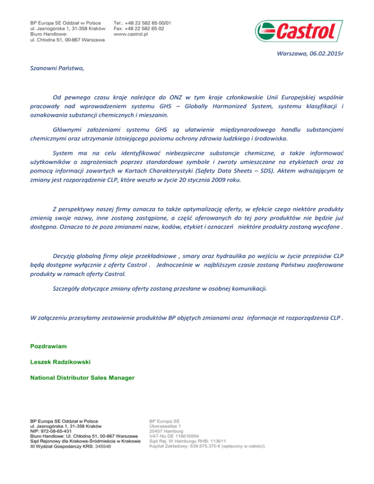 BP Europa SE Oddział w Polsce ul. Jasnogórska 1, 31-358 Kraków Biuro Handlowe: ul. Chłodna 51, 00-867 Warszawa Tel.: +48 22 582 65 00/01 Fax: +48 22 582 65 02 www.castrol.pl Warszawa, 06.02.2015r Szanowni Państwo, Od pewnego czasu kraje należące do ONZ w tym kraje członkowskie Unii Europejskiej wspólnie pracowały nad wprowadzeniem systemu GHS – Globally Harmonized System, systemu klasyfikacji i oznakowania substancji chemicznych i mieszanin. Głównymi założeniami systemu GHS są ułatwienie międzynarodowego handlu substancjami chemicznymi oraz utrzymanie istniejącego poziomu ochrony zdrowia ludzkiego i środowiska. System ma na celu identyfikować niebezpieczne substancje chemiczne, a także informować użytkowników o zagrożeniach poprzez standardowe symbole i zwroty umieszczane na etykietach oraz za pomocą informacji zawartych w Kartach Charakterystyki (Safety Data Sheets – SDS). Aktem wdrażającym te zmiany jest rozporządzenie CLP, które weszło w życie 20 stycznia 2009 roku. Z perspektywy naszej firmy oznacza to także optymalizację oferty, w efekcie czego niektóre produkty zmienią swoje nazwy, inne zostaną zastąpione, a część oferowanych do tej pory produktów nie będzie już dostępna. Oznacza to że poza zmianami nazw, kodów, etykiet i oznaczeń niektóre produkty zostaną wycofane . Decyzją globalną firmy oleje przekładniowe , smary oraz hydraulika po wejściu w życie przepisów CLP będą dostępne wyłącznie z oferty Castrol . Jednocześnie w najbliższym czasie zostaną Państwu zaoferowane produkty w ramach oferty Castrol. Szczegóły dotyczące zmiany oferty zostaną przesłane w osobnej komunikacji. W załączeniu przesyłamy zestawienie produktów BP objętych zmianami oraz informacje nt rozporządzenia CLP . Pozdrawiam Leszek Radzikowski National Distributor Sales Manager BP Europa SE Oddział w Polsce ul. Jasnogórska 1, 31-358 Kraków NIP: 972-08-65-431 Biuro Handlowe: Ul. Chłodna 51, 00-867 Warszawa Sąd Rejonowy dla Krakowa-Śródmieścia w Krakowie XI Wydział Gospodarczy KRS: 345546 BP Europa SE Überseeallee 1 20457 Hamburg VAT-No DE 118616994 Sąd Rej. W Hamburgu RHB: 113611 Kapitał Zakładowy: 639.875.370 € (wpłacony w całości)