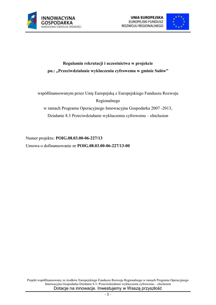 Regulamin rekrutacji i uczestnictwa w projekcie pn.: „Przeciwdziałanie wykluczeniu cyfrowemu w gminie Sułów” współfinansowanym przez Unię Europejską z Europejskiego Funduszu Rozwoju Regionalnego w ramach Programu Operacyjnego Innowacyjna Gospodarka 2007 -2013, Działanie 8.3 Przeciwdziałanie wykluczeniu cyfrowemu – eInclusion Numer projektu: POIG.08.03.00-06-227/13 Umowa o dofinansowanie nr POIG.08.03.00-06-227/13-00 Projekt współfinansowany ze środków Europejskiego Funduszu Rozwoju Regionalnego w ramach Programu Operacyjnego Innowacyjna Gospodarka Działanie 8.3- Przeciwdziałanie wykluczeniu cyfrowemu – elnclusion Dotacje na innowacje. Inwestujemy w Waszą przyszłość -1- Postanowienia ogólne §1 Ilekroć w regulaminie jest mowa o: 1. Projekcie – należy przez to rozumieć projekt „Przeciwdziałanie wykluczeniu cyfrowemu w gminie Sułów”. 2. Terminie realizacji Projektu – należy przez to rozumieć planowany termin zakończenia realizacji projektu, określony w Umowie o dofinansowanie Projektu. 3. Kandydacie/Wnioskodawcy - należy przez to rozumieć osobę, która złożyła dokumenty rekrutacyjne. 4. Beneficjencie ostatecznym (uczestniku Projektu) – należy przez to rozumieć osobę zakwalifikowaną do udziału w Projekcie, korzystającą ze wsparcia oferowanego w ramach projektu. 5. Gospodarstwie domowym - należy przez to rozumieć zespół osób spokrewnionych lub niespokrewnionych, mieszkających razem i utrzymujących się wspólnie. §2 1. Niniejszy regulamin określa zasady rekrutacji, w tym wyboru beneficjentów ostatecznych oraz zasady ich uczestnictwa w Projekcie. 2. Projekt realizowany jest przez Gminę Sułów przy współpracy z Gminnym Ośrodkiem Pomocy Społecznej w Sułowie. 3. Projekt jest współfinansowany ze środków Europejskiego Funduszu Rozwoju Regionalnego w ramach Programu Operacyjnego Innowacyjna Gospodarka 2007 – 2013, 8 Oś Priorytetowa: Społeczeństwo Informacyjne – zwiększenie innowacyjności gospodarki, Działanie 8.3 Przeciwdziałanie wykluczeniu cyfrowemu – eInclusion. 4. Trwałość Projektu: 5 lat od daty zakończenia realizacji Projektu. 5. Udział beneficjentów ostatecznych w Projekcie jest bezpłatny. 6. Głównym celem projektu jest zapewnienie dostępu do Internetu dla 100 gospodarstw domowych (dalej: GD) z terenu gminy Sułów zagrożonych wykluczeniem cyfrowym z powodu trudnej sytuacji materialnej lub niepełnosprawności. 7. Cele szczegółowe projektu: 1) Przeciwdziałanie wykluczeniu cyfrowemu na terenie objętym projektem poprzez udostępnienie bezpłatnego Internetu 100 GD z terenu gminy Sułów. Projekt współfinansowany ze środków Europejskiego Funduszu Rozwoju Regionalnego w ramach Programu Operacyjnego Innowacyjna Gospodarka Działanie 8.3- Przeciwdziałanie wykluczeniu cyfrowemu – elnclusion Dotacje na innowacje. Inwestujemy w Waszą przyszłość -2- 2) Wyposażenie GD objętych projektem w sprzęt niezbędny do korzystania z Internetu. 3) Rozwój kluczowych kompetencji grupy docelowej, poprzez zwiększenie umiejętności w zakresie obsługi komputera oraz korzystania z nowoczesnych technologii informacyjno – komunikacyjnych. 8. Regulamin rekrutacji i uczestnictwa w projekcie wraz z załącznikami jest dostępny w siedzibie Urzędu Gminy Sułów oraz na stronie internetowej www.sulow.pl Warunki uczestnictwa §3 1. Projekt skierowany jest do 100 gospodarstw domowych, w tym co najmniej 6 gospodarstw domowych osób niepełnosprawnych, zagrożonych wykluczeniem cyfrowym z Gminy Sułów spełniających co najmniej jedno kryterium podstawowe określone w ust. 2, i co najmniej jedno kryterium dodatkowe określone w ust. 3. 2. Kryterium podstawowym jest kryterium dochodowe: a) gospodarstwa domowe spełniające kryterium dochodowe upoważniające do otrzymania wsparcia w ramach systemu pomocy społecznej.1 [3 punkty] b) gospodarstwa domowe spełniające kryterium dochodowe upoważniające 2 do otrzymania wsparcia w ramach świadczeń rodzinnych. [2 punkty] c) dzieci i młodzież ucząca się z rodzin, w których przeciętny miesięczny dochód opodatkowany na osobę w rodzinie, z roku poprzedzającego rok udziału w projekcie był niższy, niż ostatni aktualny roczny wskaźnik: „Przeciętny miesięczny dochód rozporządzalny na 1 osobę w gospodarstwie domowym” publikowany przez Prezesa GUS. [1 punkt] d) rodzinne domy dziecka, rodziny zastępcze, samotni rodzice. [1 punkt] 3. Kryteria dodatkowe: 1 Prawo do świadczeń z pomocy społecznej, zgodnie z ustawą z dnia 12 marca 2004 roku o pomocy społecznej (Dz. U. z 2009 roku Nr 175, poz.1362 z późn. zm.), przysługuje: Osobie samotnie gospodarującej, której miesięczny dochód nie przekracza kwoty 542 zł netto Osobie w rodzinie, w której miesięczny dochód na osobę nie przekracza 456 zł netto, 2 Prawo do zasiłku rodzinnego i dodatków do tego zasiłku przysługuje: rodzicom, jednemu z rodziców albo opiekunowi prawnemu dziecka, opiekunowi faktycznemu dziecka, osobie uczącej się. Zasiłek rodzinny przysługuje rodzinom, w których miesięczny dochód netto nie przekracza 539 zł na osobę w rodzinie lub 623 zł na osobę w rodzinie, jeśli w rodzinie jest dziecko niepełnosprawne, Projekt współfinansowany ze środków Europejskiego Funduszu Rozwoju Regionalnego w ramach Programu Operacyjnego Innowacyjna Gospodarka Działanie 8.3- Przeciwdziałanie wykluczeniu cyfrowemu – elnclusion Dotacje na innowacje. Inwestujemy w Waszą przyszłość -3- a) dzieci i młodzież ucząca się, osiągająca bardzo dobre wyniki w nauce (średnia ocen na świadectwie szkolnym za ostatni rok szkolny przekracza 4,50) [3 punkty] b) osoby niepełnosprawne ze znacznym [3 punkty] lub umiarkowanym stopniem niepełnosprawności [2 punkty], oraz dzieci w wieku do 16 lat z orzeczeniem o niepełnosprawności [3 punkty], lub z orzeczeniem równoważnym (według orzecznictwa ZUS) c) dzieci i młodzież ucząca się z rodzin wielodzietnych (3 dzieci i wi