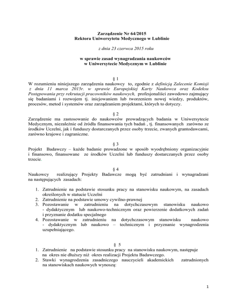 Zarządzenie Nr 64/2015 Rektora Uniwersytetu Medycznego w Lublinie z dnia 23 czerwca 2015 roku w sprawie zasad wynagradzania naukowców w Uniwersytecie Medycznym w Lublinie §1 W rozumieniu niniejszego zarządzenia naukowcy to, zgodnie z definicją Zalecenie Komisji z dnia 11 marca 2015r. w sprawie Europejskiej Karty Naukowca oraz Kodeksu Postępowania przy rekrutacji pracowników naukowych, profesjonaliści zawodowo zajmujący się badaniami i rozwojem tj. inicjowaniem lub tworzeniem nowej wiedzy, produktów, procesów, metod i systemów oraz zarządzaniem projektami, których to dotyczy. §2 Zarządzenie ma zastosowanie do naukowców prowadzących badania w Uniwersytecie Medycznym, niezależnie od źródła finansowania tych badań , tj. finansowanych zarówno ze środków Uczelni, jak i funduszy dostarczanych przez osoby trzecie, zwanych grantodawcami, zarówno krajowe i zagraniczne. §3 Projekt Badawczy – każde badanie prowadzone w sposób wyodrębniony organizacyjnie i finansowo, finansowane ze środków Uczelni lub funduszy dostarczanych przez osoby trzecie. §4 Naukowcy realizujący Projekty Badawcze mogą być zatrudniani i wynagradzani na następujących zasadach: 1. Zatrudnienie na podstawie stosunku pracy na stanowisku naukowym, na zasadach określonych w statucie Uczelni 2. Zatrudnienie na podstawie umowy cywilno-prawnej 3. Pozostawanie w zatrudnieniu na dotychczasowym stanowisku naukowo - dydaktycznym lub naukowo-technicznym oraz powierzenie dodatkowych zadań i przyznanie dodatku specjalnego 4. Pozostawanie w zatrudnieniu na dotychczasowym stanowisku naukowo - dydaktycznym lub naukowo – technicznym i przyznanie wynagrodzenia uzupełniającego. § 5 1. Zatrudnienie na podstawie stosunku pracy na stanowisku naukowym, następuje na okres nie dłuższy niż okres realizacji Projektu Badawczego. 2. Stawki wynagrodzenia zasadniczego nauczycieli akademickich zatrudnionych na stanowiskach naukowych wynoszą: 1 prof. Stawka wynagrodzenia zasadniczego 9 900 dr hab. 7 700 dr 5 500 lek. med./mgr 4 000 Tytuł/stopień naukowy § 6 1. Zatrudnienie na podstawie umowy cywilnoprawnej następuje w przypadku gdy zadanie objęte umową cywilnoprawną nie posiada cech charakterystycznych dla umowy o pracę, a w stosunku do pracowników już zatrudnionych stanowią pracę rodzajowo różną od obowiązków pracowniczych. 2. Stawki wynagradzania osób zatrudnionych na podstawie umów cywilnoprawnych wynoszą, z zastrzeżeniem § 9 ust. 1 i 2 Tytuł/stopień naukowy Stawka za 1 godz. prof. 105 dr hab. 88 dr 70 lek. med./mgr 53 § 7 W przypadku realizowania Projektu Badawczego w ramach zwiększenia obowiązków służbowych lub powierzenia dodatkowych zadań, dodatek specjalny przyznawany jest w wysokości 60% § 8 1. Wynagrodzenie uzupełniające przysługuje pracownikom zatrudnionym na dotychczasowych stanowiskach, którzy w ramach liczby godzin przeznaczonych na działalność naukową realizują Projekty Badawcze z komponentem międzynarodowym. 2. Wynagrodzenie uzupełniające określane jest w wymiarze godzinowym i służy obliczeniu wynagrodzenia za realizację Projektu Badawczego w systemie produktywnego czasu pracy naukowej. 3. Produktywny łączny czas pracy w Projektach Badawczych realizowanych w ramach umowy o pracę nie może przekroczyć w stosunku rocznym liczby godzin pracy przeznaczonej na działalność naukową ogółem i wynosi maksymalnie: 2 Stanowisko Profesor zwyczajny Profesor nadzwyczajny Profesor nadzwyczajny UM Profesor wizytujący Adiunkt hab. Adiunkt Asystent dr Asystent Pracownicy niebędący nauczycielami Wymiar godzin w stosunku rocznym 1028 998 998 1118 998 998 998 998 998 4. Maksymalny wymiar godzin określony w powyższej tabeli może zostać zwiększony o obniżkę pensum dydaktycznego, udzieloną w związku z realizacją Projektu. 5. Stawka godzinowa produktywnego czasu pracy w Projekcie wypłacana jest za godziny realizowania Projektu Badawczego. Stawka godzinowa wynosi 100 % stawki wynikającej z osobistego zaszeregowania pracownika (wynagrodzenie zasadnicze, dodatek stażowy, dodatek funkcyjny). 6. Wynagrodzenie uzupełniające ustalone w stawce godzinowej obowiązuje przez cały okres realizacji Projektu. 7. Wynagrodzenie uzupełniające wypłacane jest z dołu – do 10 dnia następnego miesiąca jako iloczyn przepracowanych godzin w Projekcie i stawki za 1 godzinę pracy ustaloną zgodnie z ust. 5. §9 1. Wybór podstawy zatrudnienia, o której mowa w § 4 ust. 1 – 4, uzależniony jest od wyboru naukowca, za wyjątkiem gdy przepisy prawa powszechnie obowiązującego lub zasady wprowadzone przez grantodawcę stanowią inaczej. 2. Stawki wynagrodzeń, o których mowa w § 5 – 8, mogą ulec zmniejszeniu, jeżeli zasady wprowadzone przez grantodawcę stanowią inaczej 3. Stawki wynagrodzeń, o których mowa w § 5 – 8, mogą ulec zwiększeniu, jeżeli przemawia za tym stopień trudności projektu lub unikatowość kwalifikacji wykonawców, chyba że zasady wprowadzone przez grantodawcę stanowią inaczej. 4. Stawka godzinowa produktywnego czasu pracy w projekcie może być obliczona w inny sposób, jeżeli zasady wprowadzone przez grantodawcę stanowią inaczej. § 10 Wynagrodzenia są wypłacane w złotych polskich. Jeżeli budżet Projektu przewiduje stawki w innej walucie, ustalenie wynagrodzenia następuje w tej walucie, a wypłaty dokonuje się po przeliczeniu w oparciu o kurs InfoEuro z ostatniego dnia miesiąca poprzedzającego miesiąc wypłaty, chyba że zasady wprowadzone przez grantodawcę stanowią inaczej. § 11 Pracownik jest zobowiązany do prowadzenia ewidencji czasu pracy przy Projekcie. Karty czasu pracy składane są najpóźniej do 3-go dnia następnego miesiąca. 3 § 12 Zarządzenie wchodzi w życie z dniem podpisania i ma zastosowanie do Projektów realizowanych w Uniwersytecie Medycznym w Lublinie od dnia 1 stycznia 2015 r. Rektor Uniwersytetu Medycznego w Lublinie Prof. dr hab. Andrzej Drop 4