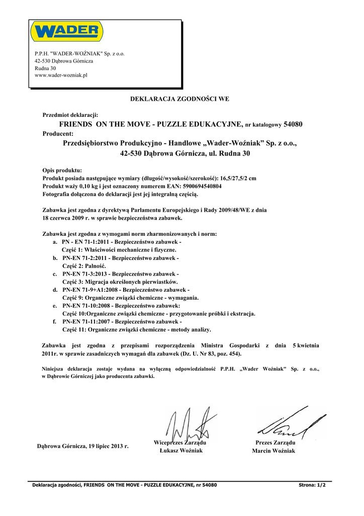 P.P.H. "WADER-WOŹNIAK" Sp. z o.o. 42-530 Dąbrowa Górnicza Rudna 30 www.wader-wozniak.pl DEKLARACJA ZGODNOŚCI WE Przedmiot deklaracji: FRIENDS ON THE MOVE - PUZZLE EDUKACYJNE, nr katalogowy 54080 Producent: Przedsiębiorstwo Produkcyjno - Handlowe „Wader-Woźniak” Sp. z o.o., 42-530 Dąbrowa Górnicza, ul. Rudna 30 Opis produktu: Produkt posiada następujące wymiary (długość/wysokość/szerokość): 16,5/27,5/2 cm Produkt waży 0,10 kg i jest oznaczony numerem EAN: 5900694540804 Fotografia dołączona do deklaracji jest jej integralną częścią. Zabawka jest zgodna z dyrektywą Parlamentu Europejskiego i Rady 2009/48/WE z dnia 18 czerwca 2009 r. w sprawie bezpieczeństwa zabawek. Zabawka jest zgodna z wymogami norm zharmonizowanych i norm: a. PN - EN 71-1:2011 - Bezpieczeństwo zabawek Część 1: Właściwości mechaniczne i fizyczne. b. PN-EN 71-2:2011 - Bezpieczeństwo zabawek Część 2: Palność. c. PN-EN 71-3:2013 - Bezpieczeństwo zabawek Część 3: Migracja określonych pierwiastków. d. PN-EN 71-9+A1:2008 - Bezpieczeństwo zabawek Część 9: Organiczne związki chemiczne - wymagania. e. PN-EN 71-10:2008 - Bezpieczeństwo zabawek: Część 10:Organiczne związki chemiczne - przygotowanie próbki i ekstracja. f. PN-EN 71-11:2007 - Bezpieczeństwo zabawek Część 11: Organiczne związki chemiczne - metody analizy. Zabawka jest zgodna z przepisami rozporządzenia Ministra Gospodarki 2011r. w sprawie zasadniczych wymagań dla zabawek (Dz. U. Nr 83, poz. 454). z dnia 5 kwietnia Niniejsza deklaracja zostaje wydana na wyłączną odpowiedzialność P.P.H. „Wader Woźniak" Sp. z o.o., w Dąbrowie Górniczej jako producenta zabawki. Dąbrowa Górnicza, 19 lipiec 2013 r. Wiceprezes Zarządu Łukasz Woźniak Deklaracja zgodności, FRIENDS ON THE MOVE - PUZZLE EDUKACYJNE, nr 54080 Prezes Zarządu Marcin Woźniak Strona: 1/2 P.P.H. "WADER-WOŹNIAK" Sp. z o.o. 42-530 Dąbrowa Górnicza Rudna 30 www.wader-wozniak.pl DEKLARACJA ZGODNOŚCI WE FRIENDS ON THE MOVE - PUZZLE EDUKACYJNE, nr katalogowy 54080 Deklaracja zgodności, FRIENDS ON THE MOVE - PUZZLE EDUKACYJNE, nr 54080 Strona: 2/2