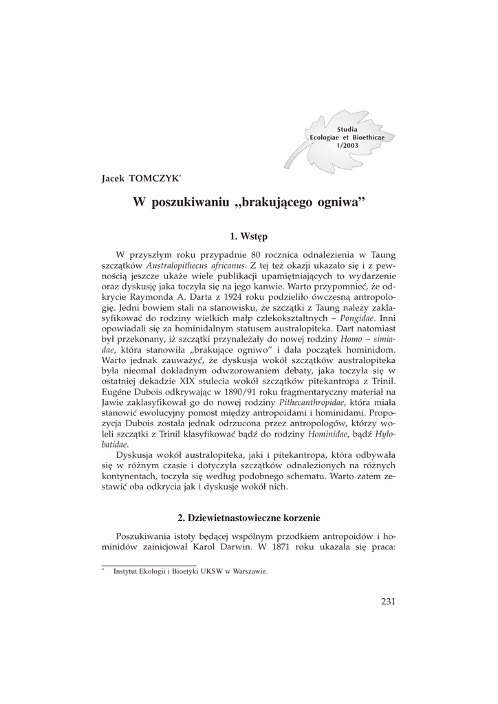 Studia Ecologiae et Bioethicae 1/2003 Jacek TOMCZYK* W poszukiwaniu brakuj¹cego ogniwa 1. Wstêp W przysz³ym roku przypadnie 80 rocznica odnalezienia w Taung szcz¹tków Australopithecus africanus. Z tej te¿ okazji ukaza³o siê i z pewnoci¹ jeszcze uka¿e wiele publikacji upamiêtniaj¹cych to wydarzenie oraz dyskusjê jaka toczy³a siê na jego kanwie. Warto przypomnieæ, ¿e odkrycie Raymonda A. Darta z 1924 roku podzieli³o ówczesn¹ antropologiê. Jedni bowiem stali na stanowisku, ¿e szcz¹tki z Taung nale¿y zaklasyfikowaæ do rodziny wielkich ma³p cz³ekokszta³tnych Pongidae. Inni opowiadali siê za hominidalnym statusem australopiteka. Dart natomiast by³ przekonany, i¿ szcz¹tki przynale¿a³y do nowej rodziny Homo simiadae, która stanowi³a brakuj¹ce ogniwo i da³a pocz¹tek hominidom. Warto jednak zauwa¿yæ, ¿e dyskusja wokó³ szcz¹tków australopiteka by³a nieomal dok³adnym odwzorowaniem debaty, jaka toczy³a siê w ostatniej dekadzie XIX stulecia wokó³ szcz¹tków pitekantropa z Trinil. Eugéne Dubois odkrywaj¹c w 1890/91 roku fragmentaryczny materia³ na Jawie zaklasyfikowa³ go do nowej rodziny Pithecanthropidae, która mia³a stanowiæ ewolucyjny pomost miêdzy antropoidami i hominidami. Propozycja Dubois zosta³a jednak odrzucona przez antropologów, którzy woleli szcz¹tki z Trinil klasyfikowaæ b¹d do rodziny Hominidae, b¹d Hylobatidae. Dyskusja wokó³ australopiteka, jaki i pitekantropa, która odbywa³a siê w ró¿nym czasie i dotyczy³a szcz¹tków odnalezionych na ró¿nych kontynentach, toczy³a siê wed³ug podobnego schematu. Warto zatem zestawiæ oba odkrycia jak i dyskusje wokó³ nich. 2. Dziewietnastowieczne korzenie Poszukiwania istoty bêd¹cej wspólnym przodkiem antropoidów i hominidów zainicjowa³ Karol Darwin. W 1871 roku ukaza³a siê praca: * Instytut Ekologii i Bioetyki UKSW w Warszawie. 231 Jacek Tomczyk O pochodzeniu cz³owieka, w której Darwin zaznaczy³, ¿e ze wszystkich ma³p Starego wiata ma³p w¹skonosych (Catarrhina), najwiêksze podobieñstwo do cz³owieka wykazuj¹ szympansy i goryle. Darwin da³ temu wyraz nastêpuj¹cym stwierdzeniem: Nie ulega w¹tpliwoci, ¿e cz³owiek jest latorol¹ szczepu ma³p w¹skonosych i pod wzglêdem genealogicznym winien byæ umieszczony w tej grupie1 . St¹d te¿, zdaniem Darwina, na obszarach afrykañskich, gdzie wspó³czenie pongidy te wystêpuj¹, w odleg³ej przesz³oci musia³y ¿yæ istoty bêd¹ce ogniwem ³¹cz¹cym formy ludzkie z wielkimi ma³pami cz³ekokszta³tnymi. Darwin pisa³, i¿ wnosiæ wiêc wypada, ¿e Afrykê zamieszkiwa³y niegdy ma³py podobne do goryla i szympansa. Poniewa¿ za oba te gatunki s¹ najwiêcej do cz³owieka zbli¿one, przypuciæ wiêc mo¿na z pewn¹ doz¹ prawdopodobieñstwa, ¿e dawni protoplaci ludzkiego rodu mieszali tak¿e w Afryce a nie gdzie indziej2 . Innego zdania by³ niemiecki biolog Ernst Haeckel, który uwa¿a³, i¿ istoty bêd¹cej brakuj¹cym ogniwem nale¿y szukaæ nie w Afryce, lecz raczej w Azji. Haeckel, podobnie jak Darwin, dostrzega³ wielkie podobieñstwo antropoidów i hominidów, które zak³ada pochodzenie ze wspólnego pnia rodowego. Pocz¹tkowo Haeckel klasyfikowa³ cz³owieka w ramach odrêbnej od Pongidae i Hylobatidae linii rozwojowej3 . W swojej publikacji Natürliche Schöpfungs-Geschichte, która ukaza³a siê w 1868 roku, Haeckel opisa³ dok³adnie hipotetyczn¹ istotê, która posiada³a zarówno cechy ma³pie, jak i ludzkie, jednak nale¿a³a do odrêbnej od ma³p linii rozwojowej. Odkrycie archaicznych szcz¹tków cz³owieka neandertalskiego nieopodal Düsseldorfu w 1856 roku, a póniej w Belgii w jaskini Spy w 1886 roku utwierdzi³o Haeckla w przekonaniu, ¿e w odleg³ej przesz³oci musia³a ¿yæ istota, któr¹ znamionowa³y cechy zarówno prymitywnych antropoidów, jak i cz³owiekowatych. Owo brakuj¹ce ogniwo zosta³o nazwane przez Haeckla Pithecanthropus alalus, co znaczy ma³polud niemy4 . Dok³adne porównanie morfologii i behawioru ludzi z ma³pami wspó³czesnymi sk³oni³o Haeckla do zweryfikowania wczeniejszych pogl¹dów i po³¹czenie linii rozwojowej Hominidae z Hylobatidae. Z przeprowadzonych analiz wynika³o bowiem, i¿ najbardziej spokrewnione z cz³owiekiem nie s¹, jak s¹dzi³ Darwin, bynajmniej ma³py z rodziny Pongidae, lecz Hylobatidae, czyli rodziny gibonowatych. Ze wszystkich bowiem ma³p cz³ekokszta³tnych tylko gibony poruszaj¹ siê na ziemi wy³¹cznie w pozycji wyprostowanej, przy tym nie podpieraj¹ siê zewnêtrzn¹ powierzchni¹ zgiêtych palców, jak czyni¹ to szympansy czy goryle. Podczas dwuno¿nego chodzenia gibony opieraj¹ siê na ca³ej stopie podobnie jak ludzie, a nie jak inne ma³py cz³ekokszta³tne na 1 2 3 4 K. DARWIN, O pochodzeniu cz³owieka, t³um. z ang. M. Ilecki, Warszawa 1951, 205. Tam¿e, 208. B. HA£ACZEK, Rozwój paleoantropologii w wietle drzew rodowych cz³owieka, Studia Philosophiae Christianae 20(1984)1, 55-96. E. HAECKEL, Natürliche Schöpfungs-Geschichte, Berlin 1902, 708. 232 W poszukiwaniu brakuj¹cego ogniwa jej krawêdzi. Ze wszystkich Hominoidea tylko gibony charakteryzuj¹ siê niewielkim dymorfizmem p³ciowym, w czym równie¿ przypominaj¹ ludzi. Gibony, jak zauwa¿a Haeckel, nie tylko morfologicznie upodabniaj¹ siê do gatunku Homo sapiens, lecz równie¿ behawioralnie. Wród ma³p cz³ekokszta³tnych wy³¹cznie gibony ¿yj¹ w zwi¹zkach monogamicznych i wspólnie podejmuj¹ trud wychowania potomstwa5 . Linia rozwojowa cz³owieka musia³a byæ, zdaniem Haeckla, kontinuum ewolucyjnym azjatyckich ma³p cz³ekokszta³tnych. Brakuj¹cego ogniwa nale¿a³o zatem szukaæ nie na terenach Afryki, lecz na obszarach wystêpowania wspó³czesnych przedstawicieli rodziny Hylobatidae. Te za ¿yj¹ wy³¹cznie na obszarach azjatyckich6 . Prace Darwina i Haeckla z jednej strony zaszczepi³y pragnienie odnalezienia brakuj¹cego ogniwa, z drugiej natomiast podzieli³y ówczesny wiat antropologów. Jedni uwa¿ali bowiem, ¿e kolebk¹ ludzkoci b