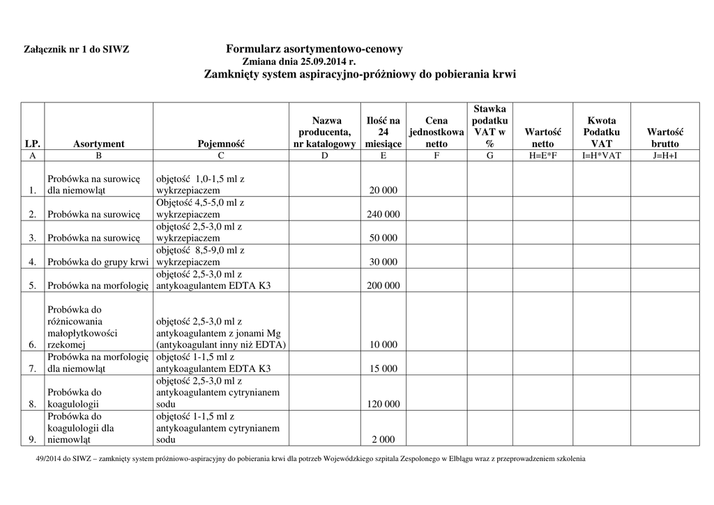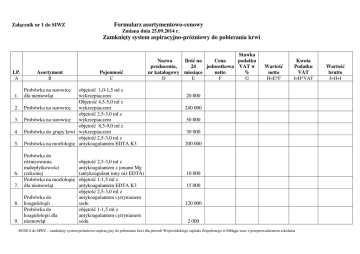 Formularz asortymentowo-cenowy Załącznik nr 1 do SIWZ Zmiana dnia 25.09.2014 r. Zamknięty system aspiracyjno-próżniowy do pobierania krwi LP. Asortyment Pojemność A B C 1. 2. 3. 4. 5. 6. 7. 8. 9. Probówka na surowicę dla niemowląt objętość 1,0-1,5 ml z wykrzepiaczem Objętość 4,5-5,0 ml z Probówka na surowicę wykrzepiaczem objętość 2,5-3,0 ml z Probówka na surowicę wykrzepiaczem objętość 8,5-9,0 ml z Probówka do grupy krwi wykrzepiaczem objętość 2,5-3,0 ml z Probówka na morfologię antykoagulantem EDTA K3 Probówka do różnicowania małopłytkowości rzekomej Probówka na morfologię dla niemowląt Probówka do koagulologii Probówka do koagulologii dla niemowląt objętość 2,5-3,0 ml z antykoagulantem z jonami Mg (antykoagulant inny niż EDTA) objętość 1-1,5 ml z antykoagulantem EDTA K3 objętość 2,5-3,0 ml z antykoagulantem cytrynianem sodu objętość 1-1,5 ml z antykoagulantem cytrynianem sodu Stawka Nazwa Ilość na Cena podatku producenta, 24 jednostkowa VAT w nr katalogowy miesiące netto % D E F G Wartość netto Kwota Podatku VAT Wartość brutto H=E*F I=H*VAT J=H+I 20 000 240 000 50 000 30 000 200 000 10 000 15 000 120 000 2 000 49/2014 do SIWZ – zamknięty system próżniowo-aspiracyjny do pobierania krwi dla potrzeb Wojewódzkiego szpitala Zespolonego w Elblągu wraz z przeprowadzeniem szkolenia 10. Probówka z He-LI 11. Probówka do glukozy 12. Probówka do OB. Pipeta kalibrowana do probówki z pozycji 12, 13. jeśli konieczna objętość 2,5-3,0 ml z antykoagulantem heparyną litowa objętość 2,5-3,0 ml z antykoagulantem fluorkiem sodu objętość 1,8-2,5 ml z antykoagulantem cytrynianem sodu 500 10 000 5 000 5 000 14. Igła systemowa rozmiar 0,7 x do 38 mm 20 000 15. Igła systemowa rozmiar 0,8x do 25mm 50 000 16. Igły systemowe rozmiar 0,8 x do 38mm 50 000 17. Igły systemowe rozmiar 0,9 x do 38mm 50 000 Igła motylkowa na 19. posiewy krwi rozmiar 0,8, 0,9x 38mm z drenem do 80mm rozmiar 0,8 mm z drenem do 240mm z adapterem pakowanym łącznie 20. Adapter Łącznik do podawania leków 6 000 21. Adapter Zestaw do gazometrii 22. kapilarnej PET Łącznik do podawania Luer 100 ul, antykolagulantem heparyną litową 80 000 18. Igła motylkowa 15 000 4 000 10 000 49/2014 do SIWZ – zamknięty system próżniowo-aspiracyjny do pobierania krwi dla potrzeb Wojewódzkiego szpitala Zespolonego w Elblągu wraz z przeprowadzeniem szkolenia Igły systemowe 23. bezpieczne Igły motylkowe 24. bezpieczne Strzykawka do 25. gazometrii z filtrem 26. Worki Pisaki do etykiet 27. probówko-strzykawek Rozmiar 0,8 mm x do 38 mm, 0,9 mm x do 38mm, 0,8mm x do 25mm Rozmiar 0,8 mm x dren do 80 mm 40 000 Do 2 ml 30 000 PP 600 x 780 mm 4 000 czarne Odporna na zamrażanie 32 x 22 mm 28. Etykieta samoprzylepna Końcówki do wykonywania rozmazów Kompatybilna z probówką 29. z łopatką morfologiczna 4 000 500 300 000 2 000 Wartość netto Kwota podatku VAT Wartość brutto Wymagania dodatkowe: 1. Probówki plastikowe, z zakręcanym korkiem. 2. Gwarancja wytworzenia próżni tuż przed pobraniem lub zapewnienie pobrania materiału przez odciągnięcie tłoka. 3. Standaryzacja pobrania właściwej ilości krwi. 4. Igły systemowe, łączniki – pakowane pojedynczo. 5. Igły systemowe – z odpowiednio ukształtowanym ostrzem, małym łącznikiem, na stałe zespolonym z igłą, ułatwiającym penetrację tkanki i właściwy kąt wkłucia, wnętrze igły silikonowane eliminujące wykrzepianie się krwi podczas pobierania do kilku probówek. 6. Igły motylkowe do posiewów z krwi umożliwiające bezpośredni przepływ krwi z naczynia krwionośnego do butelki z podłożem. 7. Cały asortyment powinien pochodzić od jednego producenta. 8. Dla każdej pozycji Zamawiający wymaga przedłożenia po 1 szt. próbek. 9. Bezpłatne szkolenie personelu z zakresu obsługi dostarczanego sprzętu i zapobieganiu błędu przedlaboratoryjnego. …………………………… data, podpis upoważnionego przedstawiciela Wykonawcy 49/2014 do SIWZ – zamknięty system próżniowo-aspiracyjny do pobierania krwi dla potrzeb Wojewódzkiego szpitala Zespolonego w Elblągu wraz z przeprowadzeniem szkolenia