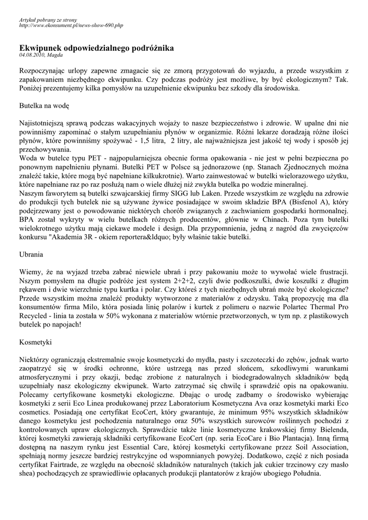 Artykuł pobrany ze strony http://www.ekonsument.pl/news-show-690.php Ekwipunek odpowiedzialnego podróżnika 04.08.2010, Magda Rozpoczynając urlopy zapewne zmagacie się ze zmorą przygotowań do wyjazdu, a przede wszystkim z zapakowaniem niezbędnego ekwipunku. Czy podczas podróży jest możliwe, by być ekologicznym? Tak. Poniżej prezentujemy kilka pomysłów na uzupełnienie ekwipunku bez szkody dla środowiska. Butelka na wodę Najistotniejszą sprawą podczas wakacyjnych wojaży to nasze bezpieczeństwo i zdrowie. W upalne dni nie powinniśmy zapominać o stałym uzupełnianiu płynów w organizmie. Różni lekarze doradzają różne ilości płynów, które powinniśmy spożywać - 1,5 litra, 2 litry, ale najważniejsza jest jakość tej wody i sposób jej przechowywania. Woda w butelce typu PET - najpopularniejsza obecnie forma opakowania - nie jest w pełni bezpieczna po ponownym napełnieniu płynami. Butelki PET w Polsce są jednorazowe (np. Stanach Zjednocznych można znaleźć takie, które mogą być napełniane kilkukrotnie). Warto zainwestować w butelki wielorazowego użytku, które napełniane raz po raz posłużą nam o wiele dłużej niż zwykła butelka po wodzie mineralnej. Naszym faworytem są butelki szwajcarskiej firmy SIGG lub Laken. Przede wszystkim ze względu na zdrowie do produkcji tych butelek nie są używane żywice posiadające w swoim składzie BPA (Bisfenol A), który podejrzewany jest o powodowanie niektórych chorób związanych z zachwianiem gospodarki hormonalnej. BPA został wykryty w wielu butelkach różnych producentów, głównie w Chinach. Poza tym butelki wielokrotnego użytku mają ciekawe modele i design. Dla przypomnienia, jedną z nagród dla zwycięzców konkursu "Akademia 3R - okiem reportera“ były właśnie takie butelki. Ubrania Wiemy, że na wyjazd trzeba zabrać niewiele ubrań i przy pakowaniu może to wywołać wiele frustracji. Nszym pomysłem na długie podróże jest system 2+2+2, czyli dwie podkoszulki, dwie koszulki z długim rękawem i dwie wierzchnie typu kurtka i polar. Czy któreś z tych niezbędnych ubrań może być ekologiczne? Przede wszystkim można znaleźć produkty wytworzone z materiałów z odzysku. Taką propozycję ma dla konsumentów firma Milo, która posiada linię polarów i kurtek z polimeru o nazwie Polartec Thermal Pro Recycled - linia ta została w 50% wykonana z materiałów wtórnie przetworzonych, w tym np. z plastikowych butelek po napojach! Kosmetyki Niektórzy ograniczają ekstremalnie swoje kosmetyczki do mydła, pasty i szczoteczki do zębów, jednak warto zaopatrzyć się w środki ochronne, które ustrzegą nas przed słońcem, szkodliwymi warunkami atmosferycznymi i przy okazji, bedąc zrobione z naturalnych i biodegradowalnych składników będą uzupełniały nasz ekologiczny ekwipunek. Warto zatrzymać się chwilę i sprawdzić opis na opakowaniu. Polecamy certyfikowane kosmetyki ekologiczne. Dbając o urodę zadbamy o środowisko wybierając kosmetyki z serii Eco Linea produkowanej przez Laboratorium Kosmetyczna Ava oraz kosmetyki marki Eco cosmetics. Posiadają one certyfikat EcoCert, który gwarantuje, że minimum 95% wszystkich składników danego kosmetyku jest pochodzenia naturalnego oraz 50% wszystkich surowców roślinnych pochodzi z kontrolowanych upraw ekologicznych. Sprawdźcie także linie kosmetyczne krakowskiej firmy Bielenda, której kosmetyki zawierają składniki certyfikowane EcoCert (np. seria EcoCare i Bio Plantacja). Inną firmą dostępną na naszym rynku jest Essential Care, której kosmetyki certyfikowane przez Soil Association, spełniają normy jeszcze bardziej restrykcyjne od wspomnianych powyżej. Dodatkowo, część z nich posiada certyfikat Fairtrade, ze względu na obecność składników naturalnych (takich jak cukier trzcinowy czy masło shea) pochodzących ze sprawiedliwie opłacanych produkcji plantatorów z krajów ubogiego Południa. Udanego urlopu!