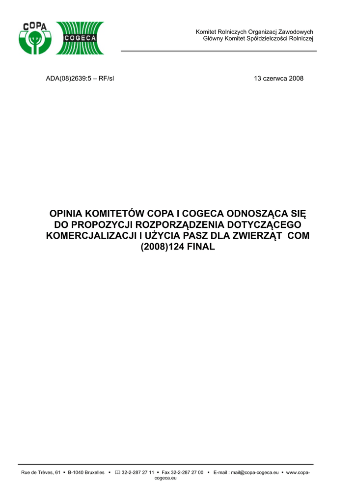Komitet Rolniczych Organizacj Zawodowych Główny Komitet Spółdzielczości Rolniczej ADA(08)2639:5 – RF/sl 13 czerwca 2008 OPINIA KOMITETÓW COPA I COGECA ODNOSZĄCA SIĘ DO PROPOZYCJI ROZPORZĄDZENIA DOTYCZĄCEGO KOMERCJALIZACJI I UŻYCIA PASZ DLA ZWIERZĄT COM (2008)124 FINAL Rue de Trèves, 61 B-1040 Bruxelles 32-2-287 27 11 Fax 32-2-287 27 00 E-mail : [email protected] www.copacogeca.eu 2 OPINIA KOMITETÓW COPA I COGECA ODNOSZĄCA SIĘ DO PROPOZYCJI ROZPORZĄDZENIA DOTYCZĄCEGO KOMERCJALIZACJI I UŻYCIA PASZ DLA ZWIERZĄT COM (2008)124 FINAL Komitety COPA i COGECA zadowolone są z możliwości, która została im dana, aby skomentować propozycję rozporządzenia Komisji z dnia 3 marca 2008 roku, dotyczącego komercjalizacji i stosowania pasz dla zwierząt. Komitety COPA i COGECA popierają tą propozycję, zważywszy, że : Chodzi tutaj o rozporządzenie, a nie o dyrektywę, gwarantujące jednolite i zharmonizowane wdrożenie w całej Unii Europejskiej; Chodzi o gruntowne przekształcenie dyspozycji ustawowej w ramach jednolitego rozporządzenia, które zastępuje sześć dyrektyw i które upraszcza i unowocześnia obecne rozporządzenia, szczególnie włączając do nich strategię” business to business” jej celem jest zagwarantowanie odpowiedniego poziomu bezpieczeństwa pasz dla zwierząt i artykułów spożywczych, oferując przy tym podmiotom gospodarczym nowoczesny rynek, szczególnie za pośrednictwem ko-regulację i wolontariat; powinna ona pozwolić na adekwatne środki kontroli oraz na bezpieczeństwo pasz dla zwierząt. Komitety COPA-COGECA zauważają, iż Komisja: - wykazała się chęcią, proponując właściwe uregulowanie, aby ochraniać wiedzę praktyczną producentów oraz zapewnić użytkownikom pasz dla zwierząt dostęp do informacji. Jednakże, Komitety COPA i COGECA podkreślają, iż w niektórych przypadkach, prawo dostępu do informacji użytkowników pasz dla zwierząt było ograniczone i w konsekwencji powinno zostać wzmocnione - dąży do włączenia nowych elementów. Jednakże, w niektórych przypadkach, byłoby lepiej nie opierać się na danych pochodzących ze starych dyrektyw, gdyż nie zostały one jeszcze uprawomocnione lub przetestowane w praktyce Komentarze na temat tych specyficznych tematów zostały sformułowane, biorąc pod uwagę przedstawione sugestie. Mają one na celu zagwarantowanie optymalnej ochrony dla rolników i konkurencyjności europejskich producentów oraz spółdzielni produkujących pasze dla zwierząt. Rozdział I : Rozporządzenia wstępne W definicji mieszanki w artykule 3.2.(g), pojęcie dziennej racji zwierzęcia powinno zostać dostosowane do jego potrzeb. W konsekwencji, trzeba zmienić definicję, aby zapewnić, iż wszystkie składniki odnoszące się do wartości odżywczych żywności, były w niej umieszczone. Można na przykład odnieść się do już istniejącej definicji z artykułu 2, paragraf 2(f) rozporządzenia 1831/2003. W artykule 3.2 (k) powinno znaleźć się jasne rozróżnienie między „wspomaganiem” a „dodatkiem”. 3 Rozdział 2 : Wymogi ogólne W artykule 4.2, wprowadzenie terminu pasza dla zwierząt « autentyczna » może wprowadzić niejasność. Słowo to powinno zostać usunięte i zastąpione przez „ uczciwa”, które jest terminem używanym w dyrektywie 79/373, w artykule 3 W artykule 5.2, zastąpić terminy « producenci pasz » przez « odpowiedzialni za informacje dotyczące oznakowania (odnośnie do artykułu 12)» aby wprowadzić działania związane z formowaniem. To zastąpienie terminów dotyczy również innych artykułów. W artykule 6 – zastąpić termin « zakazanie» przez « surowce zakazane». W punkcie 6.2, trzeba by było przewidzieć umieszczenie listy zakazanych surowców w aneksie tego rozporządzenia, tak jak jest to dalej przewidziane dla listy głównych używanych surowców, a nie w osobnym tekście (obecnie : decyzja 2004/217). Rozdział 3 : Wdrożenie na rynek specyficznych rodzajów pasz dla zwierząt Dodatki do żywności uzupełniającej [artykuł 8] : Komitety COPA i COGECA są przychylnie nastawione do wysiłków poczynionych przez Komisję w kwestii wyjaśnienia sytuacji dodatków do żywności uzupełniającej, w sensie, gdy bez szkodzenia warunkom używania, zezwalających na dany dodatek, żywność uzupełniająca nie zawiera dodatków, lub zawiera proporcje odpowiadające następującym zasadom : - ponad 100 razy ustalona maksymalna zawartość dla mieszanek ; - ponad 5 razy w przypadku coccidiostatiques i histomonostatiques Rozdział 4 : Oznakowanie, prezentacja i pakowanie Odpowiedzialność (artykuł 12.4) Propozycja powinna być bardziej precyzyjna. Odpowiedzialność za właściwe oznakowanie nie powinna spoczywać na sprzedawcy detalicznym czy hurtowym, ale na osobie, która wprowadza produkt na rynek. Stwierdzenia [ artykuł 13] Komitety COPA i COGECA SA przychylnie nastawione do faktu, iż Komisja przyznała wagę obiektywnemu charakterowi, sprawdzalnemu i zrozumiałemu w całym stwierdzeniu, w szczególności poprzez wymóg posiadania naukowego dowodu prawdziwości stwierdzenia, dostarczanego przez kompetentne władze. W celu jak najlepszej ochrony prawa do informacji dla użytkowników pasz dla zwierząt, Komitety COPA-COGECA domagają się sprecyzowania praktycznego wdrożenia tego artykułu, szczególnie, jeśli chodzi o dostępność informacji naukowych, ustalenie, jakie kompetentne władze są uprawnione do sprawdzenia prawdziwości danych oraz o możliwość otrzymywania tych informacji przez użytkowników pasz. 4 Oznakowanie składników : Komitety COPA i COGECA zauważają, iż deklaracja na temat procentowej ilości surowców stosowanych w żywności pochodzi od tej chwili z wolontariatu. Komitety są przychylnie nastawione do propozycji Komisji dotyczącej oznakowania składników, która przewiduje, że : Surowce są przedstawione na liście według malejącej wagi. Lista ta będzie mogła zawierać procent wa