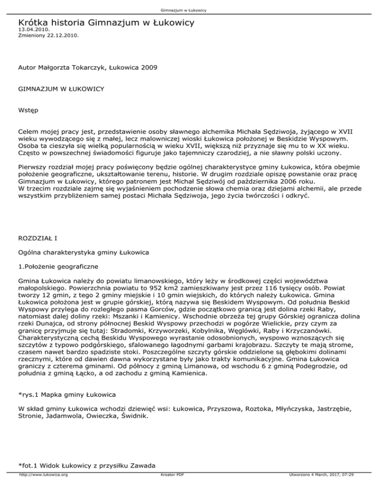 Gimnazjum w Łukowicy Krótka historia Gimnazjum w Łukowicy 13.04.2010. Zmieniony 22.12.2010. Autor Małgorzta Tokarczyk, Łukowica 2009 GIMNAZJUM W ŁUKOWICY Wstęp Celem mojej pracy jest, przedstawienie osoby sławnego alchemika Michała Sędziwoja, żyjącego w XVII wieku wywodzącego się z małej, lecz malowniczej wioski Łukowica położonej w Beskidzie Wyspowym. Osoba ta cieszyła się wielką popularnością w wieku XVII, większą niż przyznaje się mu to w XX wieku. Często w powszechnej świadomości figuruje jako tajemniczy czarodziej, a nie sławny polski uczony. Pierwszy rozdział mojej pracy poświęcony będzie ogólnej charakterystyce gminy Łukowica, która obejmie położenie geograficzne, ukształtowanie terenu, historie. W drugim rozdziale opiszę powstanie oraz pracę Gimnazjum w Łukowicy, którego patronem jest Michał Sędziwój od października 2006 roku. W trzecim rozdziale zajmę się wyjaśnieniem pochodzenie słowa chemia oraz dziejami alchemii, ale przede wszystkim przybliżeniem samej postaci Michała Sędziwoja, jego życia twórczości i odkryć. ROZDZIAŁ I Ogólna charakterystyka gminy Łukowica 1.Położenie geograficzne Gmina Łukowica należy do powiatu limanowskiego, który leży w środkowej części województwa małopolskiego. Powierzchnia powiatu to 952 km2 zamieszkiwany jest przez 116 tysięcy osób. Powiat tworzy 12 gmin, z tego 2 gminy miejskie i 10 gmin wiejskich, do których należy Łukowica. Gmina Łukowica położona jest w grupie górskiej, którą nazywa się Beskidem Wyspowym. Od południa Beskid Wyspowy przylega do rozległego pasma Gorców, gdzie początkowo granicą jest dolina rzeki Raby, natomiast dalej doliny rzeki: Mszanki i Kamienicy. Wschodnie obrzeża tej grupy Górskiej ogranicza dolina rzeki Dunajca, od strony północnej Beskid Wyspowy przechodzi w pogórze Wielickie, przy czym za granicę przyjmuje się tutaj: Stradomki, Krzyworzeki, Kobylnika, Węglówki, Raby i Krzyczanówki. Charakterystyczną cechą Beskidu Wyspowego wyrastanie odosobnionych, wyspowo wznoszących się szczytów z typowo podgórskiego, sfalowanego łagodnymi garbami krajobrazu. Szczyty te mają strome, czasem nawet bardzo spadziste stoki. Poszczególne szczyty górskie oddzielone są głębokimi dolinami rzecznymi, które od dawien dawna wykorzystane były jako trakty komunikacyjne. Gmina Łukowica graniczy z czterema gminami. Od północy z gminą Limanowa, od wschodu 6 z gminą Podegrodzie, od południa z gminą Łącko, a od zachodu z gminą Kamienica. *rys.1 Mapka gminy Łukowica W skład gminy Łukowica wchodzi dziewięć wsi: Łukowica, Przyszowa, Roztoka, Młyńczyska, Jastrzębie, Stronie, Jadamwola, Owieczka, Świdnik. *fot.1 Widok Łukowicy z przysiłku Zawada http://www.lukowica.org Kreator PDF Utworzono 4 March, 2017, 07:29 Gimnazjum w Łukowicy 2. Ukształtowanie terenu W związku z tym, że gmina Łukowica położona jest w Beskidzie Wyspowym wyróżnia się charakterystycznym krajobrazem odosobnionych, izolowanych szczytów przypominających wyspy. Partie szczytowe zawdzięczają swoją wyniosłość odporności piaskowca magurskiego. W gminie Łukowicy wzniesienia wahają się od 350m n.p.m. do 806.8 m n.p.m. Do największych wzniesień należą Góra Klończyk (806.8 m n. p.m.), Łyżka (802.7m n.p.m.) i Szkiełek (749m n.p.m.). *fot.2 Beskid Wyspowy – gmina Łukowica w tle Tatry 3.Historia Według tradycji nazwa Łukowica pochodzi od łuku. Broń ta wytwarzana była z drewna cisowego dla wojsk króla Władysława Łokietka. Pierwsza wzmianka historyczna pochodzi z 1326 roku, Wieś była wtedy własnością rycerską Jastrzębców, a później Sędzimirów z rodu Sędzimirów wywodził się Michał Sędziwój słynny w całej Europie alchemik, pionier chemii. PIERWSZE ŚLADY OSADNICTWA Początkowe fakty z dziejów Łukowicy przedstawiają się dość mgliście. Całą wiedzę na ten temat można zawęzić do kilku znalezisk w Świdniku, sąsiadującym z Łukowicą. Bardzo istotne w tym miejscu to znalezisko cmentarzyska datowane na 1000- 800p.Ch. z okresu kultury łużyckiej, odnaleziono tu również miecze z brązu ceramikę i monety. Archeolodzy twierdzą, że założyciele cmentarzysk nie osiągnęli pełnej stabilizacji osadniczej, chociaż ludność utrzymująca cmentarzyska przenosiła się z miejsca na miejsce w bliskiej okolicy swych cmentarzy, najdalej o 1,25 km. Można w tych miejscach zaobserwować ślady osad z różnych okresów, to znaczy ślady świadczące o ruchach ludności, korzystającej ze swego cmentarza. " Cmentarzyska stanowią przejaw tendencji stabilizacyjnych osadnictwa, ograniczenie rewiru wędrówek, rozwijanych przez poszczególne rody"( H. Łowmiański, Początki Polski, Warszawa 164, s. 285.). A zatem możliwe jest, że w niedalekiej odległości od znaleźnego cmentarza pojawiały się epizody osadnicze na tym terenie najdalej od XIII w p.Ch. Kultura łużycka była to kultura rolniczej ludności osiadłej, stosująca także narzędzia metalowe do uprawy roli. Na podobne cmentarzyska z tego okresu natrafiono w Starym Sączu i Chełmcu oraz również z tego okresu na gród w Maszkowicach i osadę obronną w Zabrzeży. Kolejne znaleziska w Jastrzębiu i Czarnym Potoku pochodzą z okresu tzw. rzymskiego (od początku n.e. do ok. 400 n.e.), gdzie odnaleziono monety i ceramikę. ZABYTKI W GMINIE ŁUKOWICA W Przyszowej na wzgórzu Łyżka znajduje się nie zbadane jeszcze zamczysko, po którym pozostały rumowiska i piękne legendy. Jedna z miejscowych legend wydaje się być niezwykle prawdopodobną. A brzmi ona tak - 400 w XIII w., kiedy właścicielką dóbr sądeckich była Kinga, żona Bolesława Wstydliwego( kanonizowana przez Jana Pawła II w 1999r.) tu na Łyżce na wschód od grodu z kultury łużyckiej znajdował się prawdopodobnie gród drewniany. Podczas najazdu tatarskiego na Małopolskę i Śląsk Kinga musiała uciekać ze swojej posesji w Starym Sączu zabierając ze sobą skarby. Najbl