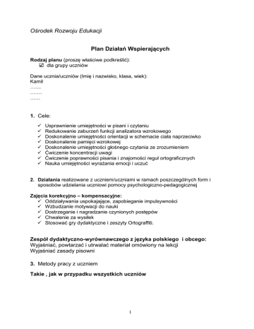 Ośrodek Rozwoju Edukacji Plan Działań Wspierających Rodzaj planu (proszę właściwe podkreślić): dla grupy uczniów Dane ucznia/uczniów (Imię i nazwisko, klasa, wiek): Kamil ….... ……. …… 1. Cele: Usprawnienie umiejętności w pisani i czytaniu Redukowanie zaburzeń funkcji analizatora wzrokowego Doskonalenie umiejętności orientacji w schemacie ciała naprzeciwko Doskonalenie pamięci wzrokowej Doskonalenie umiejętności głośnego czytania ze zrozumieniem Ćwiczenie koncentracji uwagi Ćwiczenie poprawności pisania i znajomości reguł ortograficznych Nauka umiejętności wyrażania emocji i uczuć 2. Działania realizowane z uczniem/uczniami w ramach poszczególnych form i sposobów udzielania uczniowi pomocy psychologiczno-pedagogicznej Zajęcia korekcyjno – kompensacyjne: Oddziaływania uspokajające, zapobieganie impulsywności Wzbudzanie motywacji do nauki Dostrzeganie i nagradzanie czynionych postępów Chwalenie za wysiłek Stosować gry dydaktyczne i zeszyty Ortograffiti. Zespół dydaktyczno-wyrównawczego z języka polskiego i obcego: Wyjaśniać, powtarzać i utrwalać materiał omówiony na lekcji Wyjaśniać zasady pisowni 3. Metody pracy z uczniem Takie , jak w przypadku wszystkich uczniów 1 4. Zakres dostosowania wymagań edukacyjnych do indywidualnych potrzeb rozwojowych i edukacyjnych oraz możliwości psychofizycznych ucznia (zgodnie z przepisami w sprawie warunków i sposobu oceniania, klasyfikowania i promowania uczniów i słuchaczy oraz przeprowadzania sprawdzianów i egzaminów w szkołach publicznych) Zakres dostosowania wymagań edukacyjnych Wdrażać do samokontroli i czujności ortograficznej Ocenianie błędów po dokonaniu korekty przez ucznia 9 korzystanie ze słowników) zmniejszanie ilości, stopnia trudności i obszerności zadań dzielenie materiału na mniejsze partie, wyznaczanie czasu na ich opanowanie i odpytywanie wydłużanie czasu na odpowiedź, przeczytanie lektury w częściach ( możliwość korzystania z płyty) !!! formułowanie pytań w formie zdań o prostej konstrukcji powołujących się na ilustrujące przykłady częste podchodzenie do ucznia w trakcie samodzielnej pracy w celu udzielania dodatkowej pomocy, wyjaśnień należy zezwolić na dokończenie w domu niektórych prac wykonywanych na lekcjach, zadawać do domu na miarę możliwości ucznia dyktanda przeprowadzać indywidualnie w wolniejszym tempie i na wyrazach wyraźnie zapowiedzianych, sprawdzać reguły pisowni potrzeba większej ilości czasu i powtórzeń na opanowanie materiału docenianie każdego sukcesów Języki obce � Dostosować tempo realizacji programu do zindywidualizowanych możliwości uczniów. � Stosować metody polisensoryczne. � Aktywizować uczniów poprzez stosowanie metod zabawowych. � Korzystanie z różnych pomocy dydaktycznych: kasety audio i video, domina, zestawy PUS, barwne ilustracje, karty, taśmy magnetofonowe. 2 � Dobierać materiał zgodnie ze stanem aktualnych umiejętności ucznia. � Nie oceniać za błędy w pisowni i nieestetyczne pismo. � Wielokrotnie powtarzać wprowadzony materiał językowy. � Ćwiczenia językowe muszą być krótkie, różnorodne, ciekawe i odnoszące się do różnych sytuacji – zapobiega to znudzeniu dziecka i zniechęcaniu się do pracy. � Stosować stałe wzmocnienia pozytywne, często dowartościowywać i motywować pochwałą. � Nie krytykować i nie osądzać negatywnie Przyroda � Stosować metody poszukujące, obserwacyjne i badawcze. Ułatwia to dzieciom przyswojenie wiadomości. � Należy mieć na uwadze zasadę stopniowania trudności oraz „od bliższego do dalszego", czyli obserwacji i opisu najbliższego otoczenia przez przyrodę Polski aż do przyrody świata. � Szczególnie przydatne i ważne jest wykonywanie prostych doświadczeń, prowadzenie hodowli oraz obserwacji. Nastawienie na działanie mobilizuje i aktywizuje uczniów do pracy. � Pozostawić więcej czasu na naukę trudnych pojęć, symboli. � Nie stosować map konturowych. � Unikać wywoływania dziecka do mapy. Nie wymagać znalezienia z pamięci konkretnego punktu na mapie. � Nie wyśmiewać, jeśli nie potrafi skojarzyć miejsca z częścią świata. � Łagodniej oceniać wykresy, mapki, rysunki, które są mniej przejrzyste i mniej starannie wykonane Historia � Prowadzić zajęcia w atrakcyjnej formie. Wykład uzupełniać filmami, ilustracjami. � Stosować ćwiczenia w czytaniu map. � Zezwolić na zastąpienie liczb rzymskich arabskimi. � Wprowadzenie pojęć: wiek, tysiąclecie oraz częsta praca na osi czasu ułatwia poruszanie się po poszczególnych epokach i chronologiczne ich porządkowanie. Dzięki temu abstrakcyjne pojęcia ulegają konkretyzacji. � Wspólne dokonywanie analiz tekstów źródłowych i tekstów zawartych w książce oraz w informacjach na mapkach doskonali umiejętność samodzielnej pracy z podręcznikiem. Uczeń uczy się, że ilustracja, obraz, mapka kryją bardzo dużo wiadomości, ułatwi to również naukę wyciągania wniosków. � Skracać teksty, zakreślać najważniejsze informacje. � Dużym ułatwieniem i pomocą w opanowaniu materiału z zakresu historii mogą być: • metoda uwspółcześniania wiadomości (nauczyciel wskazuje dzieciom przykłady znane im z życia, których początki mają źródło w historii), • streszczenia tematów (uczeń dostaje kartkę ze zsyntetyzowanym materiałem, zawarte są tam jedynie informacje najistotniejsze, które wiedzieć powinien) – ta metoda stosowana jest na trudniejszych lekcjach, tam gdzie materiał jest obszerniejszy, dzięki niej uczeń nie zniechęca się, jest przekonany, że może nauczyć się stosunkowo niedługiego tekstu 3 5. Działania wspierające rodziców ucznia Informowanie rodziców o postępach Zachęcać rodziców do wspólnej pracy w domu, np. czytania lektur Wskazać pomoce dydaktyczne do pracy w domu z dzieckiem 6. Zakres współdziałania szkoły (w zależn
