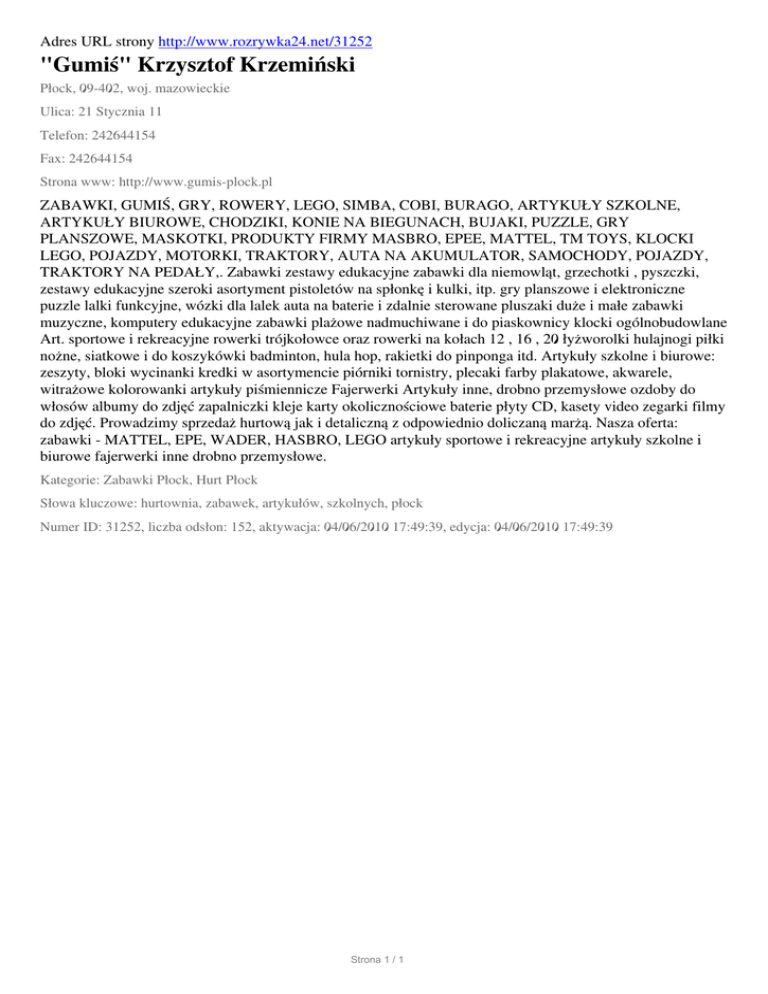 Adres URL strony http://www.rozrywka24.net/31252 "Gumiś" Krzysztof Krzemiński Płock, 09-402, woj. mazowieckie Ulica: 21 Stycznia 11 Telefon: 242644154 Fax: 242644154 Strona www: http://www.gumis-plock.pl ZABAWKI, GUMIŚ, GRY, ROWERY, LEGO, SIMBA, COBI, BURAGO, ARTYKUŁY SZKOLNE, ARTYKUŁY BIUROWE, CHODZIKI, KONIE NA BIEGUNACH, BUJAKI, PUZZLE, GRY PLANSZOWE, MASKOTKI, PRODUKTY FIRMY MASBRO, EPEE, MATTEL, TM TOYS, KLOCKI LEGO, POJAZDY, MOTORKI, TRAKTORY, AUTA NA AKUMULATOR, SAMOCHODY, POJAZDY, TRAKTORY NA PEDAŁY,. Zabawki zestawy edukacyjne zabawki dla niemowląt, grzechotki , pyszczki, zestawy edukacyjne szeroki asortyment pistoletów na spłonkę i kulki, itp. gry planszowe i elektroniczne puzzle lalki funkcyjne, wózki dla lalek auta na baterie i zdalnie sterowane pluszaki duże i małe zabawki muzyczne, komputery edukacyjne zabawki plażowe nadmuchiwane i do piaskownicy klocki ogólnobudowlane Art. sportowe i rekreacyjne rowerki trójkołowce oraz rowerki na kołach 12 , 16 , 20 łyżworolki hulajnogi piłki nożne, siatkowe i do koszykówki badminton, hula hop, rakietki do pinponga itd. Artykuły szkolne i biurowe: zeszyty, bloki wycinanki kredki w asortymencie piórniki tornistry, plecaki farby plakatowe, akwarele, witrażowe kolorowanki artykuły piśmiennicze Fajerwerki Artykuły inne, drobno przemysłowe ozdoby do włosów albumy do zdjęć zapalniczki kleje karty okolicznościowe baterie płyty CD, kasety video zegarki filmy do zdjęć. Prowadzimy sprzedaż hurtową jak i detaliczną z odpowiednio doliczaną marżą. Nasza oferta: zabawki - MATTEL, EPE, WADER, HASBRO, LEGO artykuły sportowe i rekreacyjne artykuły szkolne i biurowe fajerwerki inne drobno przemysłowe. Kategorie: Zabawki Płock, Hurt Płock Słowa kluczowe: hurtownia, zabawek, artykułów, szkolnych, płock Numer ID: 31252, liczba odsłon: 152, aktywacja: 04/06/2010 17:49:39, edycja: 04/06/2010 17:49:39 Strona 1 / 1