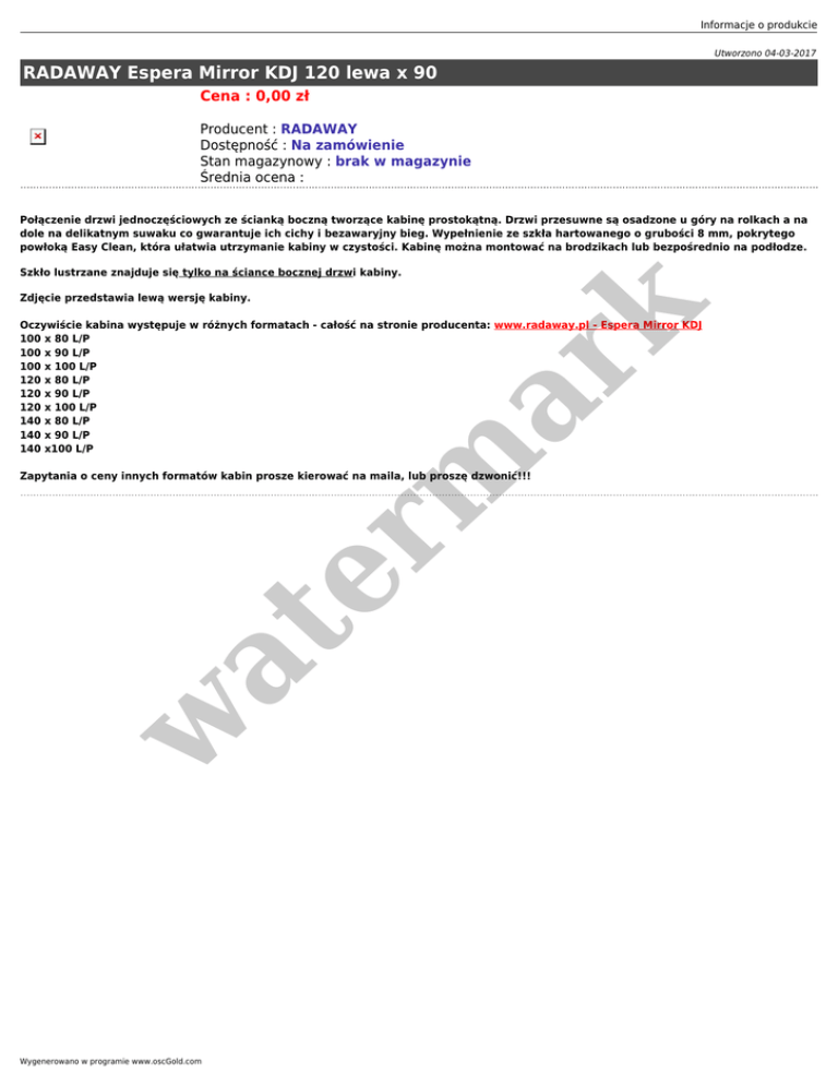Informacje o produkcie Utworzono 04-03-2017 RADAWAY Espera Mirror KDJ 120 lewa x 90 Cena : 0,00 zł Producent : RADAWAY Dostępność : Na zamówienie Stan magazynowy : brak w magazynie Średnia ocena : Połączenie drzwi jednoczęściowych ze ścianką boczną tworzące kabinę prostokątną. Drzwi przesuwne są osadzone u góry na rolkach a na dole na delikatnym suwaku co gwarantuje ich cichy i bezawaryjny bieg. Wypełnienie ze szkła hartowanego o grubości 8 mm, pokrytego powłoką Easy Clean, która ułatwia utrzymanie kabiny w czystości. Kabinę można montować na brodzikach lub bezpośrednio na podłodze. Szkło lustrzane znajduje się tylko na ściance bocznej drzwi kabiny. er m ar k Zdjęcie przedstawia lewą wersję kabiny. Oczywiście kabina występuje w różnych formatach - całość na stronie producenta: www.radaway.pl - Espera Mirror KDJ 100 x 80 L/P 100 x 90 L/P 100 x 100 L/P 120 x 80 L/P 120 x 90 L/P 120 x 100 L/P 140 x 80 L/P 140 x 90 L/P 140 x100 L/P w at Zapytania o ceny innych formatów kabin prosze kierować na maila, lub proszę dzwonić!!! Wygenerowano w programie www.oscGold.com