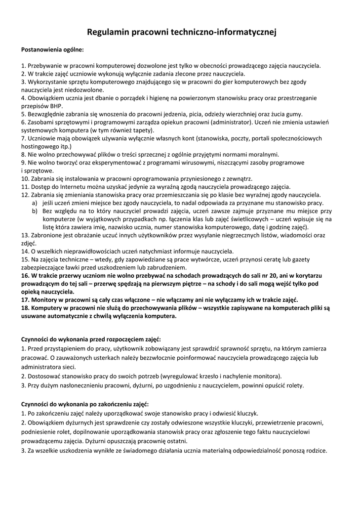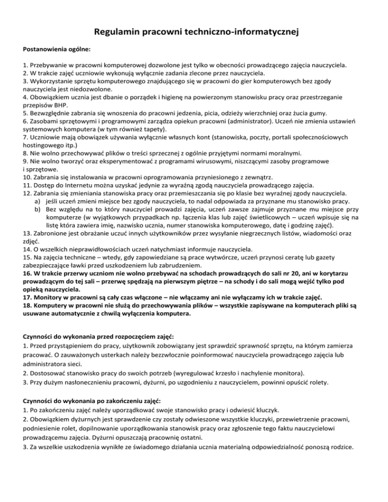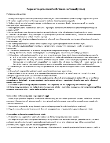 Regulamin pracowni techniczno-informatycznej Postanowienia ogólne: 1. Przebywanie w pracowni komputerowej dozwolone jest tylko w obecności prowadzącego zajęcia nauczyciela. 2. W trakcie zajęć uczniowie wykonują wyłącznie zadania zlecone przez nauczyciela. 3. Wykorzystanie sprzętu komputerowego znajdującego się w pracowni do gier komputerowych bez zgody nauczyciela jest niedozwolone. 4. Obowiązkiem ucznia jest dbanie o porządek i higienę na powierzonym stanowisku pracy oraz przestrzeganie przepisów BHP. 5. Bezwzględnie zabrania się wnoszenia do pracowni jedzenia, picia, odzieży wierzchniej oraz żucia gumy. 6. Zasobami sprzętowymi i programowymi zarządza opiekun pracowni (administrator). Uczeń nie zmienia ustawień systemowych komputera (w tym również tapety). 7. Uczniowie mają obowiązek używania wyłącznie własnych kont (stanowiska, poczty, portali społecznościowych hostingowego itp.) 8. Nie wolno przechowywać plików o treści sprzecznej z ogólnie przyjętymi normami moralnymi. 9. Nie wolno tworzyć oraz eksperymentować z programami wirusowymi, niszczącymi zasoby programowe i sprzętowe. 10. Zabrania się instalowania w pracowni oprogramowania przyniesionego z zewnątrz. 11. Dostęp do Internetu można uzyskać jedynie za wyraźną zgodą nauczyciela prowadzącego zajęcia. 12. Zabrania się zmieniania stanowiska pracy oraz przemieszczania się po klasie bez wyraźnej zgody nauczyciela. a) jeśli uczeń zmieni miejsce bez zgody nauczyciela, to nadal odpowiada za przyznane mu stanowisko pracy. b) Bez względu na to który nauczyciel prowadzi zajęcia, uczeń zawsze zajmuje przyznane mu miejsce przy komputerze (w wyjątkowych przypadkach np. łączenia klas lub zajęć świetlicowych – uczeń wpisuje się na listę która zawiera imię, nazwisko ucznia, numer stanowiska komputerowego, datę i godzinę zajęć). 13. Zabronione jest obrażanie uczuć innych użytkowników przez wysyłanie niegrzecznych listów, wiadomości oraz zdjęć. 14. O wszelkich nieprawidłowościach uczeń natychmiast informuje nauczyciela. 15. Na zajęcia techniczne – wtedy, gdy zapowiedziane są prace wytwórcze, uczeń przynosi ceratę lub gazety zabezpieczające ławki przed uszkodzeniem lub zabrudzeniem. 16. W trakcie przerwy uczniom nie wolno przebywać na schodach prowadzących do sali nr 20, ani w korytarzu prowadzącym do tej sali – przerwę spędzają na pierwszym piętrze – na schody i do sali mogą wejść tylko pod opieką nauczyciela. 17. Monitory w pracowni są cały czas włączone – nie włączamy ani nie wyłączamy ich w trakcie zajęć. 18. Komputery w pracowni nie służą do przechowywania plików – wszystkie zapisywane na komputerach pliki są usuwane automatycznie z chwilą wyłączenia komputera. Czynności do wykonania przed rozpoczęciem zajęć: 1. Przed przystąpieniem do pracy, użytkownik zobowiązany jest sprawdzić sprawność sprzętu, na którym zamierza pracować. O zauważonych usterkach należy bezzwłocznie poinformować nauczyciela prowadzącego zajęcia lub administratora sieci. 2. Dostosować stanowisko pracy do swoich potrzeb (wyregulować krzesło i nachylenie monitora). 3. Przy dużym nasłonecznieniu pracowni, dyżurni, po uzgodnieniu z nauczycielem, powinni opuścić rolety. Czynności do wykonania po zakończeniu zajęć: 1. Po zakończeniu zajęć należy uporządkować swoje stanowisko pracy i odwiesić kluczyk. 2. Obowiązkiem dyżurnych jest sprawdzenie czy zostały odwieszone wszystkie kluczyki, przewietrzenie pracowni, podniesienie rolet, dopilnowanie uporządkowania stanowisk pracy oraz zgłoszenie tego faktu nauczycielowi prowadzącemu zajęcia. Dyżurni opuszczają pracownię ostatni. 3. Za wszelkie uszkodzenia wynikłe ze świadomego działania ucznia materialną odpowiedzialność ponoszą rodzice.