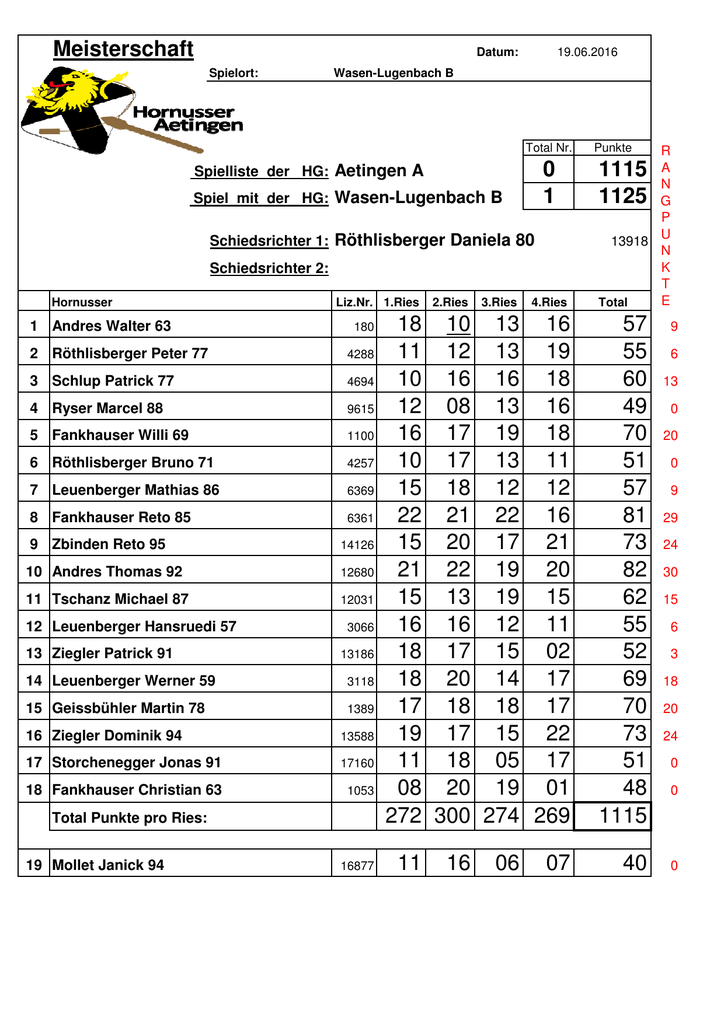 Meisterschaft Datum: Wasen-Lugenbach B Spielort: 19.06.2016 Wasen-Lugenbach B Total Nr. 0 1 Spielliste der HG: Aetingen A Spiel mit der HG: Wasen-Lugenbach B Schiedsrichter 1: Röthlisberger Daniela 80 Schiedsrichter 2: Hornusser 1 Andres Walter 63 Liz.Nr. 1.Ries 180 2 Röthlisberger Peter 77 4288 3 Schlup Patrick 77 4694 4 Ryser Marcel 88 9615 5 Fankhauser Willi 69 1100 6 Röthlisberger Bruno 71 4257 7 Leuenberger Mathias 86 6369 8 Fankhauser Reto 85 6361 9 Zbinden Reto 95 14126 10 Andres Thomas 92 12680 11 Tschanz Michael 87 12031 12 Leuenberger Hansruedi 57 13 Ziegler Patrick 91 3066 13186 14 Leuenberger Werner 59 3118 15 Geissbühler Martin 78 1389 16 Ziegler Dominik 94 13588 17 Storchenegger Jonas 91 17160 18 Fankhauser Christian 63 1053 Total Punkte pro Ries: 19 Mollet Janick 94 16877 2.Ries 3.Ries 4.Ries 18 10 13 16 11 12 13 19 10 16 16 18 12 08 13 16 16 17 19 18 10 17 13 11 15 18 12 12 22 21 22 16 15 20 17 21 21 22 19 20 15 13 19 15 16 16 12 11 18 17 15 02 18 20 14 17 17 18 18 17 19 17 15 22 11 18 05 17 08 20 19 01 272 300 274 269 11 16 06 07 Punkte R A N G P U 13918 N K T E Total 1115 1125 57 55 60 49 70 51 57 81 73 82 62 55 52 69 70 73 51 48 1115 40 9 6 13 0 20 0 9 29 24 30 15 6 3 18 20 24 0 0 0
