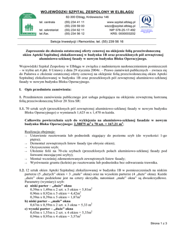 WOJEWÓDZKI SZPITAL ZESPOLONY W ELBLĄGU 82-300 Elbląg, Królewiecka 146 tel. centrala tel. sekretariat tel./fax. (55) 234 41 11 (55) 239 59 00 (55) 234 62 11 (55) 234 56 12 www.szpital.elblag.pl [email protected] NIP 578-25-17-492 KRS: 0000003202 STATUS SZPITALA AKREDYTOWANEGO NR 2011/18 Sekcja Inwestycji i Remontów, tel. (55) 239 56 16 Zaproszenie do złożenia ostatecznej oferty cenowej na oklejenie folią przeciwsłoneczną okien Apteki Szpitalnej zlokalizowanej w budynku 1B oraz przeszklonych pól zewnętrznej aluminiowo-szklanej fasady w nowym budynku Bloku Operacyjnego. Wojewódzki Szpital Zespolony w Elblągu w związku z nadmiernym nasłonecznieniem pomieszczeń – w trybie art.4 pkt. 8 Ustawy z dnia 29 stycznia 2004r. – Prawo zamówień publicznych – zwraca się do Państwa o złożenie ostatecznej oferty cenowej na oklejenie folią przeciwsłoneczną okien Apteki Szpitalnej zlokalizowanej w budynku 1B oraz przeszklonych pól zewnętrznej aluminiowo-szklanej fasady w nowym budynku Bloku Operacyjnego. I. Opis przedmiotu zamówienia: 1. Przedmiotem zamówienia publicznego jest usługa polegająca na oklejeniu zewnętrzną lustrzaną folią przeciwsłoneczną Silver 20 Xtra SR: 1.1. 70 sztuk szyb (przeszklonych pól zewnętrznej aluminiowo-szklanej fasady w nowym budynku Bloku Operacyjnego) o wymiarach 1,625 m x 1,470 m każda. Całkowita powierzchnia szyb do wyklejenia na aluminiowo-szklanej fasadzie w nowym budynku Bloku Operacyjnego: 2,38875 m2 x 70 szt. = 167,21 m2; Realizacja obejmuje: → Ustawienie rusztowania lub podnośnik sięgający do poziomu szyb (do wysokości 1-go piętra); → Demontaż zewnętrznych listew fasady (po obrysie okien); → Oczyszczenie szyb; → Ułożenie folii na 70-ciu szybach (przeszklonych polach aluminiowo-szklanej fasady pod listwami mocującymi szyby); → Montaż wcześniej zdemontowanych zewnętrznych listew fasady; → Wyrównanie gruntu (kolein) po rusztowaniu lub podnośniku bez odtwarzania trawnika. 1.2. 12 sztuk okien Apteki Szpitalnej zlokalizowanej w budynku 1B w pomieszczeniach na niskim parterze (5 „dużych” okien + 3 „małe” okna) oraz na wysokim parterze (4 „duże” okna). Każde „duże” okno podzielone jest na cztery skrzydła, natomiast „małe” okna” są dwuskrzydłowe. Parametry (wymiary) szyb: a) niski parter – „duże” okna 0,39m x 1,49m x 2 szt. x 5 okien = 5,81m2 0,96m x 0,92m x 5 okien = 4,42m2 0,39m x 0,39m x 5 okien = 1,87m2 b) niski parter – „małe” okna 0,67m x 0,59m x 2 szt. x 3 okna = 5,33 m2 c) wysoki parter – „duże” okna 0,43m x 1,55m x 2 szt. x 4 okien = 5,33m2 0,94m x 0,95m x 4 okien = 3,57m2 Strona 1 z 3 0,94m x 0,25m x 4 okien = 0,94m2 Razem w oknach Apteki Szpitalnej do wyklejenia są 42 szt. szyb, tj. 24,31m2 Realizacja obejmuje: → Oczyszczenie szyb; → Ułożenie folii na 42 szybach; → W przypadku konieczności demontaż i montaż szyb oraz wewnętrznych listew i uszczelek mocujących szyby. 2. Wymagane przez Zamawiającego parametry optyczne i słoneczne zewnętrznej lustrzanej folii przeciwsłonecznej Silver 20 Xtra SR: → Transmisja światła widzianego 16% → Odbicie światła widzianego 64% → Transmisja promieni UV 0,3% → Odbicie całkowitej energii słonecznej 67% → Transmisja całkowitej energii słonecznej 12% → Absorpcja całkowitej energii słonecznej 21% → Redukcja odblasków 82% → Współczynnik zacienienia 0,2 → Współczynnik zysku ciepła słonecznego 0,17 → Całkowita energia słoneczna zatrzymana 83% Wykonawca najpóźniej w dniu odbioru przedmiotu zamówienia zobowiązany jest dostarczyć Zamawiającemu stosowne dokumenty (m.in. aprobaty techniczne, atesty, itp.) potwierdzające wymagane przez Zamawiającego w/w parametry optyczne i słoneczne zewnętrznej folii przeciwsłonecznej stosowanej do realizacji przedmiotowej usługi (kopie złożonych dokumentów Wykonawca potwierdzi za zgodność z oryginałem). II. Warunki realizacji 1. Termin realizacji: do 4 tygodni licząc od daty podpisania umowy 2. Termin płatności: 30 dni licząc od dnia odebrania przez Zamawiającego całego przedmiotu zamówienia oraz dostarczenia faktury 3. Gwarancje – na cały przedmiot zamówienia min. 36 - miesięcy 4. Zamawiający nie dopuszcza składania ofert częściowych. 5. Strony ustalają, że wierzytelności wynikające z niniejszej umowy nie podlegają cesji bez zgody Zamawiającego 6. Wykonawca oświadcza, że nie przyjmie poręczenia od jakiegokolwiek podmiotu dotyczącego wierzytelności wynikającej z umowy. 7. Faktura musi zawierać wzmiankę o zakazie cesji. 8. Brak wzmianki powoduje odpowiedzialność odszkodowawczą względem Zamawiającego. III. Kryteria oceny ofert: 1. cena – 100% IV. Wymogi: Dokumenty należy złożyć w formie oryginału lub kopii potwierdzonej za zgodność z oryginałem przez Wykonawcę. Strona 2 z 3 1. Oferta powinna być podpisana przez osoby umocowane do składania oświadczeń woli i zaciągania zobowiązań w imieniu Wykonawcy. Umocowanie do składania ofert winno być dołączone do oferty o ile nie wynika ono wprost z innych dokumentów załączonych do oferty. 2. Wykonawca zobowiązany jest załączyć do oferty aktualny odpis z właściwego rejestru lub z centralnej ewidencji i informacji o działalności gospodarczej, jeżeli odrębne przepisy wymagają wpisu do rejestru lub ewidencji, wystawione nie wcześniej niż 6 miesięcy przed upływem terminu składania ofert 3. Ofertę opatrzoną następującym napisem: „Oferta na oklejenie folią przeciwsłoneczną okien Apteki Szpitalnej oraz przeszklonych pól zewnętrznej aluminiowo-szklanej fasady w Wojewódzkim Szpitalu Zespolonym w Elblągu przy ul. Królewieckiej 146” prosimy przesłać w terminie do dnia 24.07.2014r. na adres: Wojewódzki Szpital Zespolony w Elblągu , ul. Królewiecka 146, 82-300 Elbląg Sekretariat pok. Nr 44 Załączone pliki: Załącznik nr 1: Formularz oferty Załącznik nr 2: Wzór umowy Strona 3 z 3
