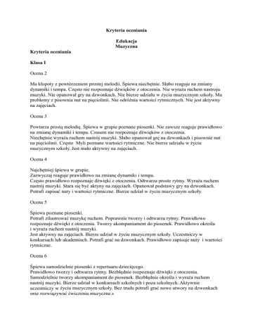Kryteria oceniania Edukacja Muzyczna Kryteria oceniania Klasa I Ocena 2 Ma kłopoty z powtórzeniem prostej melodii. Śpiewa niechętnie. Słabo reaguje na zmiany dynamiki i tempa. Często nie rozpoznaje dźwięków z otoczenia. Nie wyraża ruchem nastroju muzyki. Nie opanował gry na dzwonkach. Nie bierze udziału w życiu muzycznym szkoły. Ma problemy z pisownia nut na pięciolinii. Nie odróżnia wartości rytmicznych. Nie jest aktywny na zajęciach. Ocena 3 Powtarza prostą melodię. Śpiewa w grupie poznane piosenki. Nie zawsze reaguje prawidłowo na zmianę dynamiki i tempa. Czasem nie rozpoznaje dźwięków z otoczenia. Niechętnie wyraża ruchem nastrój muzyki. Słabo opanował grę na dzwonkach i pisownie nut na pięciolinii. Często Myli poznane wartości rytmiczne. Nie bierze udziału w życiu muzycznym szkoły. Jest mało aktywny na zajęciach. Ocena 4 Najchętniej śpiewa w grupie. Zazwyczaj reaguje prawidłowo na zmianę dynamiki i tempa. Często prawidłowo rozpoznaje dźwięki z otoczenia. Odtwarza proste rytmy. Wyraża ruchem nastrój muzyki. Stara się być aktyny na zajęciach. Opanował podstawy gry na dzwonkach. Potrafi zapisać nuty i wartości rytmiczne. Bierze udział w życiu muzycznym szkoły. Ocena 5 Śpiewa poznane piosenki. Potrafi zilustrować muzykę ruchem. Poprawnie tworzy i odtwarza rytmy. Prawidłowo rozpoznaje dźwięki z otoczenia. Tworzy akompaniament do piosenek. Prawidłowo określa i wyraża ruchem nastrój muzyki. Jest aktywny na zajęciach. Bierze udział w życiu muzycznym szkoły. Uczestniczy w konkursach lub akademiach. Potrafi grać na dzwonkach. Prawidłowo zapisuje nuty i wartości rytmiczne. Ocena 6 Śpiewa samodzielnie piosenki z repertuaru dziecięcego. Prawidłowo tworzy i odtwarza rytmy. Bezbłędnie rozpoznaje dźwięki z otoczenia. Samodzielnie tworzy akompaniament do piosenek. Bezbłędnie określa i wyraża ruchem nastrój muzyki. Bierze udział w konkursach szkolnych i poza szkolnych. Aktywnie uczestniczy w życiu muzycznym szkoły. Bez trudu potrafi grać nowe utwory na dzwonkach oraz rozwiązywać ćwiczenia muzyczne.s Klasa II Ocena 2 Nie opanował słów i melodii poznanych piosenek, wykazuje małą aktywność w czasie zajęć muzycznych. Nie potrafi zagrać na dzwonkach prostych melodii oraz prostych rytmów na instrumentach perkusyjnych. Nie bierze udziału w życiu muzycznym szkoły. Ma problemy z pisownią nut na pięciolinii. Nie odróżnia wartości rytmicznych. Nie jest aktywny na zajęciach. Ocena 3 Śpiewa fragmenty poznanych piosenek, wykazuje małą aktywność w czasie zajęć muzycznych. Nie zawsze poprawnie gra na dzwonkach proste melodie oraz proste rytmy na instrumentach perkusyjnych. Słabo opanował pisownię nut na pięciolinii. Często myli poznane wartości rytmiczne. Nie bierze udziału w życiu muzycznym szkoły. Ocena 4 Śpiewa indywidualnie i w zespole poznane piosenki, wykazuje poprawną aktywność w czasie zajęć muzycznych. Poprawnie gra na dzwonkach proste melodie oraz proste rytmy na instrumentach perkusyjnych. Potrafi zapisać nuty i wartości rytmiczne. Bierze udział w życiu muzycznym szkoły. Ocena 5 Chętnie śpiewa indywidualnie i w zespole poznane piosenki, wykazuje dużą aktywność w czasie zajęć muzycznych. Sprawnie gra na dzwonkach proste melodie oraz proste rytmy na instrumentach perkusyjnych. Bierze udział w życiu muzycznym szkoły. Uczestniczy w konkursach lub akademiach. Prawidłowo zapisuje nuty i wartości rytmiczne. Rozumie podstawowe pojęcia muzyczne i potrafi je zastosować. Ocena 6 Bardzo chętnie śpiewa indywidualnie i w zespole poznane piosenki, zawsze jest aktywny w czasie zajęć muzycznych. Sprawnie gra na dzwonkach różne melodie oraz rytmy na instrumentach perkusyjnych. Bierze udział w konkursach szkolnych i poza szkolnych. Aktywnie uczestniczy w życiu muzycznym szkoły. Bez trudu potrafi rozwiązywać ćwiczenia muzyczne. Posiada wiedzę na temat zasad muzyki i potrafi ja zastosować. Klasa 3 Ocena 2 Ma kłopoty z zapamiętaniem słów i melodii poznanych piosenek śpiewa niechętnie, w czasie zajęć nie wykazuje aktywności. Nie bierze udziału w życiu muzycznym szkoły. Ma problemy z pisownią nut na pięciolinii. Nie odróżnia wartości rytmicznych. Ocena 3 Śpiewa poznane piosenki tylko w grupie. Akompaniuje przy użyciu instrumentów perkusyjnych. Słabo opanował grę na dzwonkach i pisownię nut na pięciolinii. Często myli poznane wartości rytmiczne. Nie bierze udziału w życiu muzycznym szkoły. Jest mało aktywny na zajęciach Ocena 4 Śpiewa poznane piosenki indywidualnie i zbiorowo, gra na instrumencie melodycznym proste melodie oparte na poznanych dźwiękach, swobodnie interpretuje ruchem tematy rytmiczne, piosenki, utwory instrumentalne. Stara się być aktyny na zajęciach. Potrafi zapisać nuty i wartości rytmiczne. Bierze udział w życiu muzycznym szkoły. Ocena 5 Śpiewa piosenki z dziecięcego repertuaru, odtwarza rytmy głosem i na instrumentach perkusyjnych, gra na instrumencie melodycznym poznane melodie, świadomie i aktywnie słucha muzyki, zna podstawowe kroki tańców np. krakowiaka, polki, poloneza, kulturalnie zachowuje się podczas zajęć oraz w czasie śpiewania. Jest aktywny na zajęciach. Bierze udział w życiu muzycznym szkoły. Uczestniczy w konkursach lub akademiach. Prawidłowo zapisuje nuty i wartości rytmiczne. Rozumie i potrafi zastosować poznane pojęcia muzyczne. Ocena 6 Wykazuje ponadprzeciętne umiejętności muzyczne – rozpoznaje różne rodzaje muzyki na podstawie nastroju, tempa i innych elementów, wyraża swe doznania związane z poznawanymi utworami muzycznymi ilustruje je za pomocą obrazów, ruchów i słów, rozpoznaje i odczytuje znaki muzyczne, gra na instrumentach muzycznych, uczestniczy w szkolnych i pozaszkolnych formach aktywności muzycznej. Ma zdolności wokalne lub gry na instrumentach. Bez trudu potrafi rozwiązywać ćwiczenia muzyczne. Posiada wiedzę muzyczną i potrafi ją