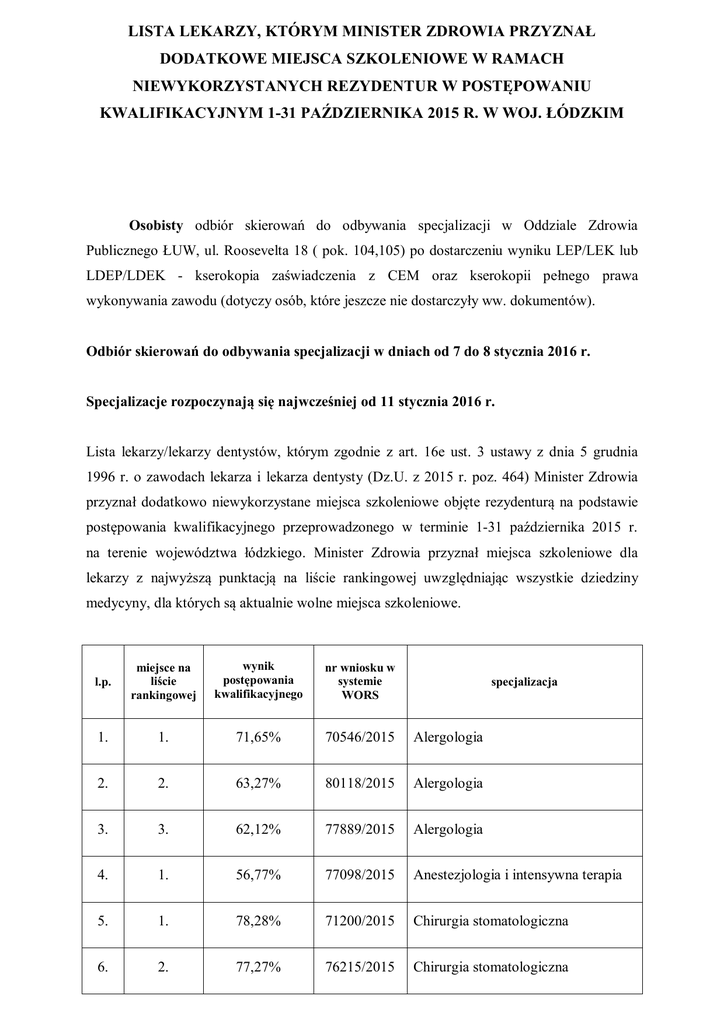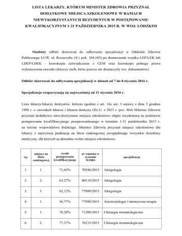 LISTA LEKARZY, KTÓRYM MINISTER ZDROWIA PRZYZNAŁ DODATKOWE MIEJSCA SZKOLENIOWE W RAMACH NIEWYKORZYSTANYCH REZYDENTUR W POSTĘPOWANIU KWALIFIKACYJNYM 1-31 PAŹDZIERNIKA 2015 R. W WOJ. ŁÓDZKIM Osobisty odbiór skierowań do odbywania specjalizacji w Oddziale Zdrowia Publicznego ŁUW, ul. Roosevelta 18 ( pok. 104,105) po dostarczeniu wyniku LEP/LEK lub LDEP/LDEK - kserokopia zaświadczenia z CEM oraz kserokopii pełnego prawa wykonywania zawodu (dotyczy osób, które jeszcze nie dostarczyły ww. dokumentów). Odbiór skierowań do odbywania specjalizacji w dniach od 7 do 8 stycznia 2016 r. Specjalizacje rozpoczynają się najwcześniej od 11 stycznia 2016 r. Lista lekarzy/lekarzy dentystów, którym zgodnie z art. 16e ust. 3 ustawy z dnia 5 grudnia 1996 r. o zawodach lekarza i lekarza dentysty (Dz.U. z 2015 r. poz. 464) Minister Zdrowia przyznał dodatkowo niewykorzystane miejsca szkoleniowe objęte rezydenturą na podstawie postępowania kwalifikacyjnego przeprowadzonego w terminie 1-31 października 2015 r. na terenie województwa łódzkiego. Minister Zdrowia przyznał miejsca szkoleniowe dla lekarzy z najwyższą punktacją na liście rankingowej uwzględniając wszystkie dziedziny medycyny, dla których są aktualnie wolne miejsca szkoleniowe. l.p. miejsce na liście rankingowej wynik postępowania kwalifikacyjnego nr wniosku w systemie WORS 1. 1. 71,65% 70546/2015 Alergologia 2. 2. 63,27% 80118/2015 Alergologia 3. 3. 62,12% 77889/2015 Alergologia 4. 1. 56,77% 77098/2015 Anestezjologia i intensywna terapia 5. 1. 78,28% 71200/2015 Chirurgia stomatologiczna 6. 2. 77,27% 76215/2015 Chirurgia stomatologiczna specjalizacja 7. 3. 76,56% 70958/2015 Chirurgia stomatologiczna 8. 4. 74,75% 70402/2015 Chirurgia stomatologiczna 9. 5. 74,50% 74549/2015 Chirurgia stomatologiczna 10. 6. 73,50% 76696/2015 Chirurgia stomatologiczna 11. 7. 73,47% 72231/2015 Chirurgia stomatologiczna 12. 1. 78,79% 74718/2015 Dermatologia i wenerologia 13. 2. 77,60% 75792/2015 Dermatologia i wenerologia 14. 1. 75,00% 74490/2015 Kardiologia 15. 2/3 73,96% 78956/2015 Kardiologia 16. 2/3 73,96% 79248/2015 Kardiologia 17. 4. 72,73% 77314/2015 Kardiologia 18. 5. 70,71% 75144/2015 Kardiologia 19. 6. 69,27% 79116/2015 Kardiologia 20. 7. 67,01% 71439/2015 Kardiologia 21. 1. 71,88% 74460/2015 Neurochirurgia 22. 1. 63,02% 71535/2015 Neurologia 23. 2. 57,14% 75568/2015 Neurologia 24. 1. 78,28% 77526/2015 Okulistyka 25. 2. 76,80% 77881/2015 Okulistyka 26. 3. 76,77% 79124/2015 Okulistyka 27. 4/5. 75,76% 75384/2015 Okulistyka 28. 4/5. 75,76% 71643/2015 Okulistyka 29. 6. 71,35% 71048/2015 Okulistyka 30. 7. 69,59% 71327/2015 Okulistyka 31. 8. 68,88% 72130/2015 Okulistyka 32. 9. 65,10% 79123/2015 Okulistyka 33. 10. 64,43% 77455/2015 Okulistyka 34. 11. 64,14% 76475/2015 Okulistyka 35. 12. 62,89% 75294/2015 Okulistyka 36. 13. 60,42% 70354/2015 Okulistyka 37. 1. 70,10% 74500/2015 Otorynolaryngologia 38. 2. 64,80% 74920/2015 Otorynolaryngologia 39. 3. 56,06% 73021/2015 Otorynolaryngologia 40. 1. 72,79% 77816/2015 Położnictwo i ginekologia 41. 2. 71,21% 77607/2015 Położnictwo i ginekologia 42. 3/4 69,79% 76641/2015 Położnictwo i ginekologia 43. 3/4 69,79% 70451/2015 Położnictwo i ginekologia 44. 5. 68,75% 79831/2015 Położnictwo i ginekologia 45. 6. 68,69% 76843/2015 Położnictwo i ginekologia 46. 7. 68,04% 79560/2015 Położnictwo i ginekologia 47. 8. 66,67% 73300/2015 Położnictwo i ginekologia 48. 9. 64,65% 75335/2015 Położnictwo i ginekologia 49. 10. 63,64% 79645/2015 Położnictwo i ginekologia 50. 11. 63,40% 77528/2015 Położnictwo i ginekologia 51. 12. 63,02% 78364/2015 Położnictwo i ginekologia 52. 13. 62,89% 77400/2015 Położnictwo i ginekologia 53. 14. 60,82% 77006/2015 Położnictwo i ginekologia 54. 1/2. 79,29% 78911/2015 Protetyka stomatologiczna 55. 1/2. 79,29% 71210/2015 Protetyka stomatologiczna 56. 1. 79,80% 73297/2015 Radiologia i diagnostyka obrazowa 57. 2. 74,74% 78259/2015 Radiologia i diagnostyka obrazowa 58. 3. 72,22% 79525/2015 Radiologia i diagnostyka obrazowa 59. 4. 71,35% 75068/2015 Radiologia i diagnostyka obrazowa 60. 5. 64,14% 78140/2015 Radiologia i diagnostyka obrazowa 61. 6. 63,13% 71537/2015 Radiologia i diagnostyka obrazowa 62. 7. 61,34% 72089/2015 Radiologia i diagnostyka obrazowa 63. 1. 73,74% 70682/2015 Stomatologia dziecięca 64. 1. 71,21% 76872/2015 Stomatologia zachowawcza z endodoncją 65. 1. 71,88% 74038/2015 Urologia 66. 2. 71,72% 80046/2015 Urologia 67. 3. 71,43% 70385/2015 Urologia 68. 4. 61,34% 76582/2015 Urologia 69. 5. 59,38% 74953/2015 Urologia