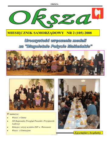 OKSZA MIESIĘCZNIK SAMORZĄDOWY NR 2 (105) 2008 W numerze: ♦ Wieści z Gminy ♦ XII Regionalny Przegląd Piosenki i Przyśpiewki Ludowej ♦ Relacja z wizyty uczniów ZSP w Warszawie ♦ Wieści z Gimnazjum Strona 1 Egzemplarz bezpłatny OKSZA Warsztaty Plastyczne dla dzieci , w tle Wiesława Wojtowicz, jedna z artystek prowadzących zajęcia Finał zawodów w ping—ponga Najsilniejsi uczestnicy zawodów siłowych Turniej w piłkarzyki stołowe cieszył się dużym zainteresowaniem Strona 2 OKSZA Informujemy.. Zgodnie z art. 61 ustawy Prawo budowlane właściciel lub zarządca obiektu budowlanego jest obowiązany użytkować go zgodne z jego przeznaczeniem oraz utrzymywać w należytym stanie technicznym i estetycz- nym. W związku ze zbliżającą się wiosną prosimy o zadbanie o wygląd swoich posesji. W przypadku budynków i budowli znajdujących się w złym stanie technicznym sprawy kierowane są do Powiatowego Inspektora Nadzoru Budowlanego w Chełmie. Nadzór budowlany po przeprowadzeniu kontroli może nakazać właścicielowi wykonanie doraźnych zabezpieczeń i usunięcie zagrożenia bezpieczeństwa ludzi lub mienia, z określeniem, technicznie uzasadnionych, terminów ich wykonania ( art.68 cytowanej ustawy). Numeracja porządkowa nieruchomości Zasady numeracji porządkowej nieruchomości, prowadzenia dokumentacji w tym zakresie oraz obowiązki właścicieli nieruchomości określają następujące przepisy prawne: ustawa z dnia 17 maja 1989 r. prawo geodezyjne i kartograficzne / tekst jednolity z 2000 r. Dz. U. Nr 100, poz. 1086, z późn. zm./; Rozporządzenie Ministra Infrastruktury z dnia 28 października 2004 r. w sprawie numeracji porządkowej nieruchomości / Dz. U. Nr 243, poz. 2432 /. W myśl wymienionych wyżej przepisów /art. 47a ustawy/ do zadań gminy należy: prowadzenie i aktualizowanie ewidencji numeracji porządkowej oraz ustalanie numerów nieruchomości zabudowanych i przeznaczonych pod budowę umieszczanie i utrzymywanie w należytym stanie tablic z nazwami ulic i placów. Do obowiązków właścicieli nieruchomości /art. 47b wymienionej ustawy oraz § 10 rozporządzenia/ należy: umieszczenie na nieruchomości w widocznym miejscu i utrzymywania w należytym stanie: a) tabliczki z numerem porządkowym i nazwą miejscowości - w miejscowościach w których nie ma ulic; b) tabliczki z numerem porządkowym i nazwą ulicy – w miejscowościach w których występują ulice w przypadku gdy budynek znajduje się wgłębi nieruchomości tabliczkę z numerem należy umieścić również na ogrodzeniu przy ulicy. Oznaczenie nieruchomości numerem porządkowym następuje na wniosek jej właściciela. We wniosku o nadanie numeru porządkowego należy wskazać numer działki z ewidencji gruntów i właściciela nieruchomości. Nadanie numeru porządkowego następuje w drodze decyzji Wójta Gminy. Właściciele wszystkich nieruchomości na terenie gminy powinni zastosować się do w/ w obowiązków i właściwie oznakować swoje nieruchomości, tak aby numer na tabliczce był zgodny z ewidencją porządkową nieruchomości. Brak tabliczek z numerami nieruchomości utrudnia w wielu przypadkach dotarcie pod właściwy adres pogotowia ratunkowego i innych służb oraz może narazić właściciela nieruchomości na odpowiedzialność karną. REJON I 1. REJOWIEC 2. WÓLKA REJOWIECKA 3. KOBYLE LP. REJON II 1. CZECHÓW KĄT 2. ZAGRODY 3. MARYNIN SIEDLISZCZKI HRUSZÓW MIESIĄC DZIEŃ ODBIORU ZMIESESZANE GREG OWA NE REJON III 1. ZAWADÓWKA 2. MARYSIN 3. ADAMÓW 4. WERESZCZE M. REJON IV 1. WERESZCZE D. 2. LEONÓW 3. BIENIÓW 4. ZYNGIERÓWKA 5. STARY MAJDAN 6. AL. KRZYWOWOLSKA DZIEŃ ODBIORU DZIEŃ ODBIORU DZIEŃ ODBIORU ZMIESEGRESZANE GOWANE ZMIESZANE SEGRE GO WA NE REJON V 1. RYBIE 2. AL. NIEDZIAŁOWSKA 3. NIEDZIAŁOWICE 4. BAŃKOWSZCZYZNA DZIEŃ ODBIORU ZMIE- SEGRE- ZMIESEGRESZANE GOWA SZANE GOWANE NE 1. LUTY 4 5 6 7 8 11 11 12 13 14 2. MARZEC 3 - 5 - 7 - 10 - 12 - 3. KWIE CIEŃ 1 2 3 4 7 8 9 10 11 14 4. MAJ 5 - 7 - 9 - 12 - 14 - 5. CZERWIEC 2 3 4 5 6 9 9 10 11 12 Strona 3 INFORMACJA Urząd Gminy Rejowiec informuje wszystkich mieszkańców gminy o możliwości zawarcia umowy na odbiór odpadów komunalnych z Zakładem Usług Komunalnych w Rejowcu. Umowę można zawrzeć na miejscu w ZUK przy ul. Przemysłowej lub dokonać kontaktu telefonicznego z nr 0825687080 celem zgłoszenia chęci zawarcia umowy, wówczas pracownik zakładu przyjedzie na miejsce celem jej spisania. Istnieje możliwość otrzymania worków na segregację odpadów jak również kupna lub dzierżawy pojemnika. A obok harmonogram odbioru odpadów z terenu gminy. OKSZA Podsumowań czas 2007 rok za nami, zatem właściwa pora na jego podsumowanie. Janina Danielczuk: Panie Wójcie – jak ocenia Pan miniony rok? Tadeusz Górski: Nie był to łatwy rok, a nawet mogę otwarcie powiedzieć – trudny. Budżet napięty do granic wytrzymałości po prostu nie wytrzymywał. Musieliśmy ratować się kredytami. J.D. Gdzie szukać przyczyn takiego stanu? Celowo użyłam liczby mnogiej, gdyż było ich więcej. T.G. Tak, kolejne nakładały się jedna na drugą. Upadłość Spółki Hardword Sawmill w Zawadówce spowodowała, że budżet gminy w 2007 r. stracił ponad 500 tys. zł, gdyż nie spływały należności podatkowe w takiej kwocie. Wielu mieszkańców wcześniej tam zatrudnionych, straciło pracę i zwróciło się o pomoc do GOPS – u, co zwiększyło koszty zadań własnych gminy. Potrzebujących nie można było zostawić bez pomocy. Od osób fizycznych nie wpłynęło ok. 70 tys. podatków, które w dochodach były zaplanowane. J.D. Panie Wójcie, ostatnio media głośno i nie zawsze zgodnie z prawdą poruszają problem oświaty w gminie. A ta kosztuje naprawdę drogo. T.G. Prawda jest taka, że do oświaty rocznie dokładamy naprawdę wielkie pieniądze. W 2007 r. dołożyliśmy z budżetu gminy aż ok. 1.900.000 zł. Subwencja otrzymana z Ministerstwa to kwota 4.059.672 zł, zaś koszty funkcjonowa
