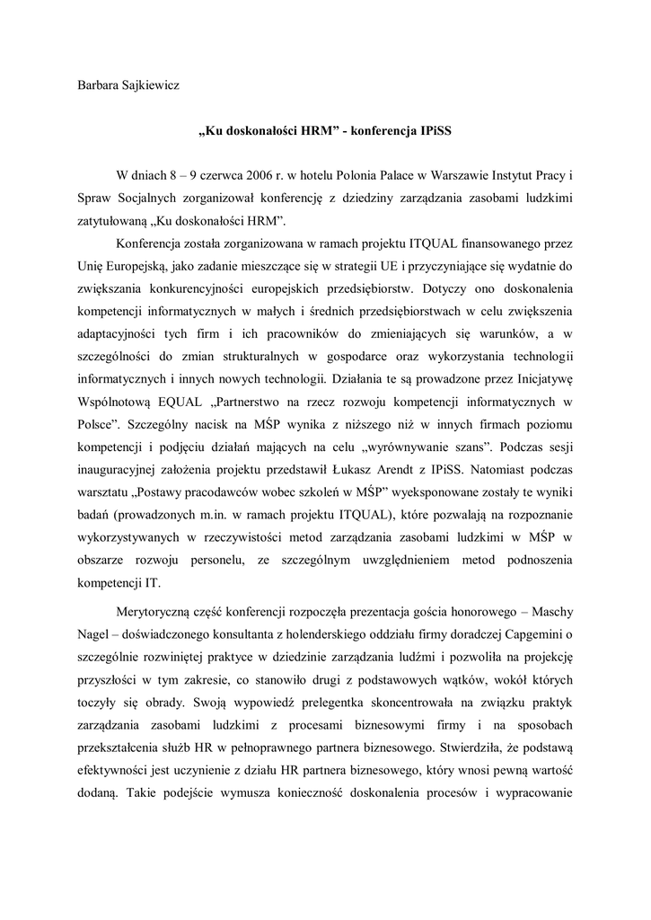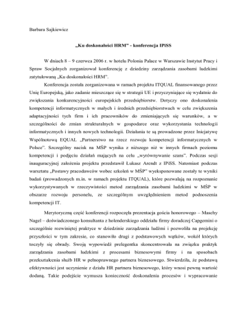Barbara Sajkiewicz „Ku doskonałości HRM” - konferencja IPiSS W dniach 8 – 9 czerwca 2006 r. w hotelu Polonia Palace w Warszawie Instytut Pracy i Spraw Socjalnych zorganizował konferencję z dziedziny zarządzania zasobami ludzkimi zatytułowaną „Ku doskonałości HRM”. Konferencja została zorganizowana w ramach projektu ITQUAL finansowanego przez Unię Europejską, jako zadanie mieszczące się w strategii UE i przyczyniające się wydatnie do zwiększania konkurencyjności europejskich przedsiębiorstw. Dotyczy ono doskonalenia kompetencji informatycznych w małych i średnich przedsiębiorstwach w celu zwiększenia adaptacyjności tych firm i ich pracowników do zmieniających się warunków, a w szczególności do zmian strukturalnych w gospodarce oraz wykorzystania technologii informatycznych i innych nowych technologii. Działania te są prowadzone przez Inicjatywę Wspólnotową EQUAL „Partnerstwo na rzecz rozwoju kompetencji informatycznych w Polsce”. Szczególny nacisk na MŚP wynika z niższego niż w innych firmach poziomu kompetencji i podjęciu działań mających na celu „wyrównywanie szans”. Podczas sesji inauguracyjnej założenia projektu przedstawił Łukasz Arendt z IPiSS. Natomiast podczas warsztatu „Postawy pracodawców wobec szkoleń w MŚP” wyeksponowane zostały te wyniki badań (prowadzonych m.in. w ramach projektu ITQUAL), które pozwalają na rozpoznanie wykorzystywanych w rzeczywistości metod zarządzania zasobami ludzkimi w MŚP w obszarze rozwoju personelu, ze szczególnym uwzględnieniem metod podnoszenia kompetencji IT. Merytoryczną część konferencji rozpoczęła prezentacja gościa honorowego – Maschy Nagel – doświadczonego konsultanta z holenderskiego oddziału firmy doradczej Capgemini o szczególnie rozwiniętej praktyce w dziedzinie zarządzania ludźmi i pozwoliła na projekcję przyszłości w tym zakresie, co stanowiło drugi z podstawowych wątków, wokół których toczyły się obrady. Swoją wypowiedź prelegentka skoncentrowała na związku praktyk zarządzania zasobami ludzkimi z procesami biznesowymi firmy i na sposobach przekształcenia służb HR w pełnoprawnego partnera biznesowego. Stwierdziła, że podstawą efektywności jest uczynienie z działu HR partnera biznesowego, który wnosi pewną wartość dodaną. Takie podejście wymusza konieczność doskonalenia procesów i wypracowanie metod oceny ich dojrzałości. Referentka zwróciła uwagę na to, iż istnieją metody oceny i pomiaru dojrzałości procesów, które można przenieść na grunt zzl. Trzecie wystąpienie w sesji inauguracyjnej (prof. dr hab. Bogusławy Urbaniak) pokazywało doświadczenia z sześciu edycji Konkursu Lider Zarządzania Zasobami Ludzkimi, pozwalające na wnioskowanie o problemach współczesnego zzl w Polsce (w szczególności dotyczących firm dążących do wysokich standardów pracowniczych), sposobach i możliwościach ich rozwiązania, ale także na identyfikację problemów najtrudniejszych, z którymi firmy na ogół gorzej sobie radzą. Szeroka dyskusja w gronie doświadczonych specjalistów niewątpliwie jest bardzo korzystna dla znalezienia najlepszych rozwiązań, a także wpływa na doskonalenie w dziedzinie HR. Powyższe problemy stanowiły one punkt wyjścia dla 8 (łączących głosy pracowników nauki i praktyków) paneli dyskusyjnych. Panel „Powiązanie strategii firmy ze strategią HR” prowadziła Anna Kozińska z BRE Banku – Prezes Klubu Lidera Zarządzania Zasobami Ludzkimi. Stwierdzono brak jednoznaczności pojęć i zauważono, że istnieje kilka różnych teorii i podejść do zagadnienia. Podczas panelu dokonywano oceny stosowanych podejść w świetle zmian zachodzących w pojmowaniu istoty zarządzania strategicznego oraz zarządzania zasobami ludzkimi. Najczęściej za cel strategiczny dla zzl przyjmuje się takie ukształtowanie wymiarów kapitału ludzkiego, aby zapewniał on efektywną realizację bieżących celów firmy oraz był źródłem przyszłej konkurencyjności. Niezmiernie istotne i również dyskusyjne jest właściwe określenie relacji strategii zzl ze strategią firmy. Zależy ono przede wszystkim od pojmowania strategii firmy, a z drugiej strony od rozumienia istoty, miejsca i roli zzl. Jako najkorzystniejsze sugerowano podejście interaktywne, gdzie strategia firmy stanowi podstawę wyznaczania celów w sferze zasobów ludzkich, równocześnie jednak uwzględnia przy formułowaniu strategicznych kierunków działania firmy mocne i słabe strony kapitału ludzkiego. Stwierdzono, że coraz istotniejsze staje się tworzenie i dostarczanie wartości dla interesariuszy, co staje się powoli kluczowym kryterium oceny HRM. W omawianym związku dotyczącym korporacji międzynarodowych zauważalna jest konieczność uwzględniania lokalnych elementów kulturowych w strategii zzl budowanej dla firmy działającej w systemie korporacyjnym. Panelowi poświęconemu efektywnemu wynagradzaniu przewodniczyła prof. dr hab. Stanisława Borkowska. Dyskusja w dużej części poświęcona była ustaleniu możliwie najpełniejszej definicji tego zagadnienia. Przedstawiono argumenty za utożsamianiem pojęcia efektywnego i skutecznego wynagradzania. Wiele możliwości w kwestii określenia istoty zagadnienia powoduje wielość możliwych kryteriów oceny. Typowe podejście do zagadnienia efektywności sugeruje postrzeganie wynagrodzenia jako kosztu i pomiar ekonomicznej efektywności, co jest w rzeczywistości niezwykle trudne. Ustalono, że efektywność wynagrodzeń można określać lub mierzyć na wiele sposobów i konieczne jest uwzględnianie wymiaru pozafinansowego. Za dobry miernik efektywności należy m. in. uznać stopień realizacji celów firmy i pracowników. Paneliści rozważali jak można zwiększać efektywność wynagrodzeń, choć ostatecznie stwierdzono, że prawdziwie efektywne wynagradzanie jest raczej mitem. Rozważano zagadnienie wartościowania pracy w świetle 