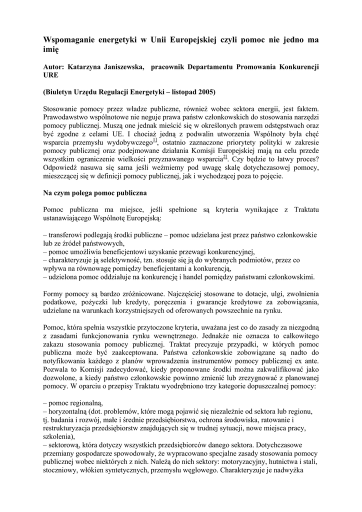 Wspomaganie energetyki w Unii Europejskiej czyli pomoc nie jedno ma imię Autor: Katarzyna Janiszewska, pracownik Departamentu Promowania Konkurencji URE (Biuletyn Urzędu Regulacji Energetyki – listopad 2005) Stosowanie pomocy przez władze publiczne, również wobec sektora energii, jest faktem. Prawodawstwo wspólnotowe nie neguje prawa państw członkowskich do stosowania narzędzi pomocy publicznej. Muszą one jednak mieścić się w określonych prawem odstępstwach oraz być zgodne z celami UE. I chociaż jedną z podwalin utworzenia Wspólnoty była chęć wsparcia przemysłu wydobywczego1], ostatnio zaznaczone priorytety polityki w zakresie pomocy publicznej oraz podejmowane działania Komisji Europejskiej mają na celu przede wszystkim ograniczenie wielkości przyznawanego wsparcia2]. Czy będzie to łatwy proces? Odpowiedź nasuwa się sama jeśli weźmiemy pod uwagę skalę dotychczasowej pomocy, mieszczącej się w definicji pomocy publicznej, jak i wychodzącej poza to pojęcie. Na czym polega pomoc publiczna Pomoc publiczna ma miejsce, jeśli spełnione są kryteria wynikające z Traktatu ustanawiającego Wspólnotę Europejską: – transferowi podlegają środki publiczne – pomoc udzielana jest przez państwo członkowskie lub ze źródeł państwowych, – pomoc umożliwia beneficjentowi uzyskanie przewagi konkurencyjnej, – charakteryzuje ją selektywność, tzn. stosuje się ją do wybranych podmiotów, przez co wpływa na równowagę pomiędzy beneficjentami a konkurencją, – udzielona pomoc oddziałuje na konkurencję i handel pomiędzy państwami członkowskimi. Formy pomocy są bardzo zróżnicowane. Najczęściej stosowane to dotacje, ulgi, zwolnienia podatkowe, pożyczki lub kredyty, poręczenia i gwarancje kredytowe za zobowiązania, udzielane na warunkach korzystniejszych od oferowanych powszechnie na rynku. Pomoc, która spełnia wszystkie przytoczone kryteria, uważana jest co do zasady za niezgodną z zasadami funkcjonowania rynku wewnętrznego. Jednakże nie oznacza to całkowitego zakazu stosowania pomocy publicznej. Traktat precyzuje przypadki, w których pomoc publiczna może być zaakceptowana. Państwa członkowskie zobowiązane są nadto do notyfikowania każdego z planów wprowadzenia instrumentów pomocy publicznej ex ante. Pozwala to Komisji zadecydować, kiedy proponowane środki można zakwalifikować jako dozwolone, a kiedy państwo członkowskie powinno zmienić lub zrezygnować z planowanej pomocy. W oparciu o przepisy Traktatu wyodrębniono trzy kategorie dopuszczalnej pomocy: – pomoc regionalną, – horyzontalną (dot. problemów, które mogą pojawić się niezależnie od sektora lub regionu, tj. badania i rozwój, małe i średnie przedsiębiorstwa, ochrona środowiska, ratowanie i restrukturyzacja przedsiębiorstw znajdujących się w trudnej sytuacji, nowe miejsca pracy, szkolenia), – sektorową, która dotyczy wszystkich przedsiębiorców danego sektora. Dotychczasowe przemiany gospodarcze spowodowały, że wypracowano specjalne zasady stosowania pomocy publicznej wobec niektórych z nich. Należą do nich sektory: motoryzacyjny, hutnictwa i stali, stoczniowy, włókien syntetycznych, przemysłu węglowego. Charakteryzuje je nadwyżka mocy produkcyjnych oraz kapitałochłonność inwestycji. Przy udzielaniu pomocy zwraca się szczególną uwagę, aby nie nadać przedsiębiorcom tych sektorów uprzywilejowanej pozycji na rynku. Z tego względu zasady stosowane wobec sektorów tzw. wrażliwych są znacznie bardziej restrykcyjne niż stosowane wobec innych, a każdy przypadek jest indywidualnie notyfikowany do KE. Istotne jest, że katalog dopuszczalnej pomocy, decyzją Rady, może zostać rozszerzony o dodatkowe pozycje, pod warunkiem, że zaistnieją usprawiedliwiające ten krok okoliczności społeczne lub gospodarcze. W jaki sposób państwa członkowskie wspierają sektor energetyczny? Zakres narzędzi, które mogą by wykorzystane przez państwa członkowskie w ramach pomocy publicznej, i poza nią, jest ogromny. Dobór środków oraz cele zależą od woli wsparcia rodzimych rynków oraz od priorytetów polityki każdego z rządów. Poniżej przedstawiono najważniejsze schematy oraz przykłady wsparcia udzielanego przez państwa członkowskie, wykraczającego czasami poza formułę pomocy publicznej i mającego różne podstawy prawne. Pomoc sektorowa Wydobycie węgla kamiennego Węgiel kamienny był przez lata, obok energetyki jądrowej, jednym z ważniejszych beneficjantów pomocy w Unii Europejskiej3]. Ze względu na wysokie koszty wydobycia i niską w związku z tym konkurencyjność wobec krajów trzecich, wydobycie węgla jest stopniowo ograniczane. Jednakże kwoty wsparcia pozostają wciąż bardzo wysokie (ok. 6 300 mln € w 2001 r.4]). Pomoc dla górnictwa w Unii Europejskiej zawsze była znaczna, choć liczba państw, które z niej korzystały jest niewielka. Są to Niemcy, Hiszpania, Francja i Wielka Brytania. Tabela 1. Pomoc dla górnictwa węglowego w państwach UE w latach 2001-20035] Przeciętnie Niemcy w UE Hiszpania Francja Wielka Brytania Średnia roczna kwota pomocy nie dotycząca 2673 bieżącej produkcji w latach 2001-2003 [mln Euro] 1125 836 705 8 Średnia roczna kwota pomocy na bieżącą 3463 produkcję w latach 2001-2003 [mln Euro] 2610 614 280 46 Udział pomocy dla górnictwa węglowego w pomocy ogółem 30 28 16 1 (z wyłączeniem rolnictwa, 16 rybołówstwa i transportu) w 2002 r. [%] Źródło: State Aid Scoreboard, spring 2004 update, Brussels, 20.4.2004, COM (2004) 256 final. Sate Aid Scoreboard, Statistical tables – Coal Mining, strony DG Competition. Po wygaśnięciu Traktatu EWWiS w 2002 r., przyjęto nowe zasady udzielania pomocy w tym sektorze[6]. Celem ich jest znaczne zmniejszenie pomocy dla sektora ogółem i ukierunkowanie jej na ograniczenie działalności przez jednostki nieefektywne ekonomicznie oraz zapewnienie dostępu do zasobów węgla w kontekście bezpieczeństwa dosta