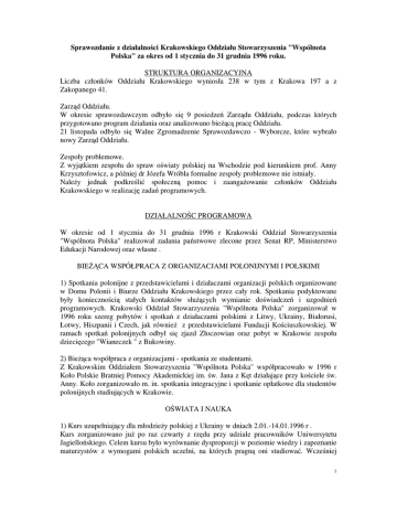 Sprawozdanie z działalności Krakowskiego Oddziału Stowarzyszenia "Wspólnota Polska" za okres od 1 stycznia do 31 grudnia 1996 roku. STRUKTURA ORGANIZACYJNA Liczba członków Oddziału Krakowskiego wyniosła 238 w tym z Krakowa 197 a z Zakopanego 41. Zarząd Oddziału. W okresie sprawozdawczym odbyło się 9 posiedzeń Zarządu Oddziału, podczas których przygotowano program działania oraz analizowano bieżącą pracę Oddziału. 21 listopada odbyło się Walne Zgromadzenie Sprawozdawczo - Wyborcze, które wybrało nowy Zarząd Oddziału. Zespoły problemowe. Z wyjątkiem zespołu do spraw oświaty polskiej na Wschodzie pod kierunkiem prof. Anny Krzysztofowicz, a później dr Józefa Wróbla formalne zespoły problemowe nie istniały. Należy jednak podkreślić społeczną pomoc i zaangażowanie członków Oddziału Krakowskiego w realizację zadań programowych. DZIAŁALNOŚC PROGRAMOWA W okresie od 1 stycznia do 31 grudnia 1996 r Krakowski Oddział Stowarzyszenia "Wspólnota Polska" realizował zadania państwowe zlecone przez Senat RP, Ministerstwo Edukacji Narodowej oraz własne . BIEŻĄCA WSPÓŁPRACA Z ORGANIZACJAMI POLONIJNYMI I POLSKIMI 1) Spotkania polonijne z przedstawicielami i działaczami organizacji polskich organizowane w Domu Polonii i Biurze Oddziału Krakowskiego przez cały rok. Spotkania podyktowane były koniecznością stałych kontaktów służących wymianie doświadczeń i uzgodnień programowych. Krakowski Oddział Stowarzyszenia "Wspólnota Polska" zorganizował w 1996 roku szereg pobytów i spotkań z działaczami polskimi z Litwy, Ukrainy, Białorusi, Łotwy, Hiszpanii i Czech, jak również z przedstawicielami Fundacji Kościuszkowskiej. W ramach spotkań polonijnych odbył się zjazd Złoczowian oraz pobyt w Krakowie zespołu dziecięcego "Wianeczek " z Bukowiny. 2) Bieżąca współpraca z organizacjami - spotkania ze studentami. Z Krakowskim Oddziałem Stowarzyszenia "Wspólnota Polska" współpracowało w 1996 r Koło Polskie Bratniej Pomocy Akademickiej im. św. Jana z Kęt działające przy kościele św. Anny. Koło zorganizowało m. in. spotkania integracyjne i spotkanie opłatkowe dla studentów polonijnych studiujących w Krakowie. OŚWIATA I NAUKA 1) Kurs uzupełniający dla młodzieży polskiej z Ukrainy w dniach 2.01.-14.01.1996 r . Kurs zorganizowano już po raz czwarty z rzędu przy udziale pracowników Uniwersytetu Jagiellońskiego. Celem kursu było wyrównanie dysproporcji w poziomie wiedzy i zapoznanie maturzystów z wymogami polskich uczelni, na których pragną oni studiować. Wcześniej 1 odbył się w listopadzie we Lwowie test kwalifikacyjny dla osób pragnących wziąć udział w kursie wyrównawczym w Krakowie. Ogółem w kursie wzięło udział 33 uczestników z Kijowa, Lwowa, Czortkowa, Dobromila, Stanisławowa, Żytomierza, Mościsk, Gródka Podolskiego, Chmielnickiego i Nowogrodu Wołyńskiego. Młodzież odbywała zajęcia w dwóch grupach: biologiczno-chemicznej (5 osób) i humanistycznej (28 osób). Ogółem przeprowadzono 161 godzin zajęć lekcyjnych. Zajęcia grupy humanistycznej odbywały się w salach recepcyjnych Domu Polonii, natomiast grupy biologiczno-chemicznej w pracowniach UJ. 2) I Forum środowiskowe historyków i nauczycieli historii ze Wschodu w dniach 17-21. 04. 1996 r. W forum uczestniczyło 49 historyków z Litwy, Łotwy, Białorusi, Rosji i Ukrainy. Celem I Forum były warsztaty historyczne na temat "Historia Polski po upadku komunizmu", oraz spotkania z historykami krakowskimi. Uczestnicy forum wysłuchali kilku wykładów na temat przemian w powojennej historiografii Polski, oraz stanu polskiego dziedzictwa kulturowego na Kresach. Oprócz prelekcji Krakowski Oddział Stowarzyszenia zorganizował spotkania historyków ze Wschodu z Sekretarzem generalnym PAU prof. J. Wyrozumskim, redakcją Polskiego Słownika Biograficznego oraz z dyrektorem Biblioteki Jagiellońskiej - dr K. Zamorskim. 3) Śródroczne pobyty dzieci polskich ze Wschodu w szkołach w Krakowie i na Podhalu. W ramach realizacji tego zadania przez cały rok przyjęto 59 dzieci w tym: 15 uczniów klas polskich ze Szkoły nr 37 w Kiszyniowie , 17 uczniów Szkoły Polskiej z Dyneburga, 18 dzieci z Polskiej Szkoły w Rezekne oraz grupę 9 dzieci ze szkółki polskiej w Stanisławowie. Uczniowie szkół polskich ze Wschodu mieszkali u rodzin w Krakowie i na Podhalu (za wyjątkiem grupy z Mołdawii) oraz uczęszczali ze swymi rówieśnikami na zajęcia szkolne. W czasie wolnym od zajęć dzieci zwiedziły Kraków, Zakopane i Wieliczkę. 4) Warsztaty jęz. polskiego i metodyki nauczania jęz. polskiego dla studentów filologii polskiej z Drohobycza i Tarnopola od 7.07 do 21.07. 1996 r W trzecich z kolei warsztatach wzięło udział 29 studentów, dla których przewidziano 6 godzin zajęć dziennie w dwóch grupach. Zajęcia prowadzone przez pracowników Instytutu Polonijnego UJ obejmowały zagadnienia słownictwa, konwersacji oraz zrozumienia tekstów. Kurs został zakończony egzaminem pisemnym i ustnym. W czasie wolnym uczestnicy warsztatów skorzystali z bogatej oferty kulturalnej przygotowanej przez Kraków na sezon letni. Był to Międzynarodowy Festiwal Teatrów Ulicznych oraz festyn z okazji Święta Narodowego Francji. 5) Kurs jęz. polskiego dla początkujących i średniozaawansowanych w terminie 15.07- 4. 08 1996 r. Kurs adresowany był dla młodzieży polskiej zza Zbrucza na Ukrainie. Udział wzięło 30 młodzieży w wieku 16-20 lat. Zajęcia językowe w trzech grupach prowadzili pracownicy naukowi Instytutu Polonijnego UJ oraz Instytutu Języka Polskiego PAU. Oprócz nauki jęz. polskiego dla uczestników kursu przewidziano bogaty program turystyczno - kulturalny: wycieczki do Zakopanego, Wieliczki, Ojcowa oraz zwiedzanie Krakowa. W celu pogłębienia znajomości jęz. polskiego odbywały się projekcje polskich filmów i nauka piosenek młodzieżowych. 6) Obóz językowy dla 30 osobowej grupy młodzieży polonijnej z Rosji, Łotw