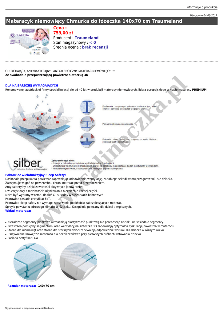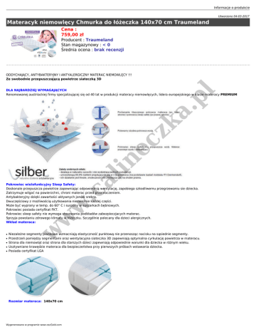 Informacje o produkcie Utworzono 04-03-2017 Materacyk niemowlęcy Chmurka do łóżeczka 140x70 cm Traumeland Cena : 759,00 zł Producent : Traumeland Stan magazynowy : < 0 Średnia ocena : brak recenzji ODDYCHAJĄCY, ANTYBAKTERYJNY I ANTYALERGICZNY MATERAC NIEMOWLĘCY !!! Ze swobodnie przepuszczającą powietrze siateczką 3D .c al in ec zk a. pl DLA NAJBARDZIEJ WYMAGAJĄCYCH Renomowanej austriackiej firmy specjalizującej się od 40 lat w produkcji materacy niemowlęcych, lidera europejskiego w klasie materacy PREMIUM ● ● ● ● ● w w w Pokrowiec wielofunkcyjny Sleep Safety: Doskonale przepuszcza powietrze zapewniając odpowiednią wentylację, zapobiega szkodliwemu przegrzewaniu sie dziecka. Zatrzymuje wilgoć na powierzchni, chroni materac przed przemoczeniem. Antybakteryjny dzięki zawartości aktywnych jonów srebra. Dwuczęściowy z możliwością użytkowania niezależnie każdej części. Może być wyprany w temp. do 60° C i suszony w suszarkach bębnowych. Pokrowiec posiada certyfikat FKT. Pokrowiec sleep safety nie wymaga stosowania podkładów zabezpieczjacych materac. Sprzyja powstaniu zdrowego klimatu w łóżeczku. Szczgólnie polecany dla dzieci alergicznych. Wkład materaca: Niezależne segmenty piankowe wzmacniają elastyczność punktową nie przenosząc nacisku na sąsiednie segmenty. Przestrzeń pomiędzy segmentami oraz wentylacyjna siateczka 3D zapewniają optymalna cyrkulację powietrza w materacu. Strona dla niemowląt oraz strona dla starszych dzieci zapewniają odpowiednie warunki dla dziecka w różnym wieku. Usztywniane krawędzie materaca dla bezpieczeństwa przy pierwszych próbach wstawania dziecka. Posiada certyfikat LGA Rozmiar materaca: 140x70 cm Wygenerowano w programie www.oscGold.com pl zk a. Szczegółowa informacja o produkcie: W materacu "Chmurka" uzyskano bardzo wysoki poziom wentylacji powierzchniowej dzięki umieszczeniu pod pokrowcem warstwy z włókien 3D o strukturze plastra miodu. Wentylacja pionowa, która zapewnia od została oraz pionowej zimnej pianki o strukturze segmentowej. Wolne przestrzenie pomiędzy segmentami oraz pionowe kanaliki wspomagają wentylację w materacu. Wykorzystana w materacu wysokiej jakości zimna pianka o strukturze segmentowej charakteryzuje się bardzo wysoką elastycznością punktową. Dzięki niej materac idealnie dopasowuje się dziecka i równomiernie rozkłada nacisk na poszczególne części jego ciała, zapewniając tym samym prawidłowy rozwój kręgosłupa i komfort dziecku. ec Materac może być wykorzystany obustronnie. Strona z poduszką powietrzną jest przeznaczona dla najmłodszych dzieci. We wczesnym okresie życia, w którym dziecko większość czasu przesypia w bezruchu odpowiednia wentylacja ma szczególnie duże znaczenie. Zalecamy przełożenie materaca na stronę dla starszego dziecka od 18. miesiąca życia dziecka. in Usztywniane dłuższe boki materaca zabezpieczają przez poślizgnięciem się nóżki dziecka podczas prób podnoszenia się w łóżeczku. W materacach nie posiadających odpowiednich usztywnień po bokach występuje ryzyko powstania różnego typu urazów wynikających z poślizgu dziecka na krańcach materaca przy próbie wstawania. .c al Pokrowiec sleep safety stymuluje wentylację materaca, zabezpieczając go przed przemoknięciem. Wilgoć jest rozprowadzana po powierzchni, dzięki czemu może szybciej odparować. Nie jest ona jednak przepuszczana w głąb materaca. Nie jest zatem konieczne stosowanie osobnych podkładów zabezpieczających. Nie należy stosować podkładów nieprzepuszczających powietrza, które tworzą bardzo niezdrowy klimat w łóżeczku. Pokrowiec w materacu jest zdejmowany i składa się z dwóch niezależnych części. W razie zabrudzenia lub zamoczenia można odłączyć górną część pokrowca i ja wyprać. Dolną część pokrowca można w tym czasie przełożyć na górę, dzięki czemu dziecko nie odczuje zmiany. w Zastosowanie w pokrowcu aktywnych jonów srebra zapewnia skuteczną ochronę antybakteryjną. W ciągu godziny unicestwianych jest 99,9% bakterii znajdujących się na materacu. Naturalne antybakteryjne działanie pokrowca materaca jest długotrwałe i nie zmniejsza się nawet po wielokrotnym wypraniu pokrowca. ● ● Öko-Tex Standard 100, Klasa 1 dla niemowląt - potwierdza, że wszystkie wykorzystane materiały mogą być przeznaczone dla niemowląt LGA - potwierdzający użycie pianki niezawierającej szkodliwych substancji. FKT - potwierdzający bezpieczeństwo pokrowca materaca w ● w Materac może być wykorzystywany przez dzieci alergiczne. Nie zawiera on żadnych substancji mogących wywoływać lub stymulować alergie. Materac posiada następujące certyfikaty: POSIADA NIEPRZEMAKALNY ODDYCHAJĄCY POKROWIEC ZABIJAJĄCY BAKTERIE ZA POMOCĄ AKTYWNYCH JONÓW SREBRA