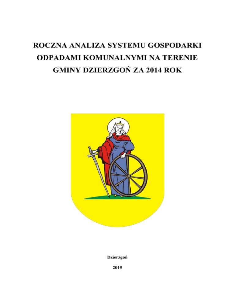 ROCZNA ANALIZA SYSTEMU GOSPODARKI ODPADAMI KOMUNALNYMI NA TERENIE GMINY DZIERZGOŃ ZA 2014 ROK Dzierzgoń 2015 Spis treści I. Wprowadzenie 3 1. Cel przygotowania analizy 3 2. Podstawa prawna sporządzenia analizy 3 Analiza systemu gospodarki odpadami komunalnymi na terenie gminy Dzierzgoń 5 1. Charakterystyka gminy 5 2. Gospodarka odpadami komunalnymi na terenie gminy Dzierzgoń 6 II. 3. Założenia Wojewódzkiego Planu Gospodarki Odpadami dla Województwa Pomorskiego 2018 III. Ocena możliwości technicznych i organizacyjnych gminy Dzierzgoń w zakresie gospodarowania odpadami komunalnymi 1. 8 13 Możliwości przetwarzania zmieszanych odpadów komunalnych, odpadów zielonych oraz pozostałości z sortowania odpadów komunalnych przeznaczonych do składowania 13 2. Potrzeby inwestycyjne związane z gospodarowaniem odpadów komunalnych 13 3. Liczba ludności 14 4. Ilość niezłożonych deklaracji przez mieszkańców gminy Dzierzgoń na dzień 31.12.2014 r. 14 5. Ilość odpadów komunalnych wytworzonych na terenie gminy Dzierzgoń w 2014 roku 15 6. Ilość odebranych odpadów komunalnych z posesji zamieszkałych na terenie gminy Dzierzgoń 7. IV. w 2014 r. 15 Opłaty z tytułu gospodarowania odpadami komunalnymi 16 Podsumowanie 17 2 I. Wprowadzenie 1. Cel przygotowania analizy Analiza została przygotowana w celu weryfikacji możliwości technicznych i organizacyjnych gminy Dzierzgoń w zakresie gospodarowania odpadami komunalnymi. Przedstawia informację o liczbie osób objętych systemem gospodarowania odpadami komunalnymi, ilości odpadów komunalnych wytworzonych na terenie gminy jak również pozostałości z sortowania odpadów przeznaczonych do składowania odbieranych z terenu gminy Dzierzgoń. Głównym celem analizy jest dostarczenie niezbędnych informacji dla stworzenia efektywnego systemu gospodarki odpadami komunalnymi. Poniższa analiza obejmuje okres funkcjonowania systemu gospodarowania odpadami komunalnymi na terenie gminy Dzierzgoń od 1 stycznia 2014 r. do 31 grudnia 2014 r. 2. Podstawa prawna sporządzenia analizy Analiza została przygotowana w oparciu o art. 3 ust. 2 pkt 10 ustawy z dnia 13 września 1996 r. o utrzymaniu czystości i porządku w gminach (t. jedn. Dz. U. z 2013 r. poz. 1399) powoływanej dalej jako u.c.g.p., gdzie określony został zakres analizy. Zakres przedmiotowej analizy częściowo przedstawia informację, które zawarte są w rocznym sprawozdaniu z realizacji zadań z zakresu gospodarowania odpadami komunalnymi, sporządzonym przez gminę na podstawie art. 9g ust. 1i 3 ustawy o utrzymaniu czystości i porządku w gminach celem przedłożenia Marszałkowi Województwa Pomorskiego oraz Wojewódzkiemu Inspektorowi Ochrony Środowiska w Gdańsku w terminie do 31 marca roku następującego po roku, którego dotyczy. System gospodarowania odpadami komunalnymi na terenie gminy Dzierzgoń funkcjonuje w oparciu o następujące akty prawne: 3 Ustawa z dnia 13 września 1996 r. o utrzymaniu czystości i porządku w gminach (Dz. U. z 2013 r. poz. 1399) Ustawa z dnia 14 grudnia 2012 r. o odpadach (Dz. U. z 2013 r. poz. 951 ze zm.) Ustawa z dnia 13 czerwca 2013 r. o gospodarce opakowaniami i odpadami opakowaniowymi (Dz. U. z 2013 r. poz. 888 ze zm.) Rozporządzenie Ministra Środowiska z dnia 27 września 2001 r. w sprawie katalogu odpadów (Dz. U. z 2001 r., Nr 112, poz. 1206) Uchwała NR XIX/194/2012 r. Rady Miejskiej w Dzierzgoniu z dnia 16 października 2012 r. w sprawie określenia metody ustalenia opłaty za gospodarowanie odpadami komunalnymi oraz ustalenia stawki opłaty Uchwała NR XIX/195/2012 r. Rady Miejskiej w Dzierzgoniu z dnia 16 października 2012 r. w sprawie regulaminu utrzymania czystości i porządku na terenie gminy Dzierzgoń Uchwała NR XIX/196/2012 r. Rady Miejskiej w Dzierzgoniu z dnia 16 października 2012 r. w sprawie szczegółowego sposobu i zakresu świadczenia usług w zakresie odbierania odpadów komunalnych od właścicieli nieruchomości i zagospodarowania tych odpadów na terenie gminy Dzierzgoń Uchwała NR XXVII/268/2013 r. Rady Miejskiej w Dzierzgoniu z dnia 29 sierpnia 2013 r. zmieniająca uchwałę w sprawie terminu, częstotliwości i trybu uiszczania opłaty za gospodarowanie odpadami komunalnymi Uchwała NR XXVII/269/2013 r. Rady Miejskiej w Dzierzgoniu z dnia 29 sierpnia 2013 r. zmieniająca uchwałę w sprawie wzoru deklaracji o wysokości opłaty za gospodarowanie odpadami komunalnymi składanej przez właścicieli nieruchomości 4 II. Analiza systemu gospodarki odpadami komunalnymi na terenie gminy Dzierzgoń 1. Charakterystyka gminy Gmina Dzierzgoń położona jest we wschodniej części województwa pomorskiego w powiecie sztumskim. Powierzchnia gminy wynosi 131,5 km 2 . Zamieszkuje ją 9562 mieszkańców, z których 5.483 w mieście Dzierzgoń. Gmina od południa graniczy z gminą Mikołajki Pomorskie, od zachodu z gminą Stary Targ, od północy z gminami Stare Pole i Markusy, od wschodu z gminami Rychliki i Stary Dzierzgoń. Granica z gminami Markusy i Rychliki stanowi jednocześnie granicę pomiędzy województwem pomorskim i województwem warmińsko- mazurskim. Siedzibą władz gminy i ośrodkiem administracyjno- usługowym jest miasto Dzierzgoń położone nad rzeką o tej samej nazwie, u stóp Wzgórza Zamkowego. Cała gmina podzielona jest na 12 sołectw: Ankamaty, Bągart, Bruk, Budzisz, Jasna, Minięta, Morany, Nowiec, Poliksy, Prakwice, Tywęzy, Żuławka Sztumska. Dzierzgoń zlokalizowany jest blisko innych większych miast: Malbork znajduje się w odległości- 28 km, Pasłęk- 29 km, Elbląg- 49 km, Gdańsk- 75 km, Olsztyn- 120 km, Toruń- 140 km. 5 Plan gminy Dzierzgoń 2. Gospodarka odpadami komunalnymi na terenie gminy Dzierzgoń Zgodnie z ustawą z dnia 13 września 1996 r. o utrzymaniu czystości i porządku w gminach (Dz. U. z 2012 r. poz. 391) nowym systemem gospodarowania odpadami komunalnymi na terenie gminy Dzierzgoń od 1 lipca 2013 roku zostały objęte nieruchomości zamieszkał