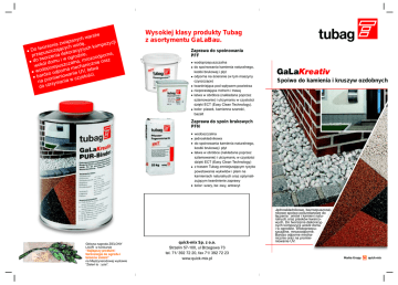 w warst h c y n iąza cji nia zw ch wodę, kompozy e z r o Do tw szczający oracyjnych u a, przep rzenia dek grodzie, dporn o o o o z w t o w r m az do ui alna, nie or ł dom wokó rzepuszcz echanicz a m p wodo odporna ie UV, łatw o z a d r w ści. o n ba mieni ia w czysto o r p n na rzyma do ut Wysokiej klasy produkty Tubag z asortymentu GaLaBau. Zaprawa do spoinowania PFF wodoprzepuszczalna do spoinowania kamienia naturalnego, kostki brukowej i płyt odporna na ścieranie (w tym maszyny czyszczące) twardniejąca pod wpływem powietrza nieporastająca mchem i trawą łatwa w obróbce (nakładana poprzez szlamowanie) i utrzymaniu w czystości dzięki ECT (Easy Clean Technology). kolor: piasek, kamienna szarość, bazalt Spoiwo do kamienia i kruszyw ozdobnych Zaprawa do spoin brukowych PFN wodoszczelna jednoskładnikowa do spoinowania kamienia naturalnego, kostki brukowej i płyt łatwa w obróbce (nakładana poprzez szlamowanie) i utrzymaniu w czystości dzięki ECT (Easy Clean Technology) z trasem Tubag zmniejszającym ryzyko powstawania wykwitów i plam na kamieniach naturalnych oraz optymalizującym twardnienie zaprawy kolor: szary, beżowy, antracyt Główna nagroda ZIELONY LAUR w konkursie "Najlepszy produkt i technologie do ogrodu i terenów zieleni" na Międzynarodowej wystawie "Zieleń to Życie". quick-mix Sp. z o.o. Strzelin 57-100, ul Brzegowa 73 tel. 71/ 392 72 20, fax 71/ 392 72 23 www.quick-mix.pl Jednoskładnikowe, bezrozpuszczalnikowe spoiwo poliuretanowe do łączenia żwirów i kamieni naturalnych oraz piasków kwarcowych. Do tworzenia dekoracyjnych kompozycji wokół domu i w ogrodzie. Wodoprzepuszczalne, mrozoodporne. Bardzo odporne mechanicznie oraz na promieniowanie UV. Marka Grupy quick-mix Spoiwo do kamienia i kruszyw ozdobnych Jednokomponentowa żywica poliuretanowa do łączenia (klejenia) drobnych kamieni sztucznych i naturalnych oraz piasku kwarcowego. Możliwość spajania kruszywa-/kamienia o frakcji od 0,1mm do 40 mm. Do tworzenia ozdobnych elementów architektury ogrodowej oraz związanych ze sobą warstw przepuszczalnych z grysu lub kamienia (np. opaska wokół domu, obrzeża drzew). Wodoprzepuszczalna, mrozoodporna. Bardzo odporna mechanicznie oraz na promieniowanie UV. Dane techniczne temperatura stosowania: +8°C do +30°C czas stosowania: ok. 75 min. możliwość chodzenia: po ok. 8 godz. możliwość obciążania: po ok. 2 dobach wytrzymałość na ściskanie: w zależności od uziarnienia i ilości zastosowanego spoiwa poliuretanowego zużycie: do 5 % objętości wagowej magazynowanie: w chłodnym suchym i przeznaczonym do tego miejscu opakowanie: puszka 1 kg, kubełek 5 kg odcień barwy: przeźroczysta Właściwości: produkt jedno-komponentowy nie zawiera rozpuszczalników bezwonny przepuszczalny dla wody odporny na czynniki atmosferyczne odporny na ścieranie mała podatność na zabrudzenie przeźroczysty odporny na promieniowanie UV Zastosowanie: żywica poliuretanowa do łączenia kruszyw sztucznych i mineralnych do wykonywania spoistych i przepuszczalnych dla wody warstw ozdobnych i użytkowych do wykonywania podłoży dekoracyjnych i zapraw wyrównawczych nie zawierających cementu i wody do dekoracyjnego kształtowania elementów małej architektury, ogrodów i krajobrazów do wykonywania opasek wokół domu, ścieżek ogrodowych do stosowania wewnątrz i na zewnątrz budynku Podłoże: Podłoże musi być przepuszczalne dla wody, suche, o odpowiedniej nośności i wolne od zanieczyszczeń i innych substancji pogarszających przyczepność. Tarasy i balkony na zewnątrz budynku muszą wykazywać spadek 1,5-3,0 %. Przy wykonywaniu prac na podłożach uszczelnianych zaprawami hydroizolacyjnymi należy zapewnić odprowadzanie wsiąkającej wody np. przez maty drenażowe, krawędzie okapowe, rynny itp. Unikać stojącej wody na podłożu nieprzepuszczalnym przez odpowiedni spadek. Stosowanie: 1. Oczyścić/umyć kamienie lub piasek z pyłu, brudu i substancji pogarszających przyczepność. 2. Osuszone kamienie naturalne lub piaski kwarcowe wymieszać z dodatkiem ok. 1-5 % wag. spoiwa poliuretanowego GaLaKreativ. Żywicę poliuretanową GaLaKreativ należy dokładnie wymieszać z kruszywem. Następnie należy przesypać mieszankę do innego pojemnika i jeszcze raz krótko wymieszać. Czas stosowania wynosi ok. 75 minut. Dzięki zastosowaniu spoiwa poliuretanowego GaLaKreativ kamienie uzyskują świeży połysk. 3. Mieszankę należy rozprowadzić raklą gumową na żądaną grubość warstwy a następnie zagęścić i wyrównać nierdzewną pacą stalową. Średnia grubość warstwy powinna wynosić ok. trójkrotność zastosowanego uziarnienia. Np. uziarnienie 8 mm – grubość warstwy powinna wynosić min. 2,4 cm. 4. W zależności od warunków atmosferycznych powierzchnia po ok. 8 godzinach nadaje się do lekkiego ruchu pieszego a pełne obciążenie może odbywać się po ok. 2 dobach. 5. Narzędzia i sprzęt roboczy należy czyścić na świeżo. Po stwardnieniu spoiwa jest możliwe tylko czyszczenie mechaniczne. 6. Powierzchnie można czyścić typowym sprzętem stosowanym w gospodarstwie domowym (miotłami, myjkami wysokociśnieniowymi itd.). Wytrzymałość na ściskanie: Zależy od uziarnienia oraz ilości stosowanego spoiwa poliuretanowego. Np. kamienie kwarcowe (2-4 mm) o zawartości 3-5 % wag. domieszki spoiwa GaLaKreativ osiągają wytrzymałość na ściskanie ok. 12-16 N/mm² po ok. 3 dobach. Zużycie: W zależności od uziarnienia i żądanej wytrzymałości na ściskanie. Proporcje mieszania 1% wag. 2% wag. 3% wag. 4% wag. 5% wag. kamienie kwarcowe i naturalne spoiwo poliuretanowe GaLaKreativ Spoiwo poliuretanowe GaLaKreativ zawiera reaktywne żywice poliuretanowe reagujące pod wpływem wilgoci. Dlatego wykonane powierzchnie należy aż do stwardnienia chronić przed wilgocią. Przeznaczona do powlekania powierzchnia musi być powierzchniowo sucha. Wysokie temperatury przyśpieszają a niższe temperatury opóźniają przeb