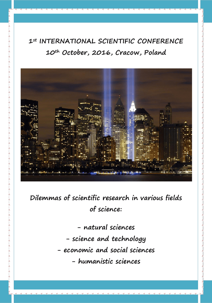 1st INTERNATIONAL SCIENTIFIC CONFERENCE 10th October, 2016, Cracow, Poland Dilemmas of scientific research in various fields of science: - natural sciences - science and technology - economic and social sciences - humanistic sciences Scientific Council Prof. Joanna Nowakowska Grunt Chairman of Scientific Council, Czestochowa University of Technology, Poland Prof. Agata Mesjasz-lech V-ce Chairman of Scientific Council, Częstochowa University of Technology, Poland Prof. Katalin Takács-György Szent István University, Hungary Prof. Shulgina Liudmyla National Technical University, Ukraine Prof. Lumír Kulhánek VŠB-Technical University of Ostrava, Czech Republic Prof. Jozef Klučka University of Zilina, Slovakia Prof. Beata Jamka Łazarski University, Poland Prof. Agnieszka Rochmińska Lodz University, Poland Dr. Eva Ivanová Alexander Dubček University of Trenčín, Slovakia Dr. Katarína Havierniková Alexander Dubček University of Trenčín, Slovakia Dr. Radomir Kaňa VŠB - Technical University of Ostrava, Czech Republic Dr. Monika Mynarzová VŠB - Technical University of Ostrava, Czech Republic Dr. Radomir Kaňa VŠB - Technical University of Ostrava, Czech Republic Dr. Sergii Vasylyk Simon Kuznets Kharkiv National University of Economics, Ukraine Dr. Justyna Malkuch-Switalska Université de Lorraine, France Dr. Tetyana Pasko Vincent Pol University in Lublin, Poland Dr. Nina Szczygieł Universidade de Aveiro, Portugal Dr. Tomasz Borowski Editor-in-Chief, World Scientific News, Poland Dr. Malgorzata Rutkowska-Podołowska Wroclaw University of Technology, Poland Dr. Irenuesz Miciuła Editor-in-Chief, Scientific Publishing House „SOPHIA”, Szczecin University, Poland Dr. Jarosław Czaja Wroclaw University of Economics, Poland Dr. Agnieszka Kurc-Lisiecka Higher School of Business in Olkusz, Poland Dr. Małgorzata Smolarek Humanitas University in Sosnowiec, Poland Dr. Jadwiga Bakonyi Humanitas University in Sosnowiec, Poland Dr. Joanna Dzieńdziora Higher School of Business in Dabrowa Gornicza, Poland Dr. Izabela Turek Czestochowa University of Technology, Poland Dr. Anna Lemańska-Majdzik Czestochowa University of Technology, Poland Dr. Małgorzata Okręglicka Czestochowa University of Technology, Poland Dr. Agnieszka Bera Wroclaw University of Economics, Poland Dr. Agnieszka Kańczukowska-Stadnik Gniezno Higher School of Millenium, Poland Dr. Monika Sipa Czestochowa University of Technology, Poland Dr. Anna Bęczkowska Gniezno Higher School of Millenium, Poland Dr. Małgorzata Hordyńska Silesian University of Technology, Poland Dr. Marika Świeszczak Lodz University, Poland Dr. Krzysztof Świeszczak Lodz University, Poland Dr. Małgrozata Rutkowska- Podołowska Wroclaw University of Technology, Poland Dr. Agnieszka Kurc-Lisiecka Higher School of Business in Olkusz, Poland Dr. Wojciech J. Janik The Elblag University of Humanities and Economy, Poland Dr. Rafał Mazur West Pomeranian University of Technology, Poland Dr. Agnieszka Malkowska Szczecin University, Poland Dr. Arkadiusz Malkowski West Pomeranian University of Technology, Poland Dr. Piotr Nowaczyk West Pomeranian University of Technology, Poland Dr. Dariusz Kotarski Koszalin University of Technology, Poland Dr. Michał Czuba University of Silesia In Katowice, Poland Dr. Joanna Łodziana-Grabowska Bielska Higher School, Poland Dr. Krystyna Serafin Katowice University of Economics, Poland Dr. Błażej Kmieciak Medical University of Lodz, Poland Dr. Monika Michalska Zielona Gora University, Poland Dr. Paulina Borysewicz Poland Dr. Andrzej Łączak State Higher Vocational School in Sulechow, Poland Dr. Marzena Kruk Maria Curie-Skłodowska University in Lublin, Poland Dr. Jacek Doskocz Claster B + R & I, Poland Dr. Piotr Kardasz Claster B + R & I, Poland Organizing Committee Dr. Ireneusz Miciuła Chairman of Organizational Advice, Szczecin University, Poland MSc. Anna Kowalczyk Czestochowa University of Technology, Poland MSc. Anna Nurzyńska Siedlce University of Natural Sciences and Humanities, Poland MSc. Adam Sulich Wroclaw University of Technology, Poland MSc. Henryk Wojtaszek Czestochowa University of Technology, Poland MSc. Żaneta Nejman Czestochowa University of Technology, Poland Organizer Scientific Publishing SOPHIA, Poland Training and Scientific Center SOPHIA, Poland Institute of Finance and Management of Innovations, Poland Partners Institute of Management and Economics, Humanitas University, Faculty of Applied Sciences in Cracow, Social Academy of Sciences, International Journal of the World Scientific News Patronage Cluster Development Research and Innovation Creative Business Cluster Association of Doctoral POLDOC Silesian Marketing Association Cracow Association of Speakers Conference venue University of Social Sciences in Cracow Faculty of Applied Social Sciences 14 Smolensk Street, 31-112 Cracow, Poland